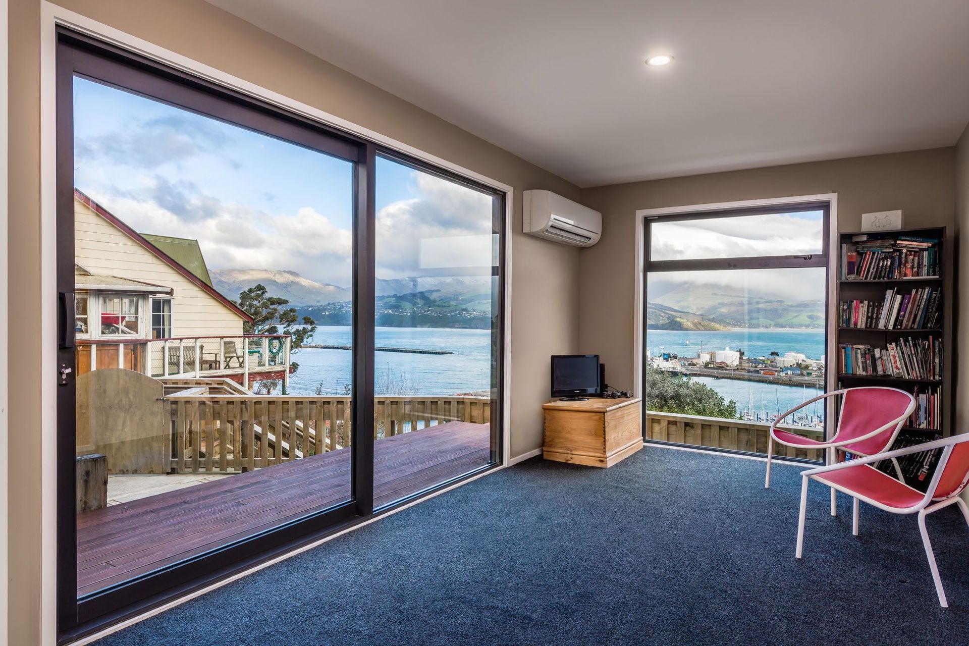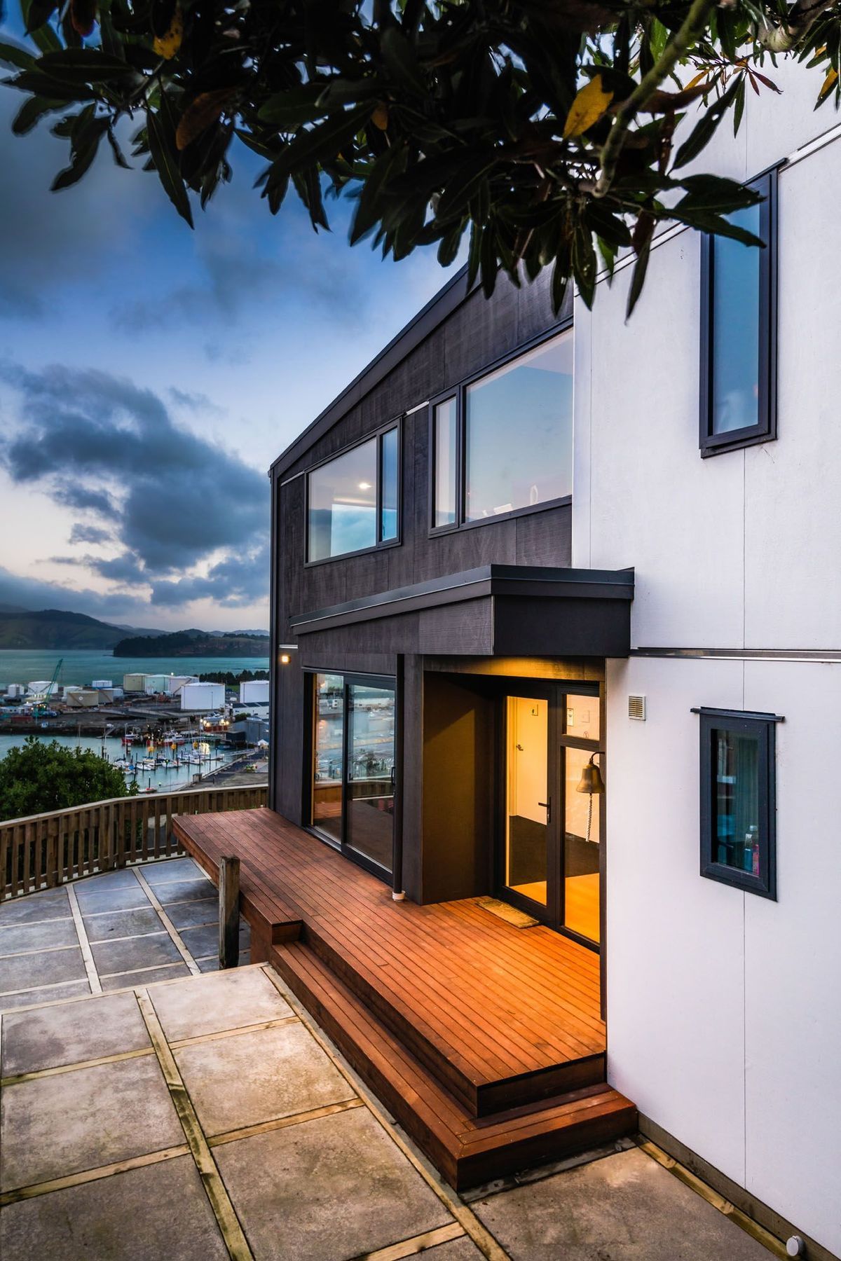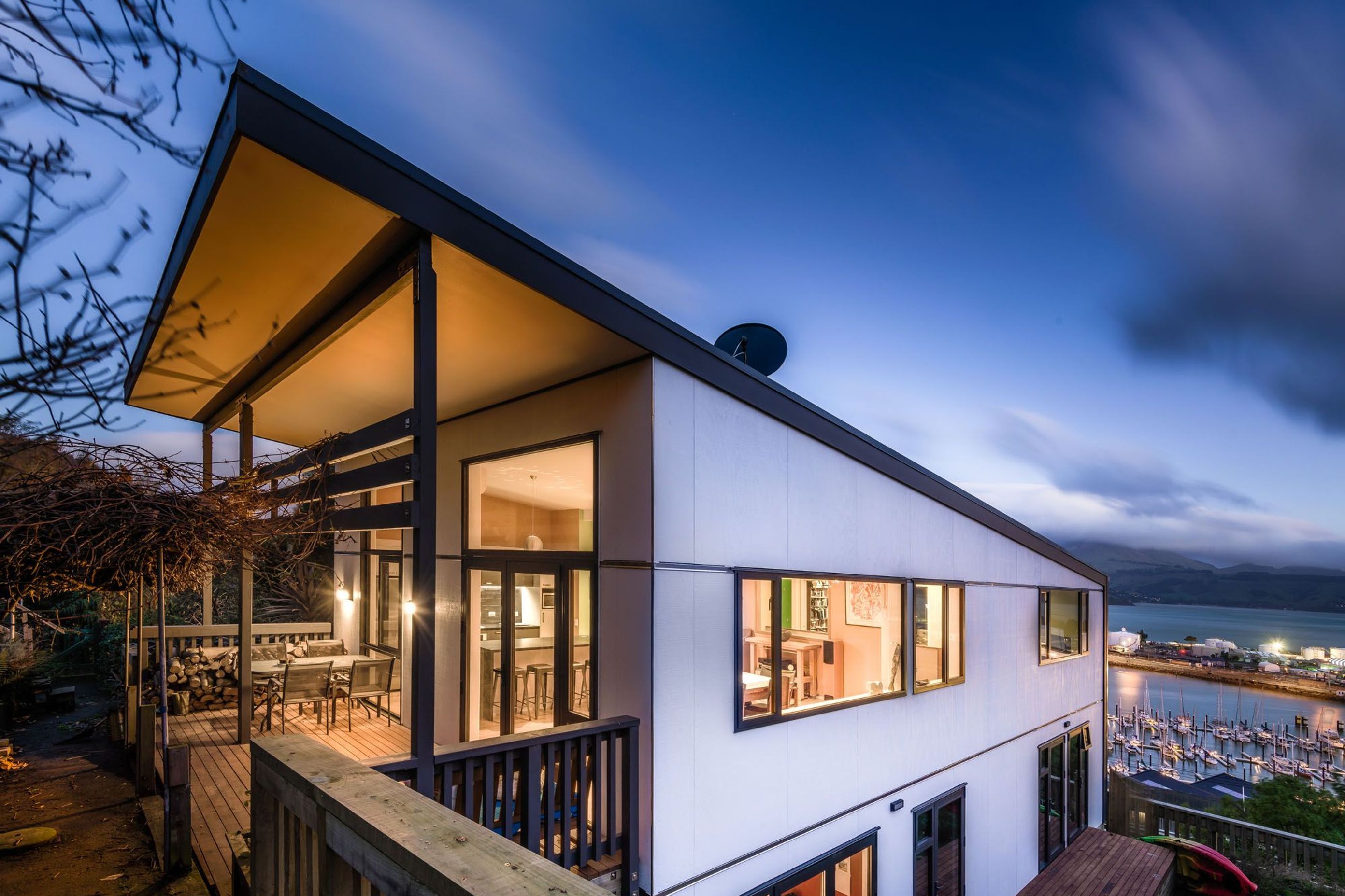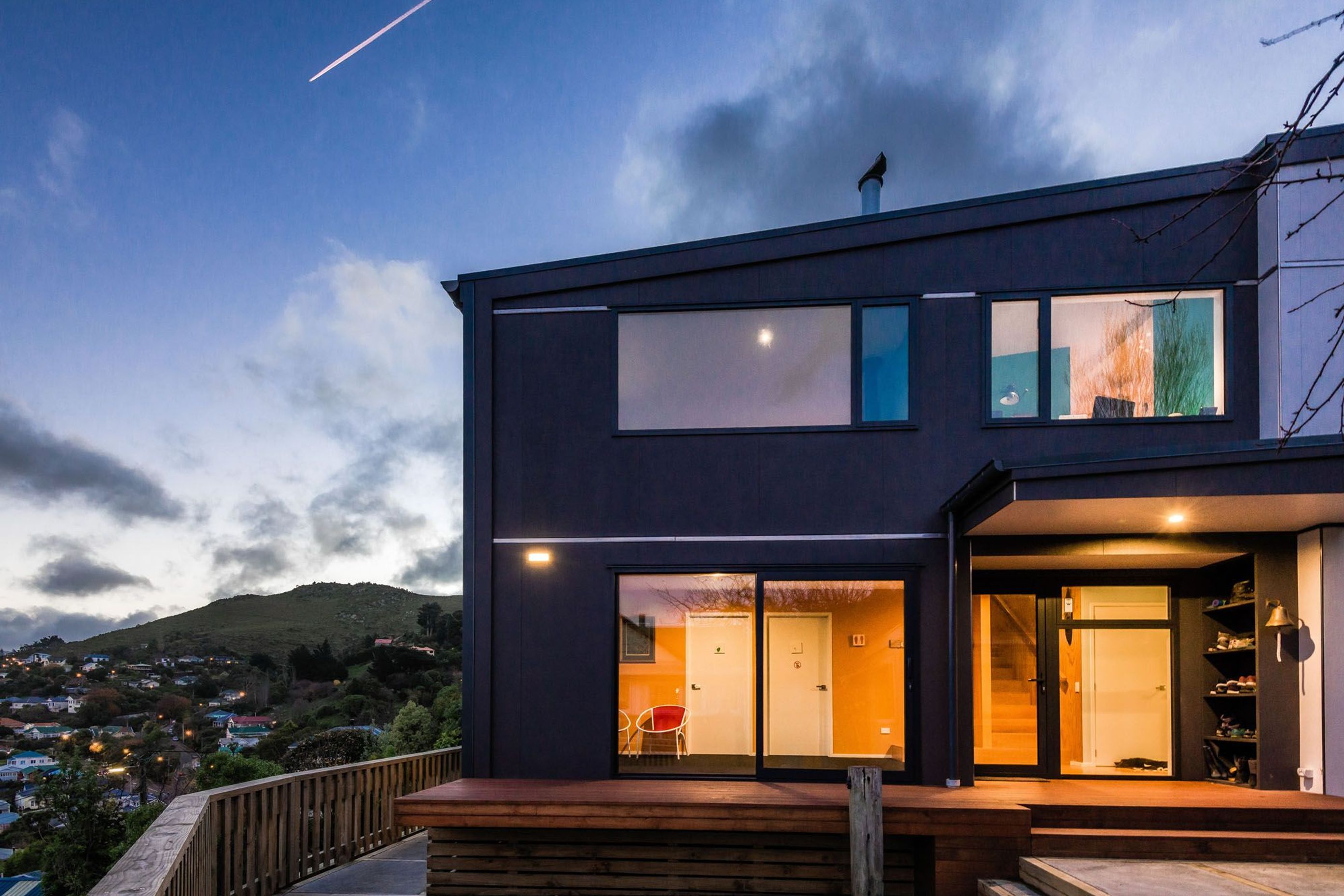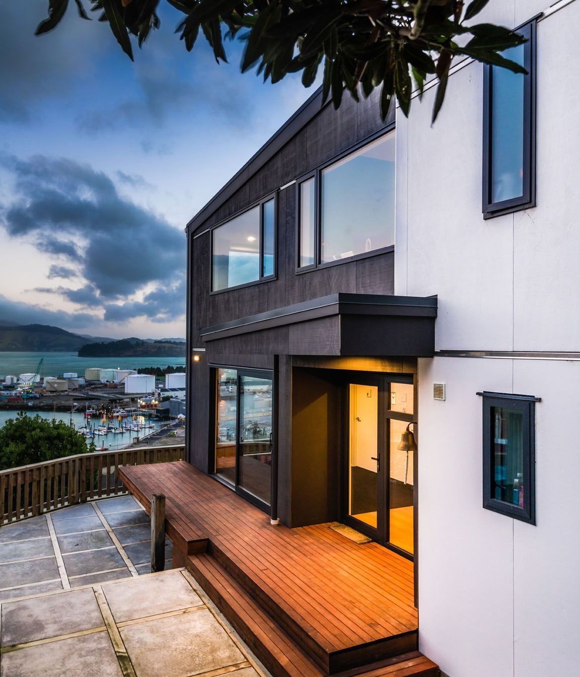 ArchiPro Project Summary - A contemporary two-storey family home in Lyttelton, designed to maximize sunlight and stunning harbour views while providing warmth and protection from cold winds, featuring flexible living spaces and a welcoming children's playroom.