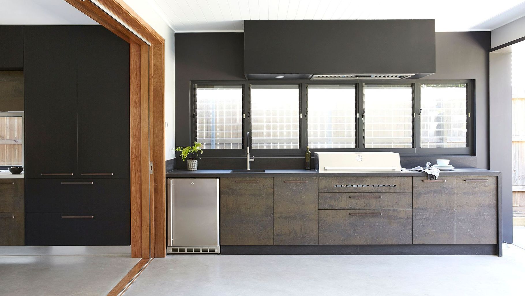 ArchiPro Project Summary - A sophisticated blend of dark and moody color palettes, featuring Neolith-clad kitchen doors and outdoor spaces, with cohesive finishes extending to the laundry area.