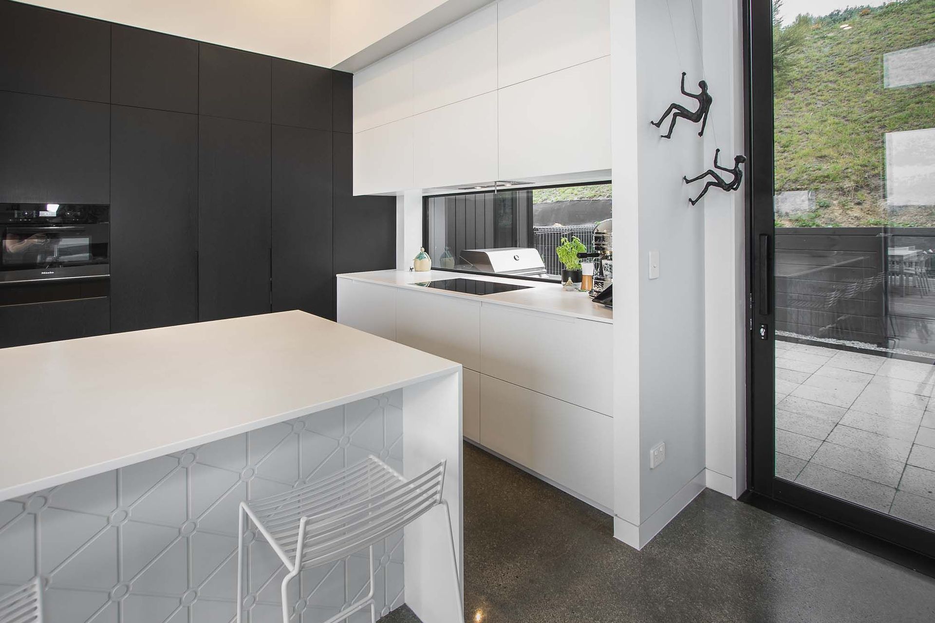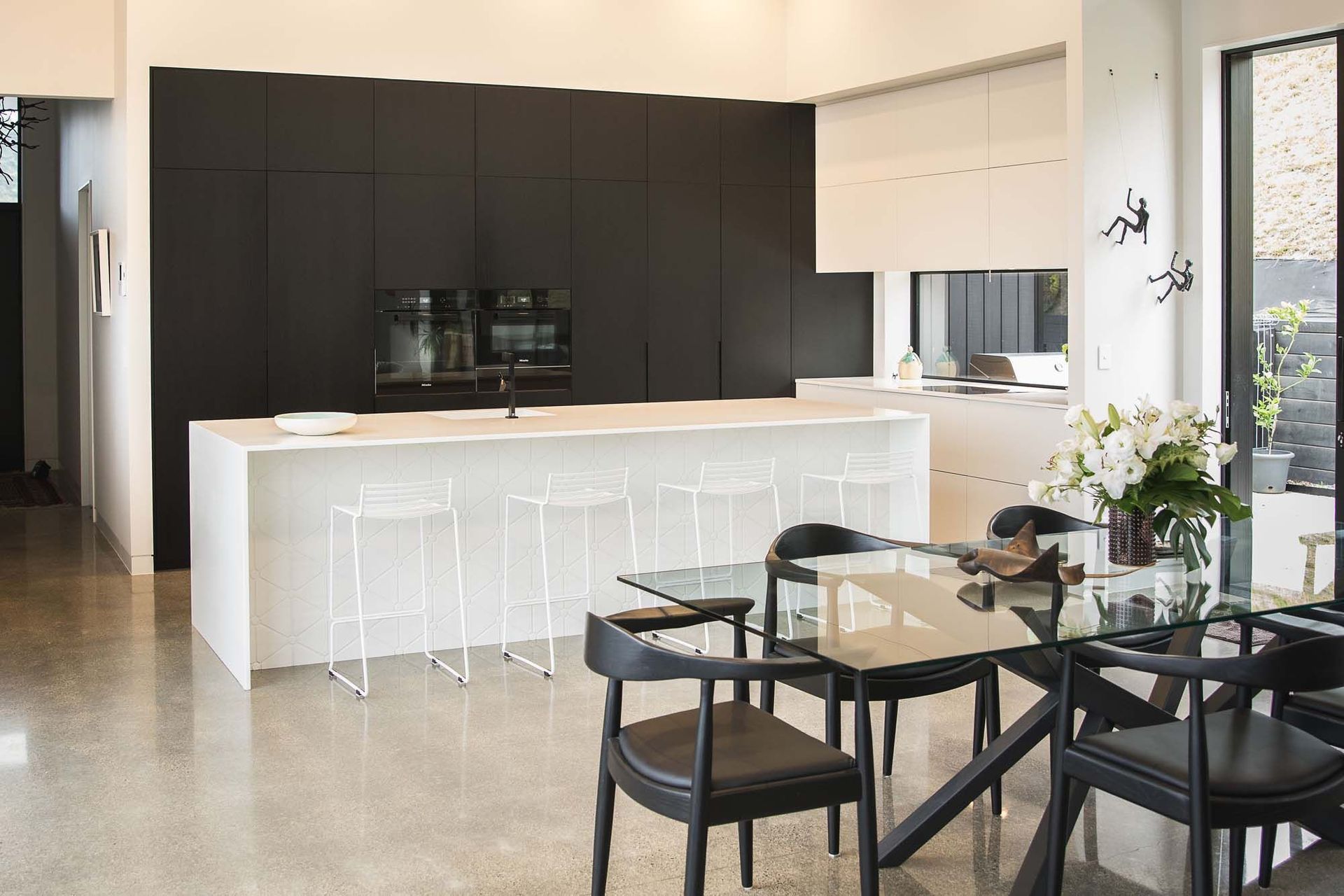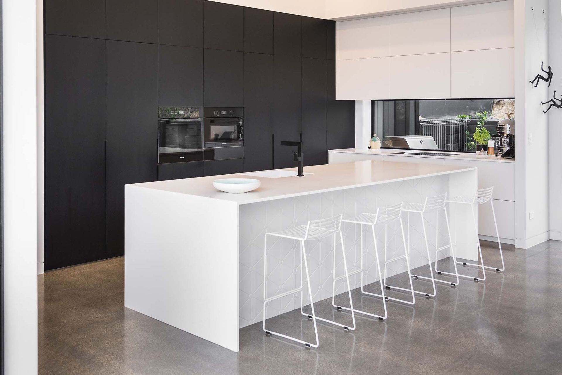 ArchiPro Project Summary - A stylish kitchen designed for entertaining, featuring a central island with integrated charging station, seamless joinery, and a striking contrast between dark cabinetry and a light island, all enhanced by natural light from a window splashback.