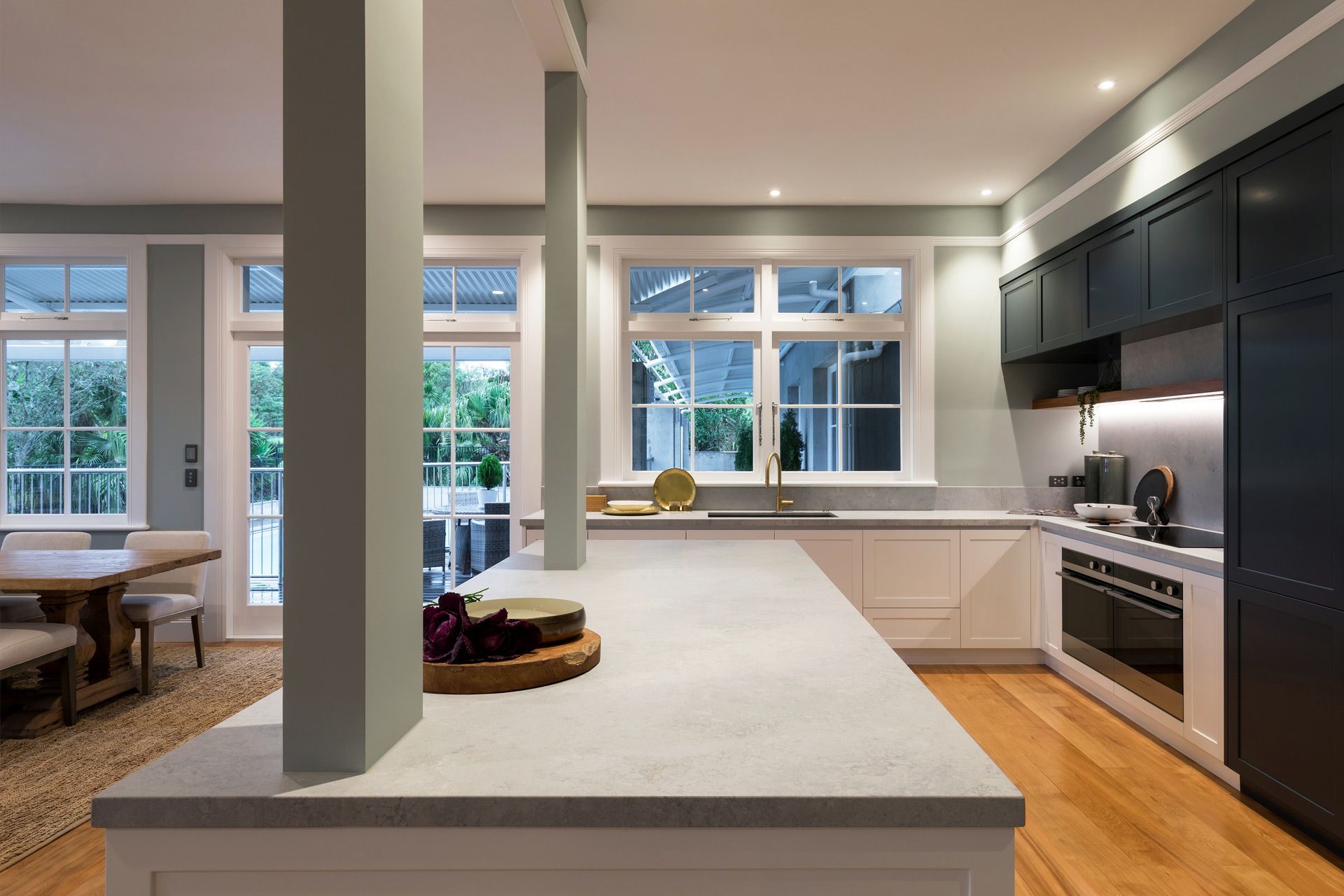 ArchiPro Project Summary - A refined kitchen design by Wayne Church, featuring traditional Shaker fronts, hardwearing polyurethane finishes, and top-of-the-line Fisher and Paykel appliances, seamlessly integrated into a grand Dairy Flat home.