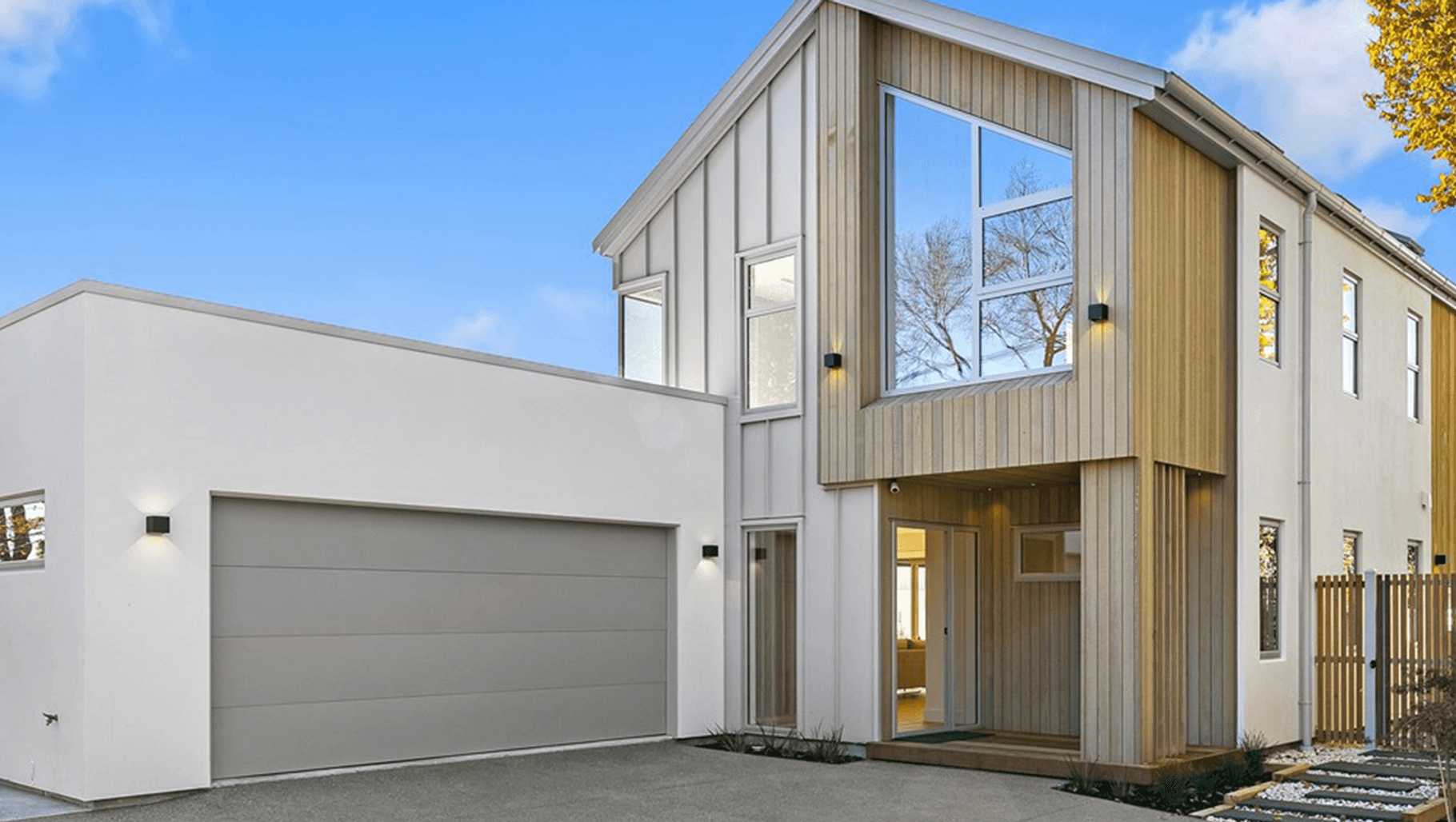 ArchiPro Project Summary - Award-winning two-story showhome in Papanui, Christchurch, featuring a Flat Panel Smooth Sectional Door in Colorsteel® Sandstone Grey, blending contemporary design with practicality for modern family living.