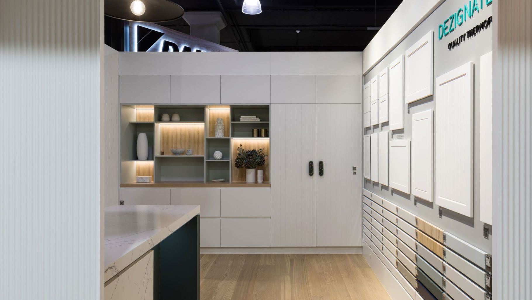 ArchiPro Project Summary - Dezignatek Showroom showcases innovative door profiles and a diverse thermoform vinyl colour range, designed by Melanie Sa'u to optimize a compact 18 sq m space with distinct feature areas, enhancing the experience for architects and designers.