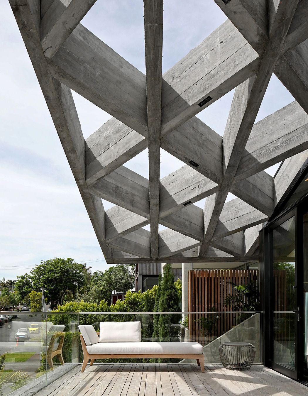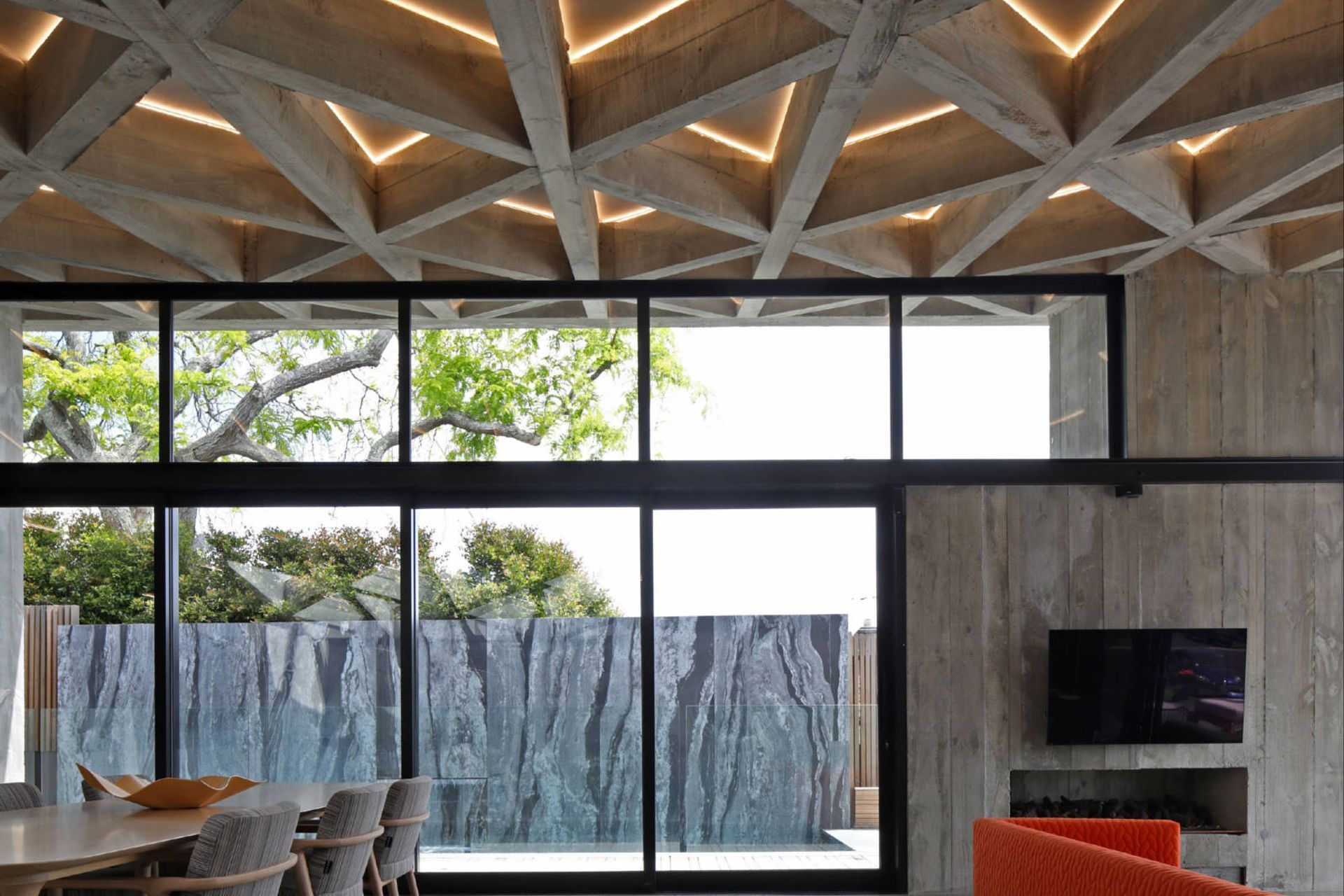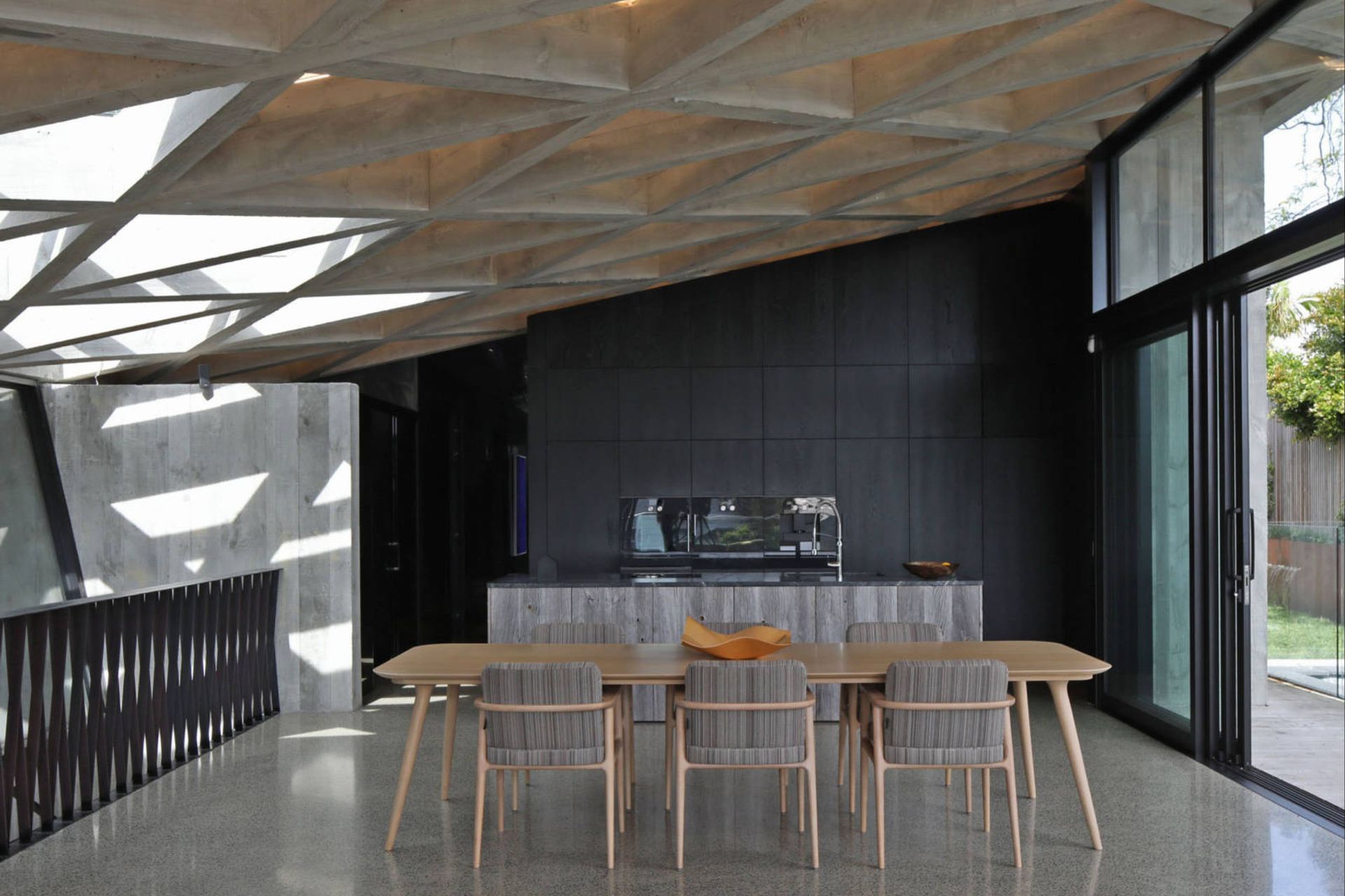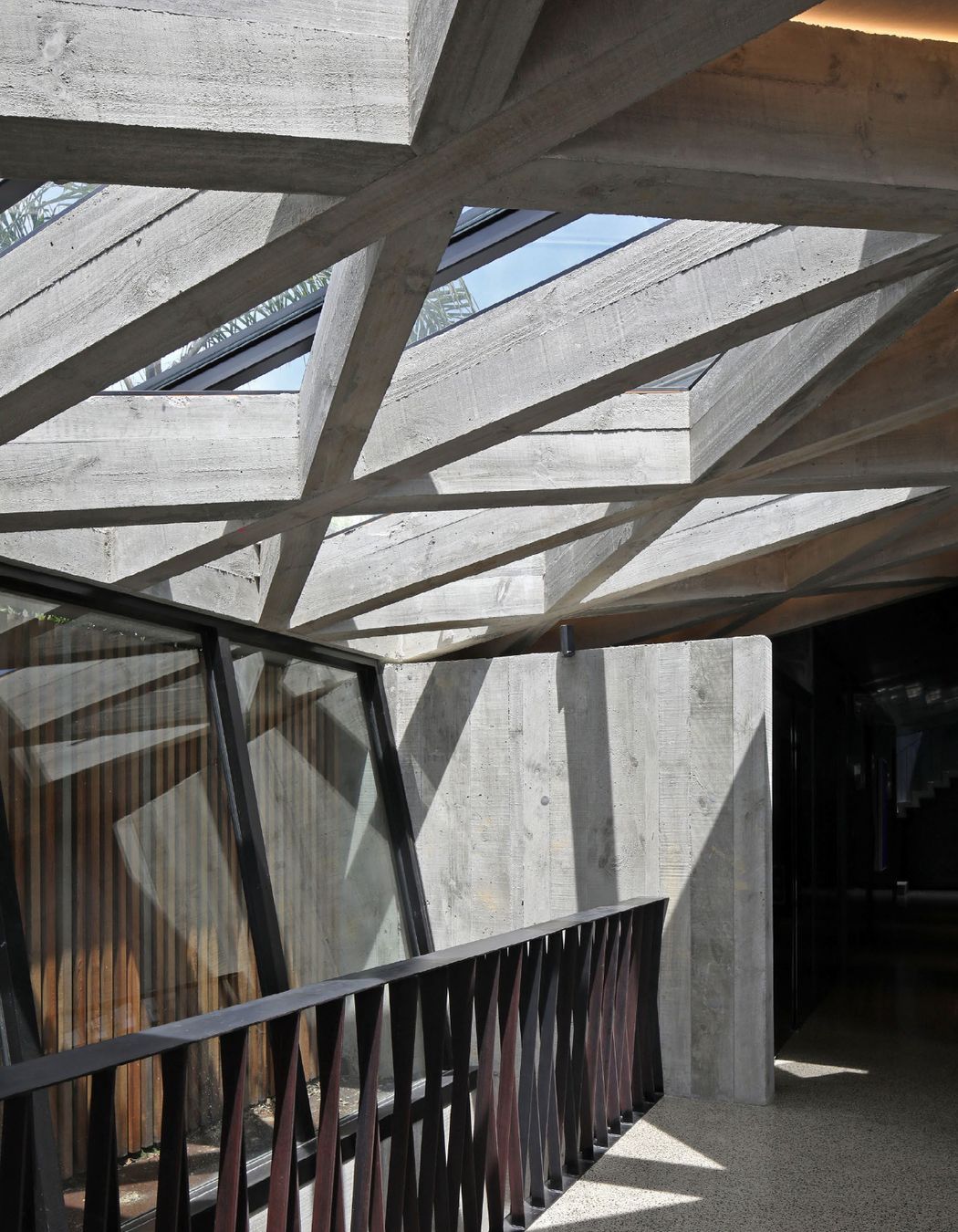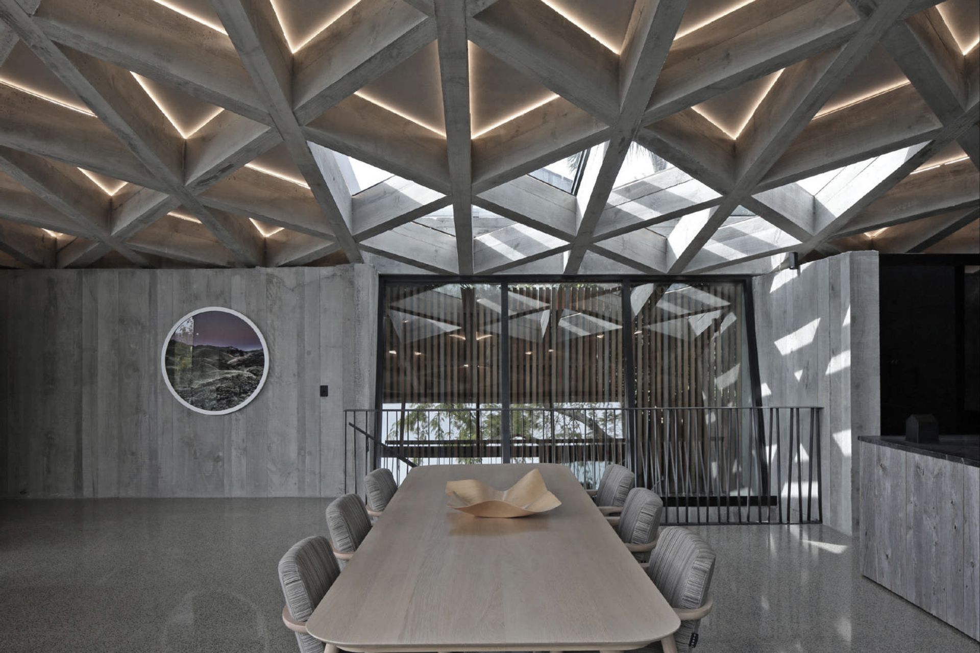 ArchiPro Project Summary - A sculptural exploration of in-situ concrete featuring a striking diagrid roof, this award-winning house harmoniously blends raw materials and natural light, creating a unique living space that celebrates the beauty of its construction.