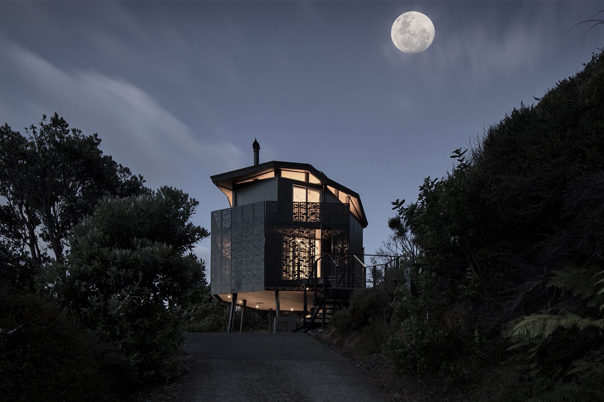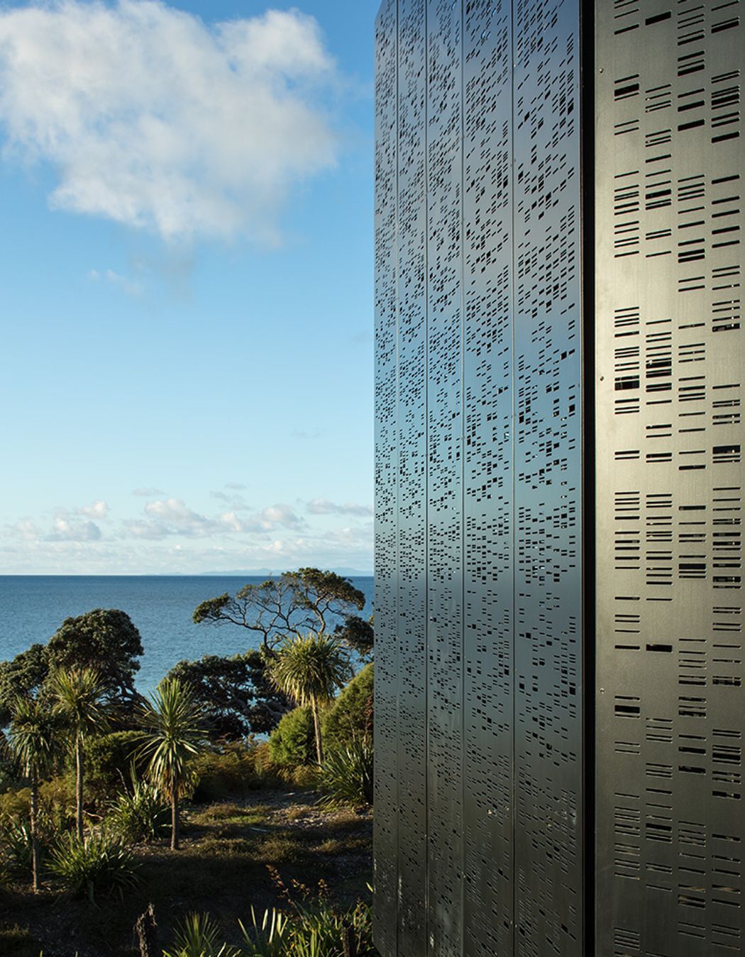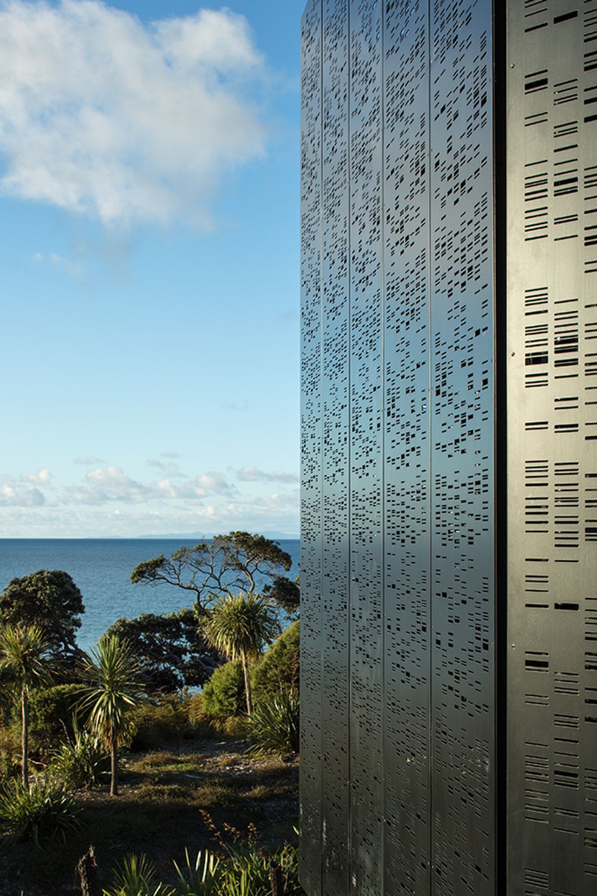 ArchiPro Project Summary - A sculptural retreat at Otama Beach, the DNA House features innovative bi-folding perforated metal screens inspired by the family's DNA, seamlessly blending indoor and outdoor spaces while offering stunning views and a unique connection to nature.