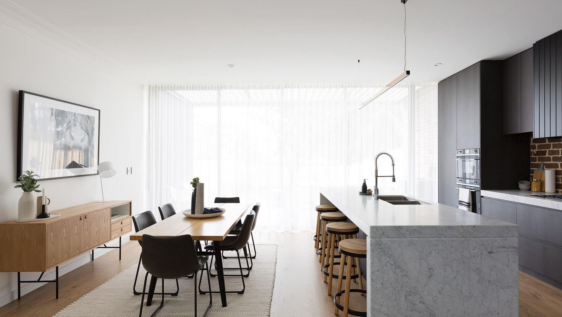 ArchiPro Project Summary - Luxury contemporary dual occupancy home in Drummoyne, completed in 2018, featuring four bedrooms, a study, open-plan living, high ceilings, custom joinery, and premium finishes including Carrara stone and European appliances.