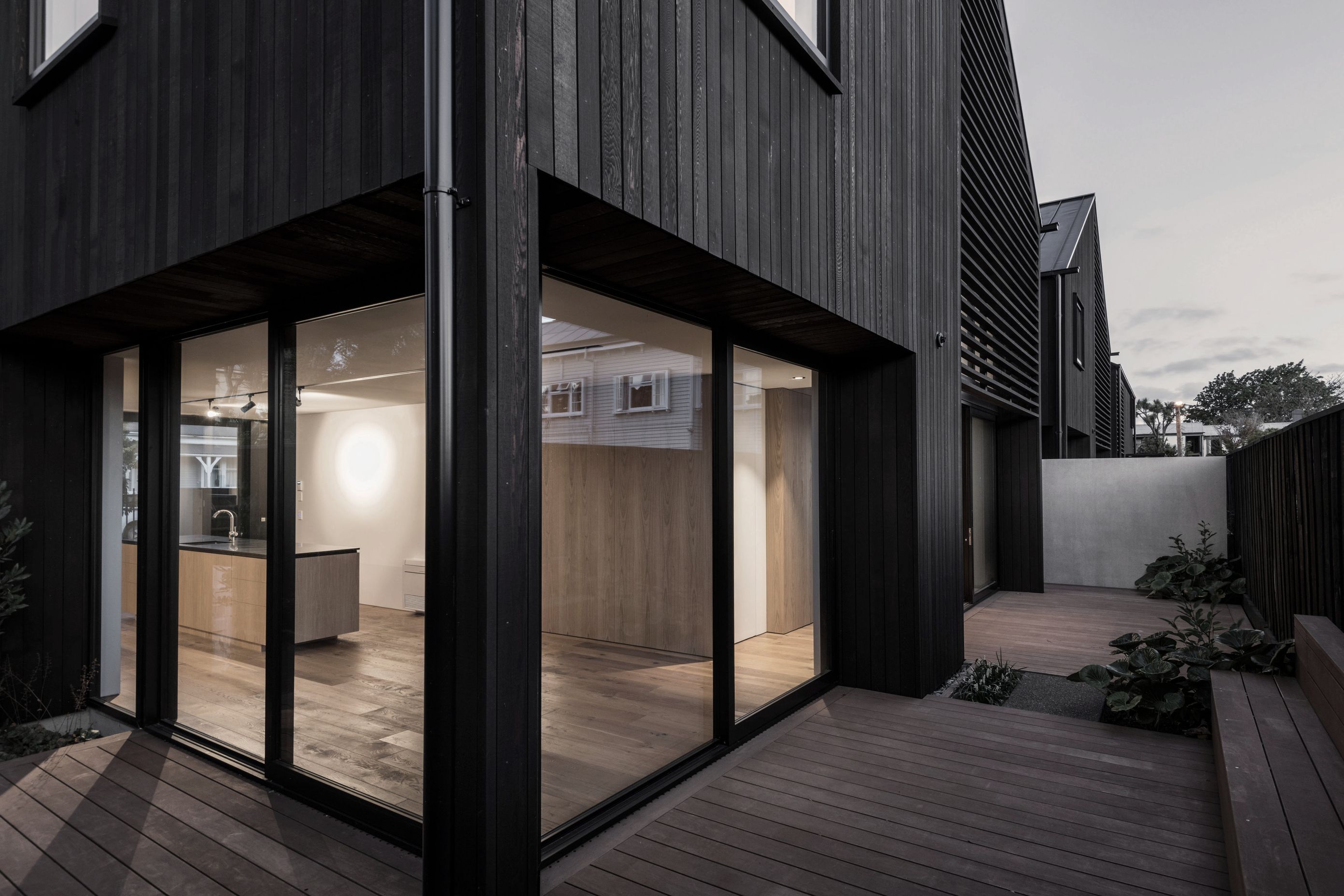 ArchiPro Project Summary - Three contemporary townhouses in Central Christchurch, featuring low pitched gable roofs, playful window proportions, and thoughtfully designed interiors that connect to outdoor courtyards, embodying a modern interpretation of the Christchurch Style.