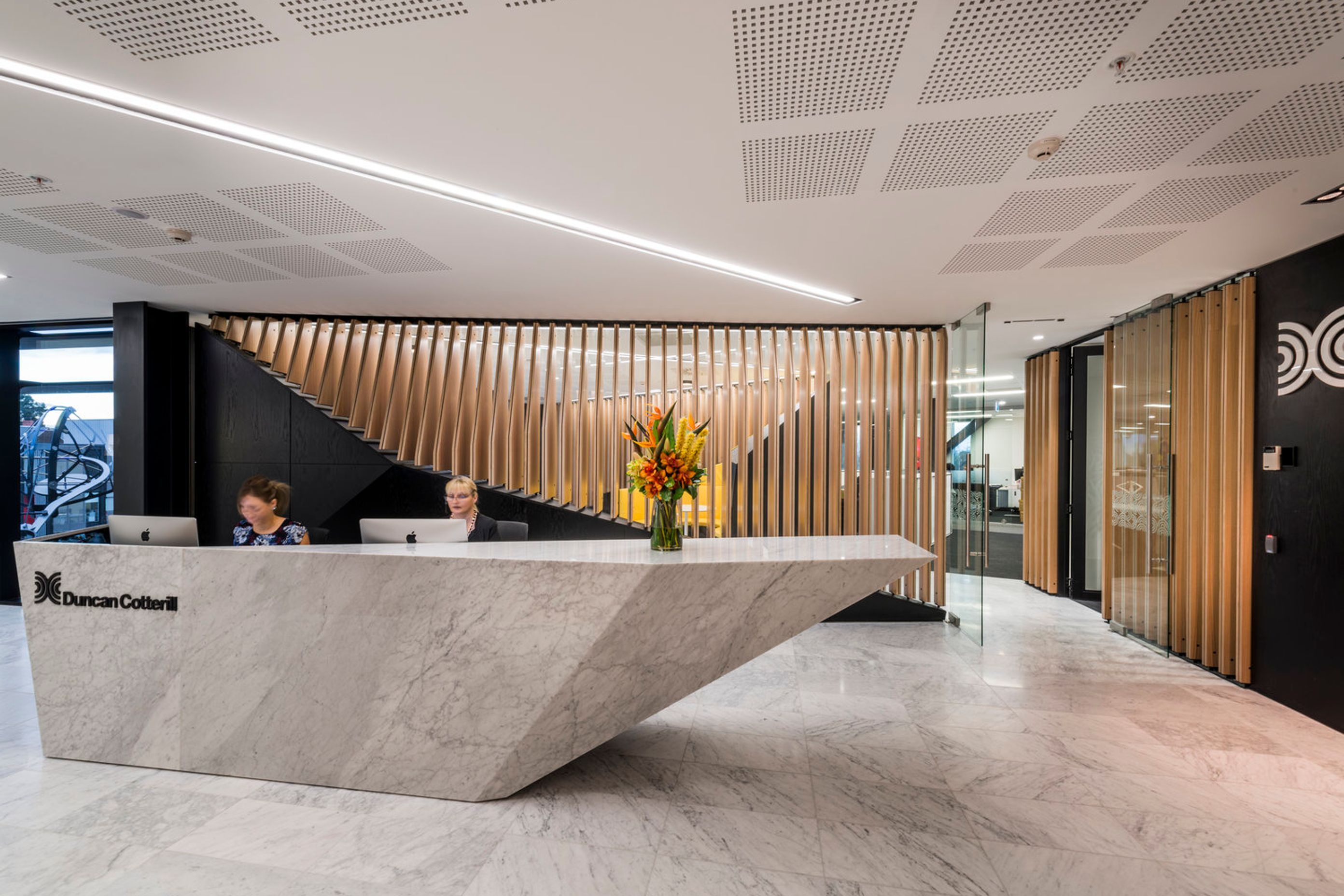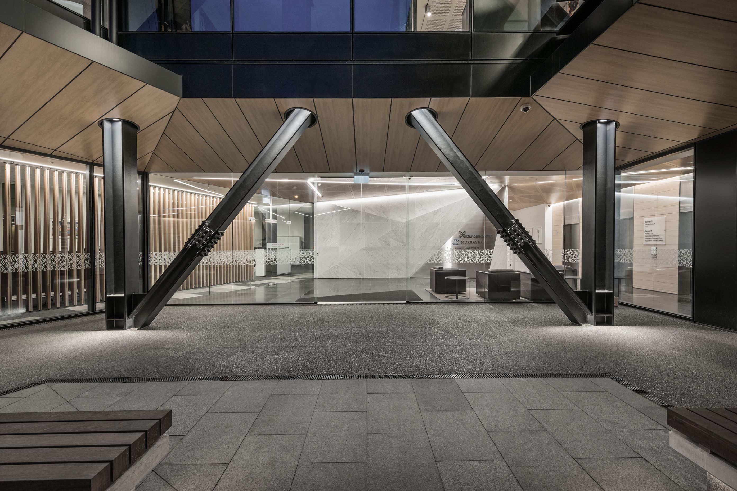 ArchiPro Project Summary - Duncan Cotterill Plaza: A modern redevelopment in Christchurch featuring a basement car park, retail and hospitality spaces, and office tenancies, designed to create a people-focused urban environment with green spaces and a sheltered courtyard.