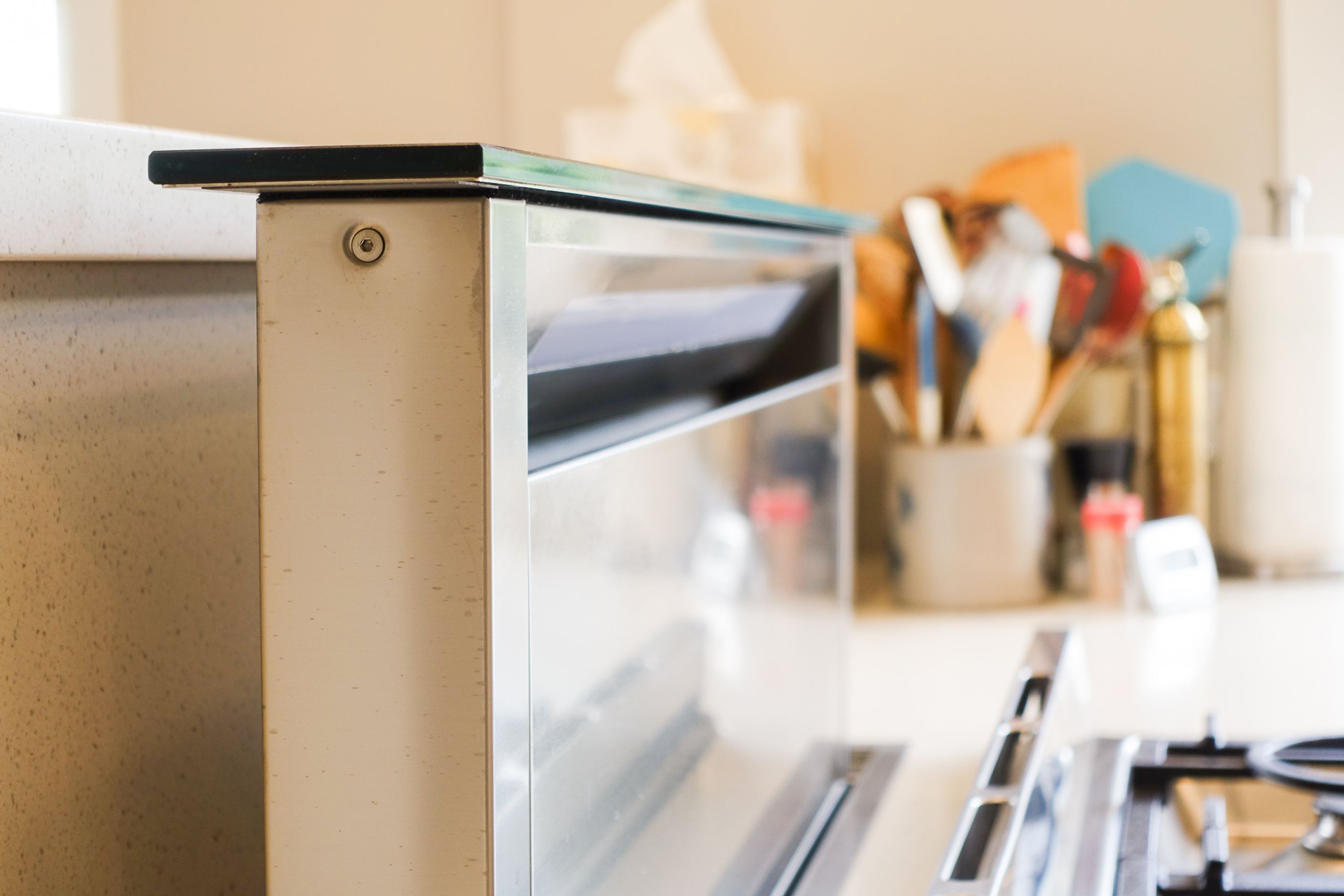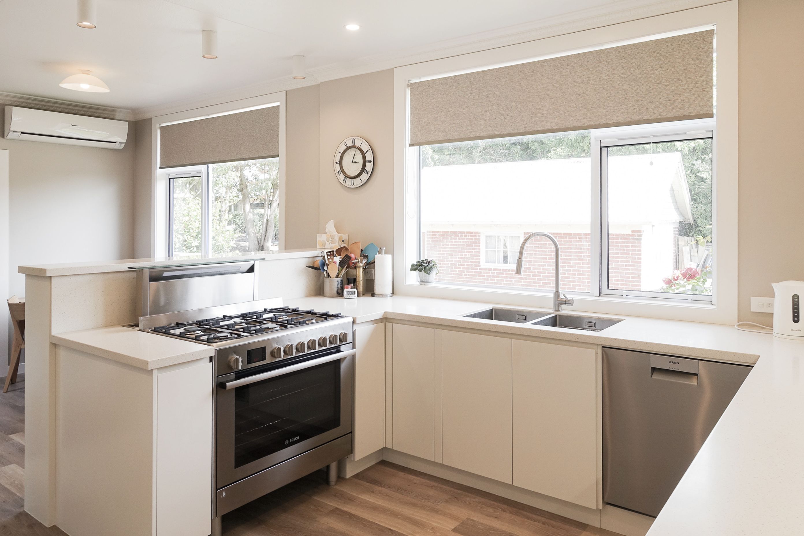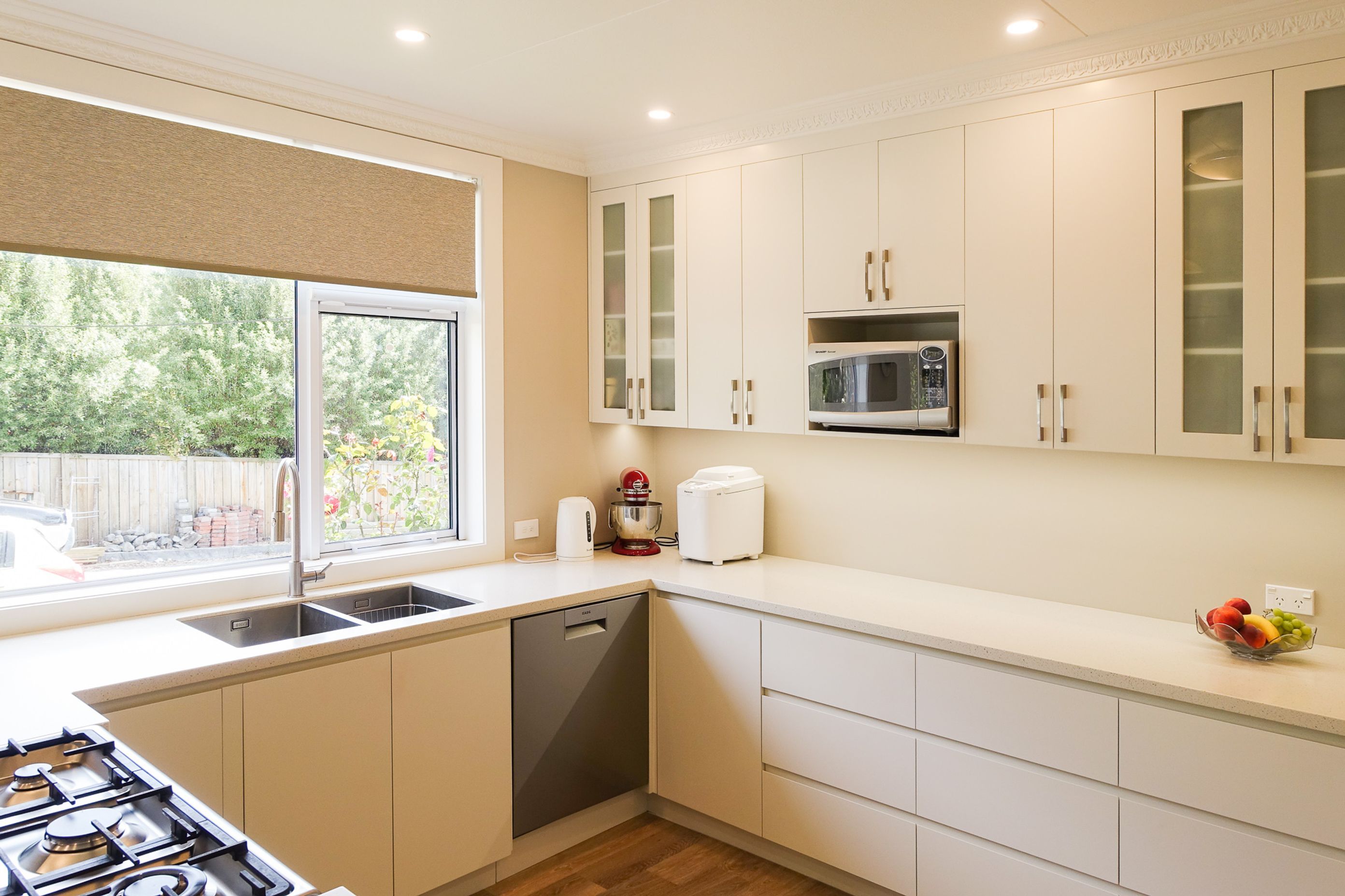 ArchiPro Project Summary - A space-efficient kitchen design featuring painted MDF cabinetry and TriStone bench tops, optimized for storage and functionality without a scullery, showcasing a sleek, handle-less drawer design for a clean aesthetic.