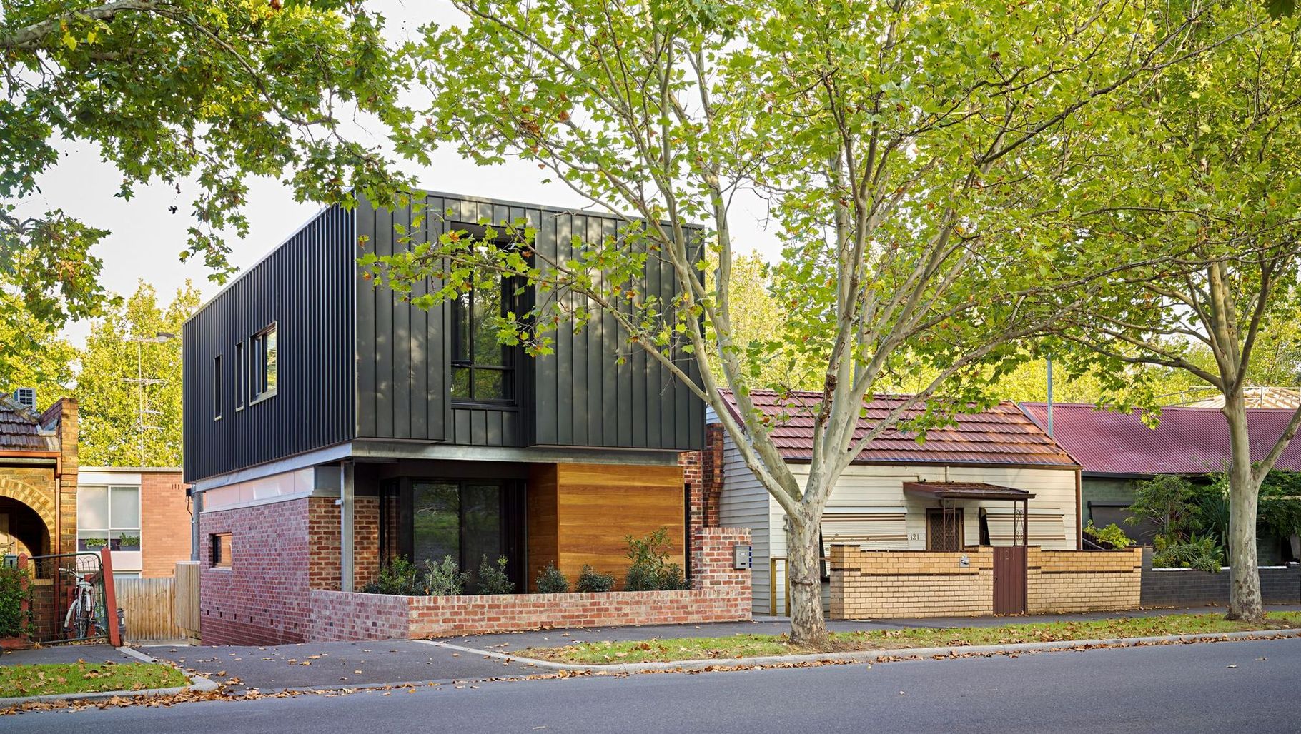 ArchiPro Project Summary - The Eastwood Street project features charming cottages with brickwork and composite materials, creating a warm atmosphere in a serene residential area.