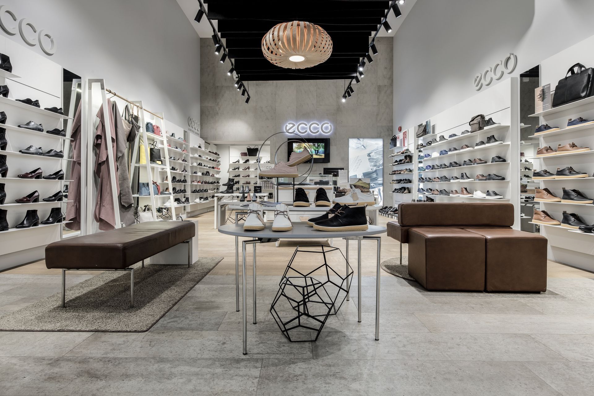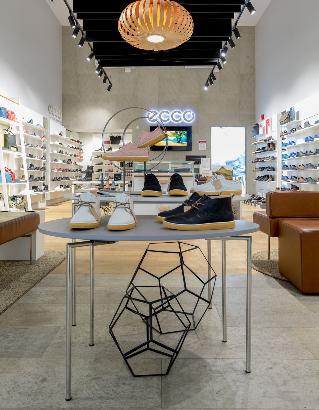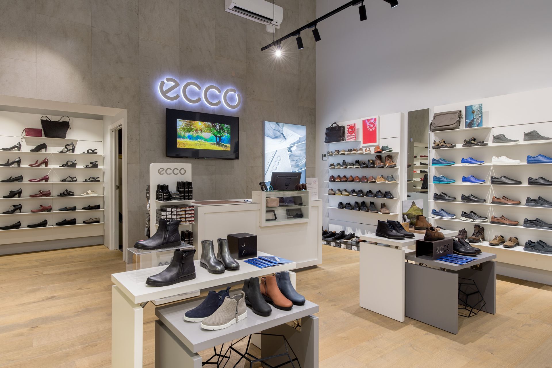 ArchiPro Project Summary - The Ecco project features a modern shoe store design with innovative shelving and display cases, enhancing the shopping experience.