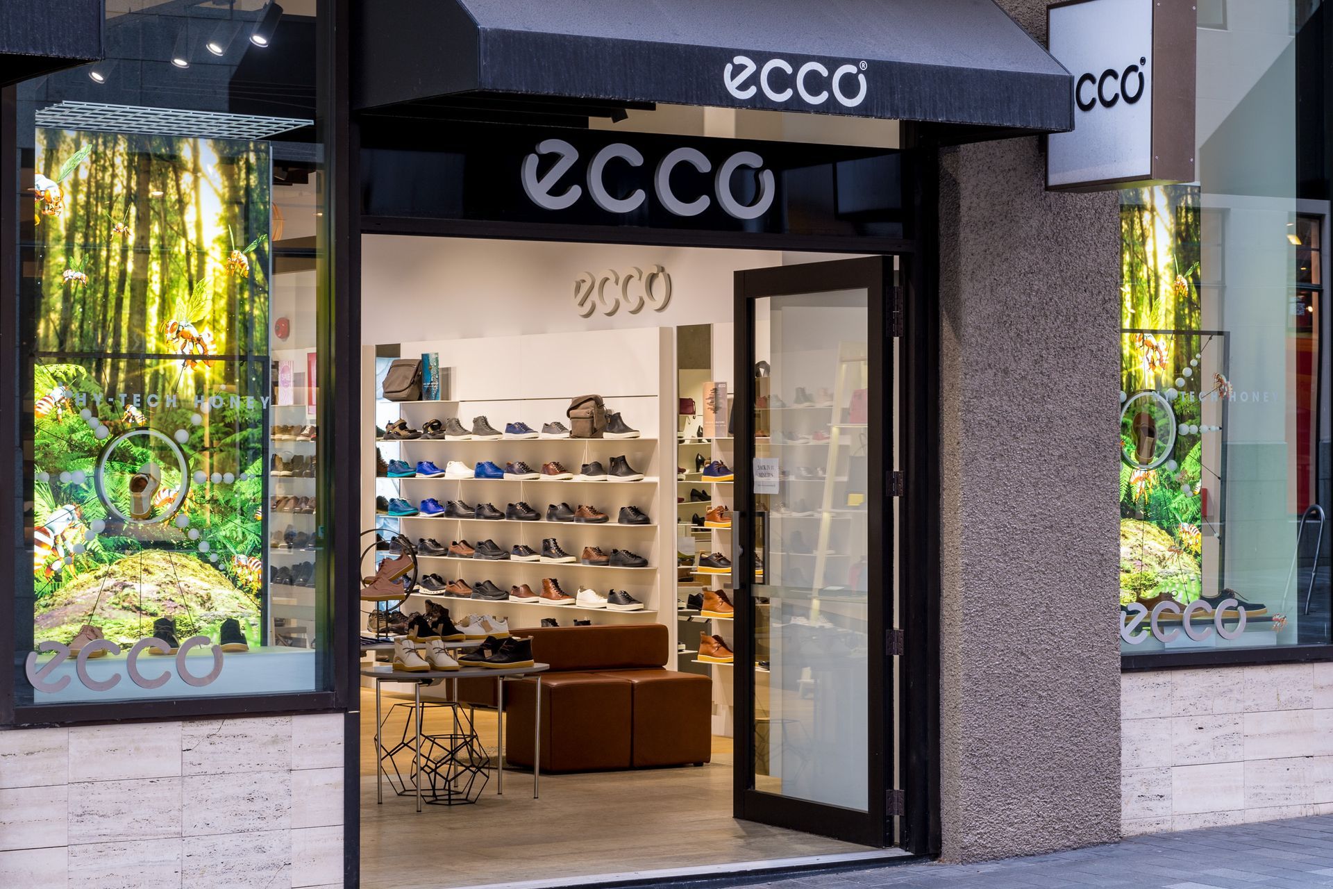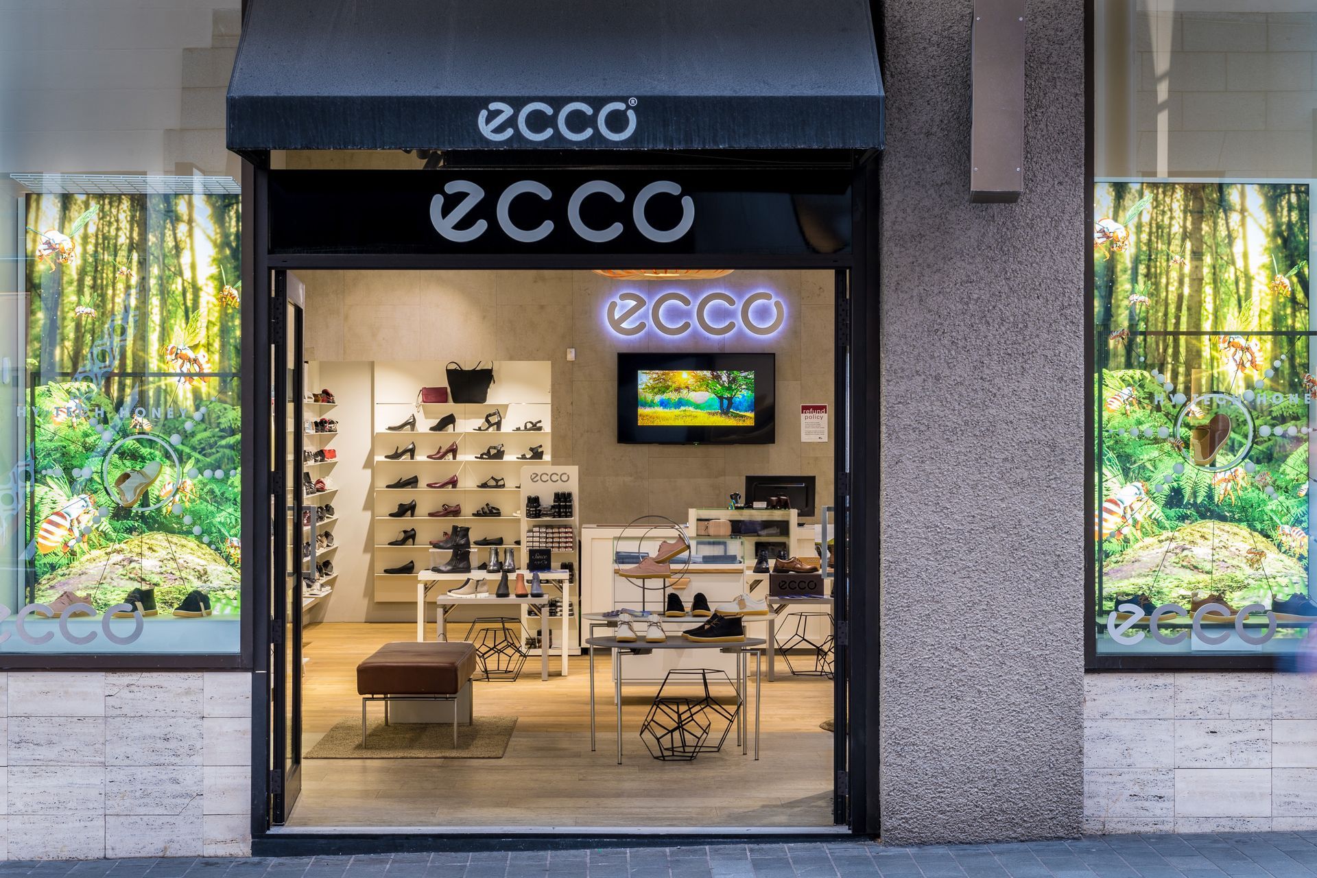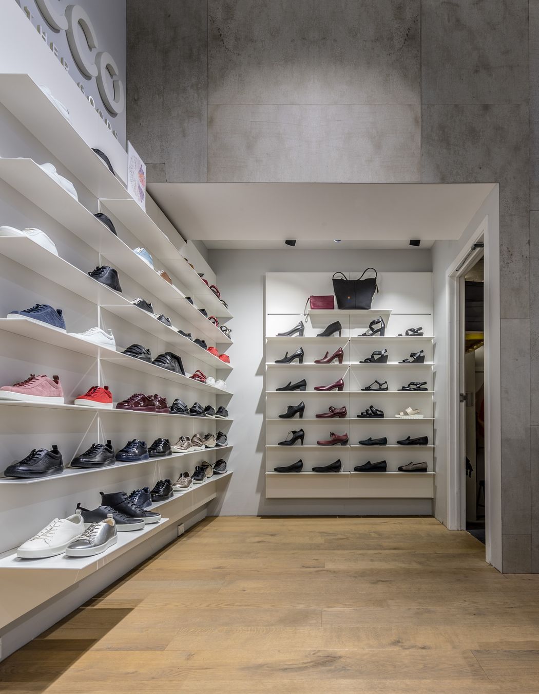ArchiPro Project Summary - The Ecco project features a modern shoe store design with innovative shelving and display cases, enhancing the shopping experience.