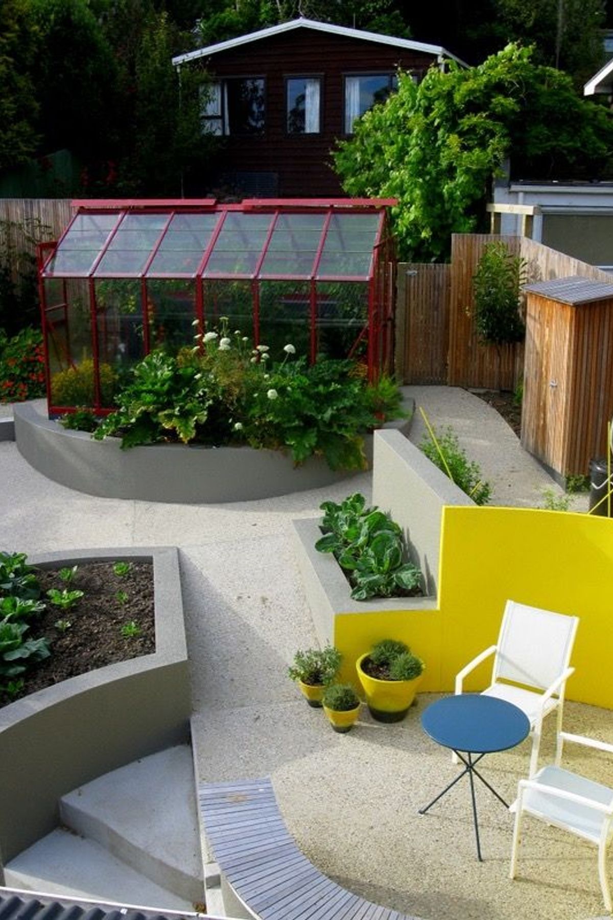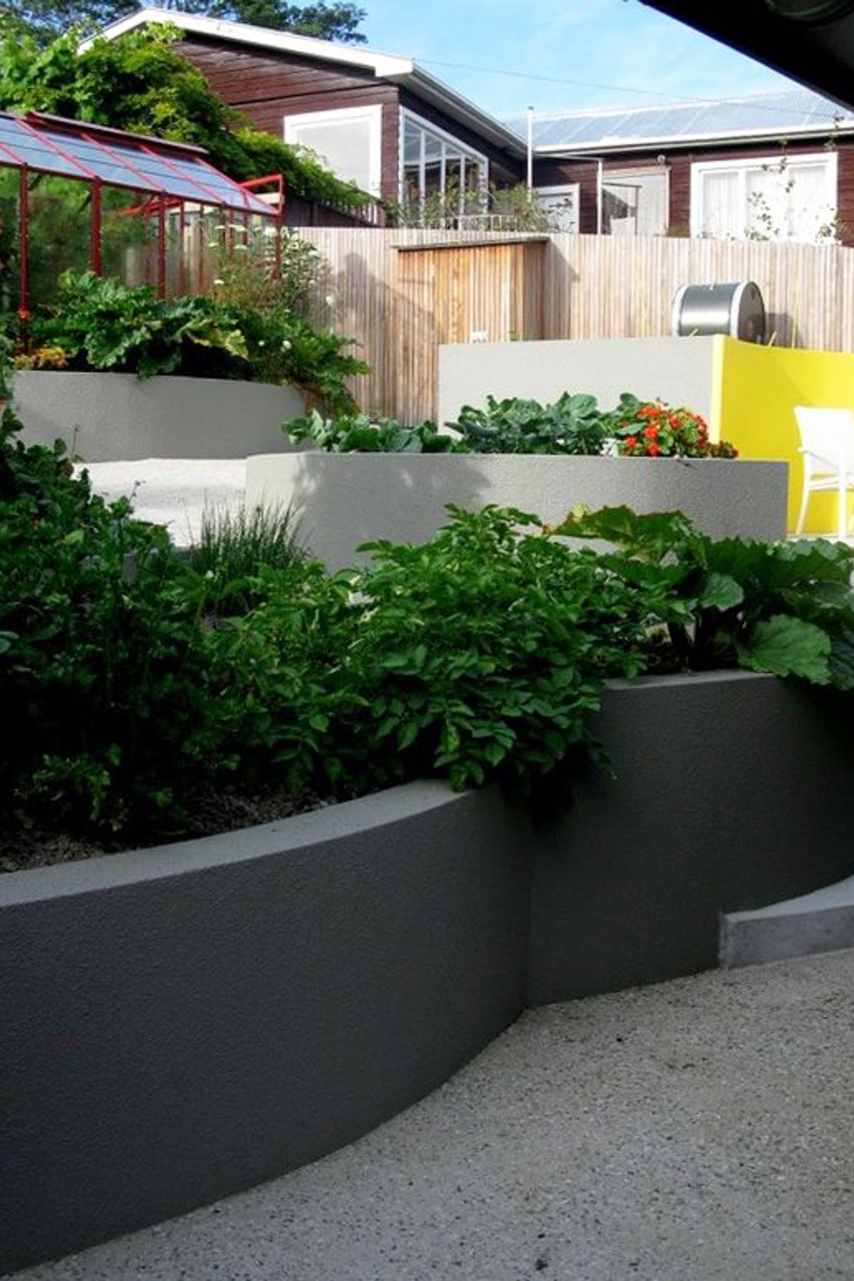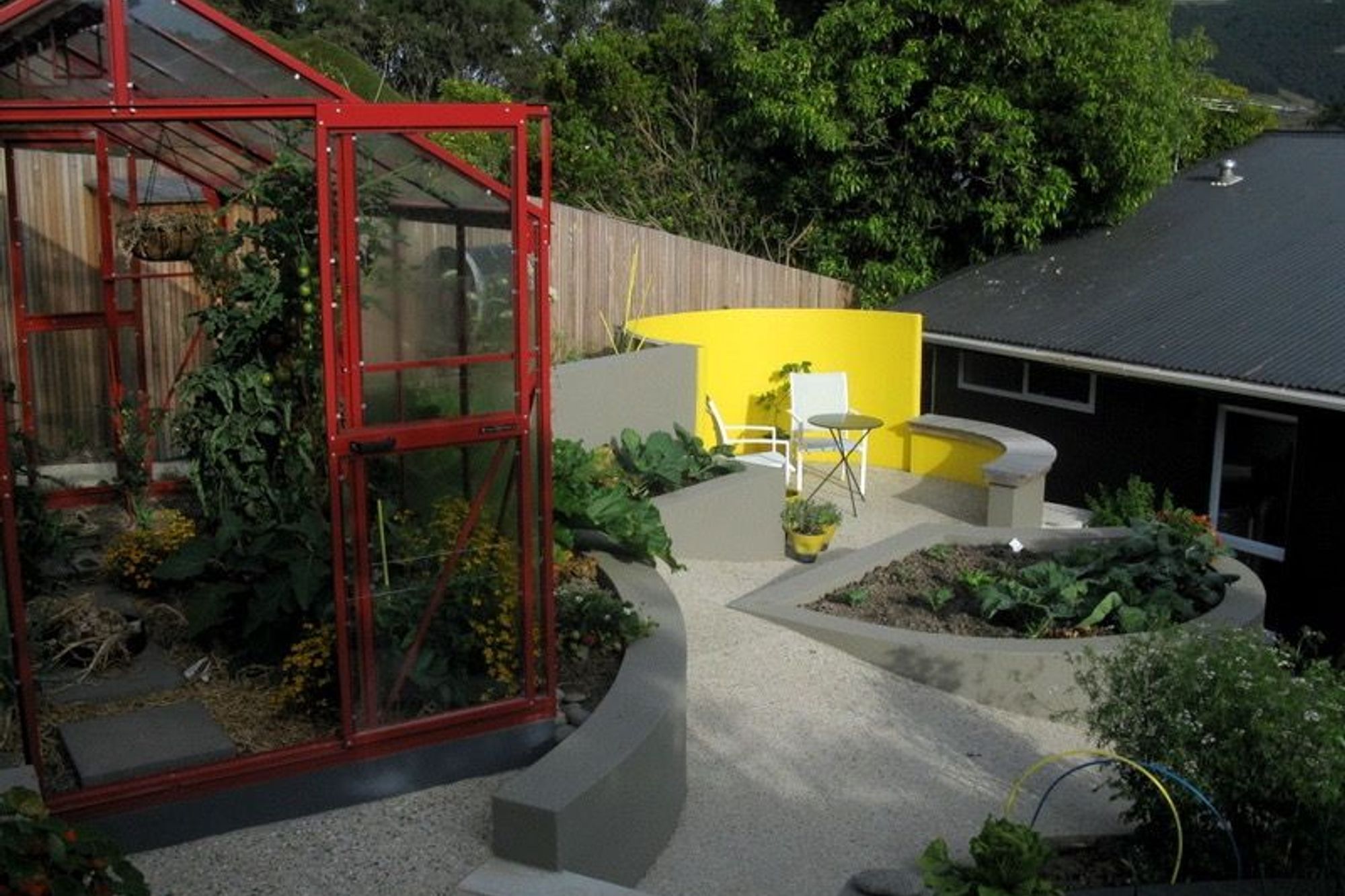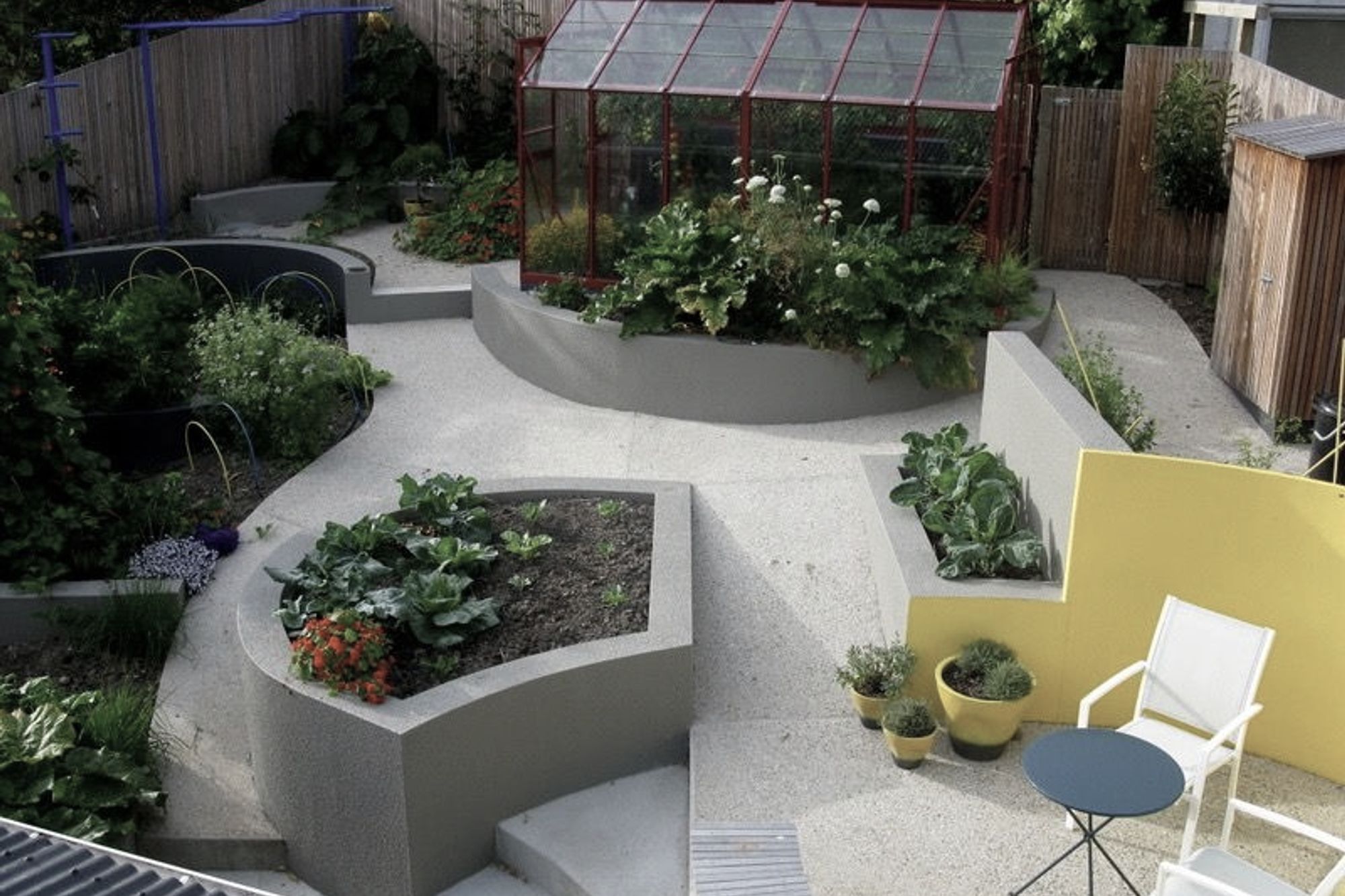 ArchiPro Project Summary - Innovative edible garden design featuring sculptural concrete walls and paths, vibrant color accents, and accessible ramped access on a steep slope, creating a functional and engaging kitchen garden space.
