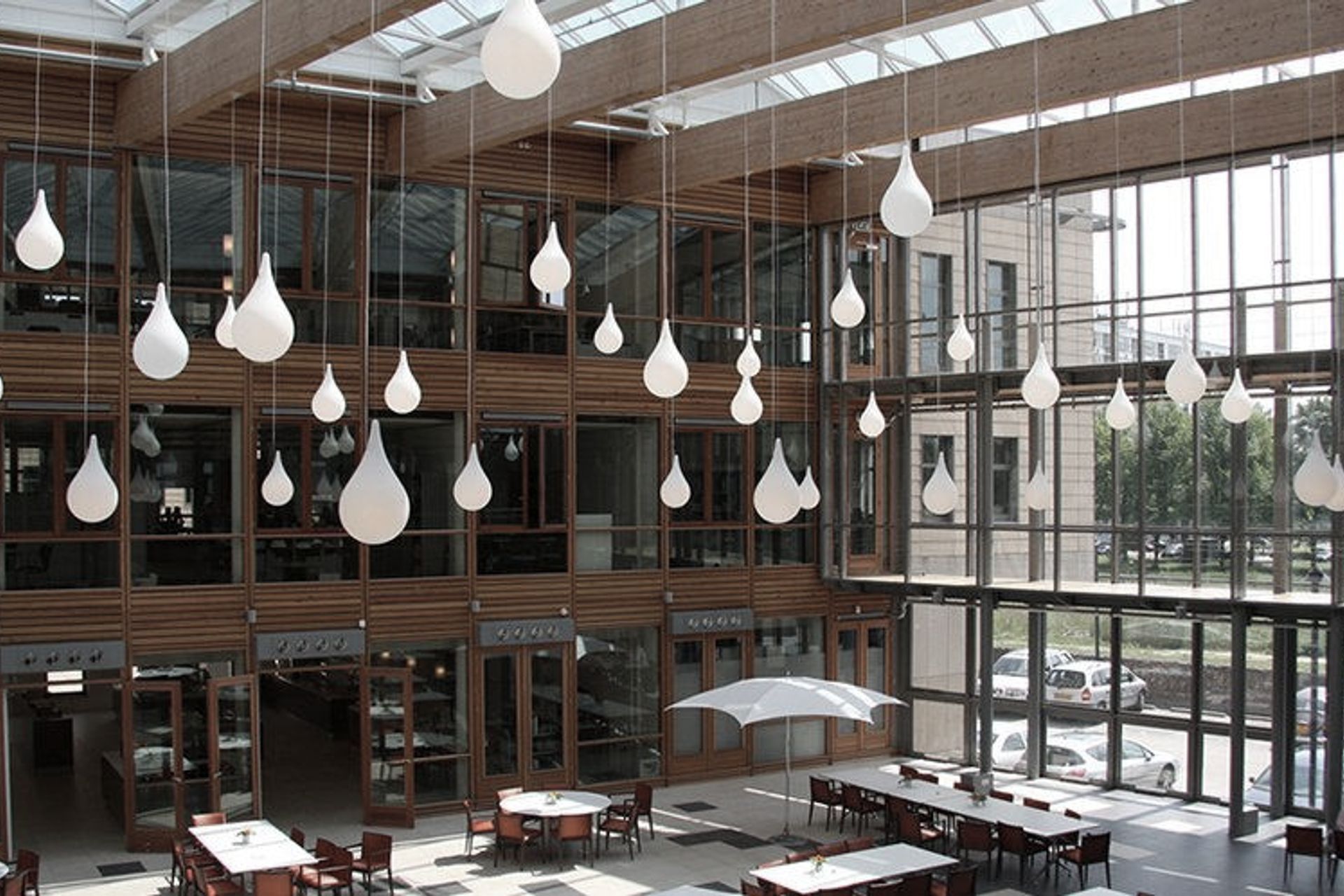 ArchiPro Project Summary - The Eigen Haard HQ lobby features a stunning arrangement of drop 2 luminaires from next's liquid light series, creating an airy atmosphere that enhances the open plaza feel, with illuminated drops that appear to float, cascade, and blend seamlessly into the space.