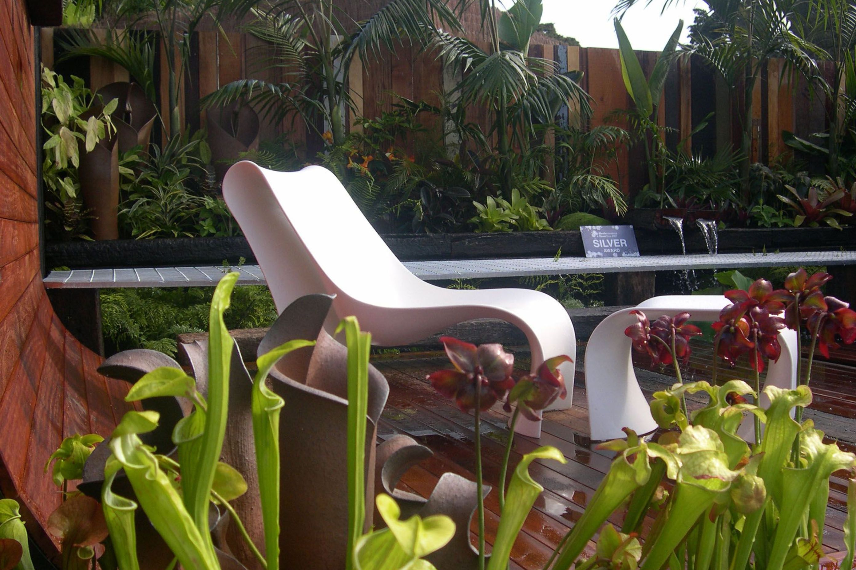 ArchiPro Project Summary - A tropical garden featuring a floating deck that enhances aquatic life, with layered planting for visual interest and unique construction details that create a striking landscape experience.