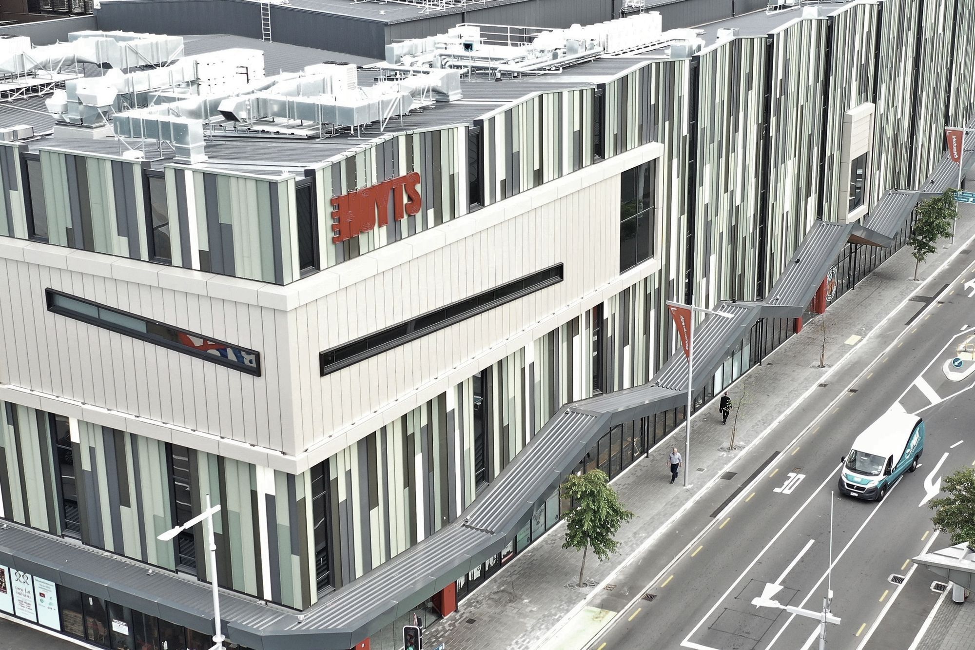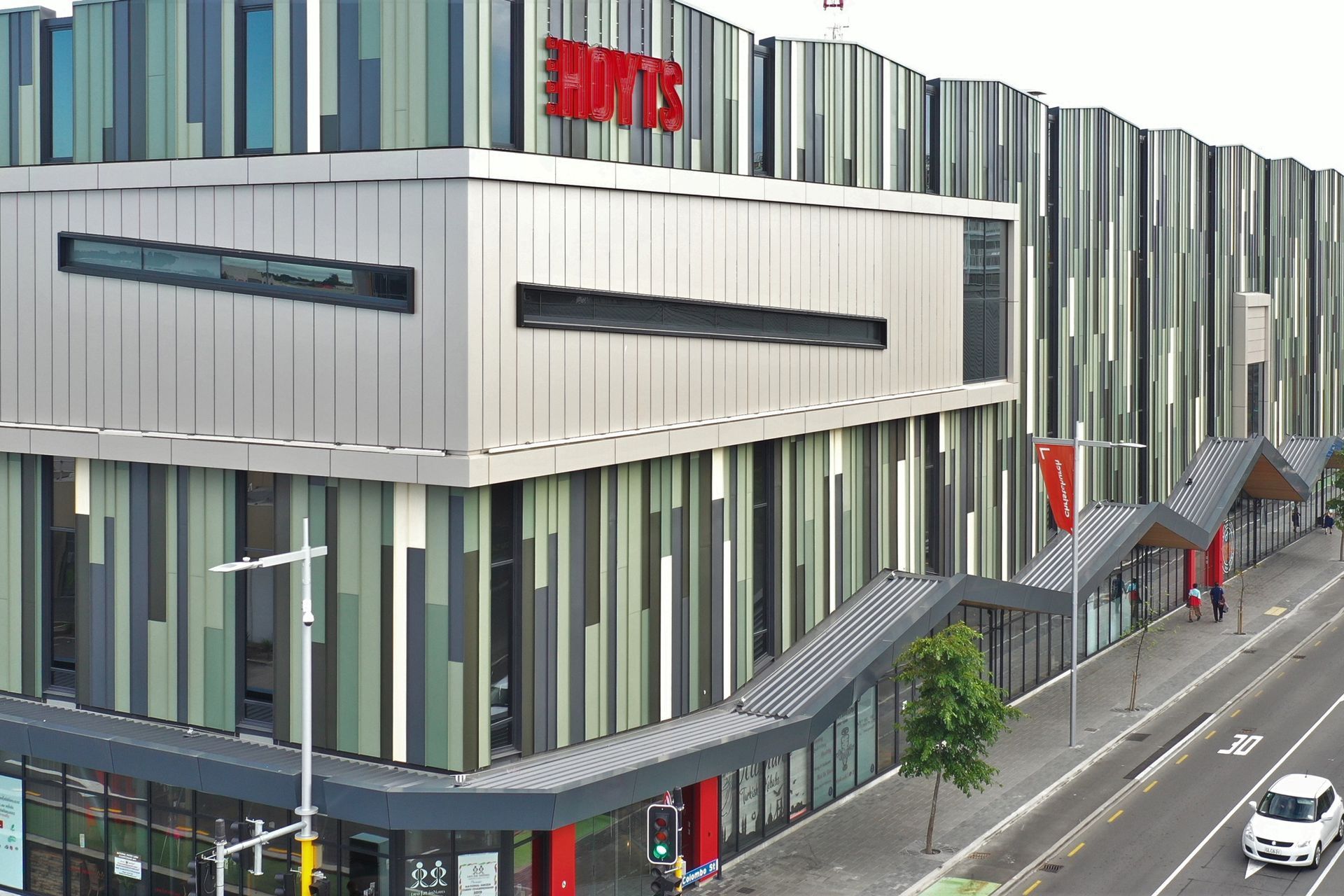 ArchiPro Project Summary - EntX Entertainment Central features innovative Eurotray® Angle Seam cladding, designed by Ignite Architects and executed by CS Roofing Canterbury, showcasing a striking mix of colors that reflect the Canterbury Plains landscape in a challenging urban setting.