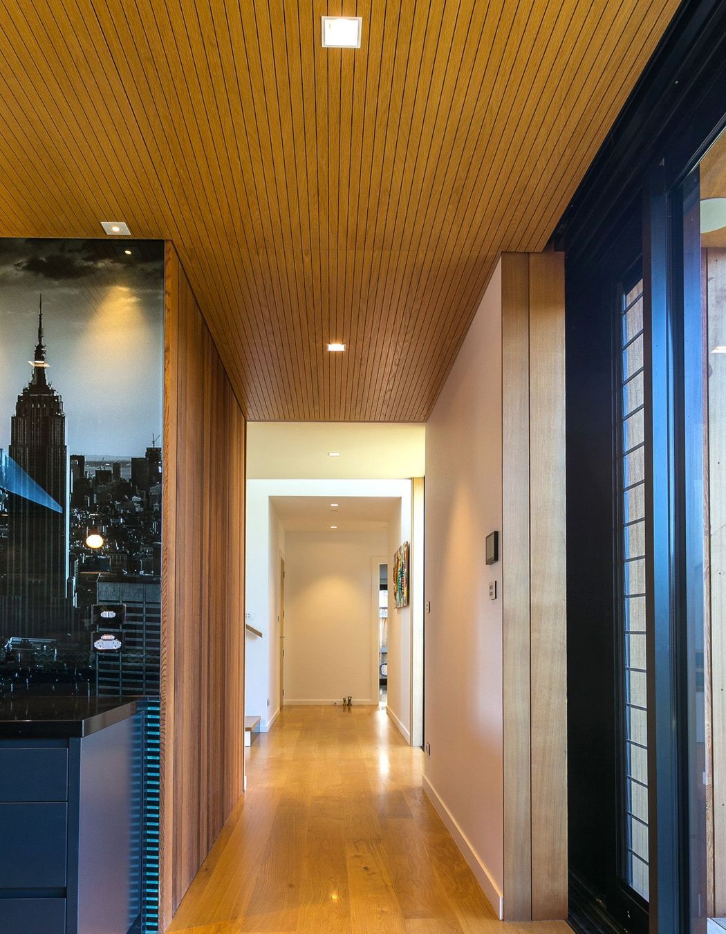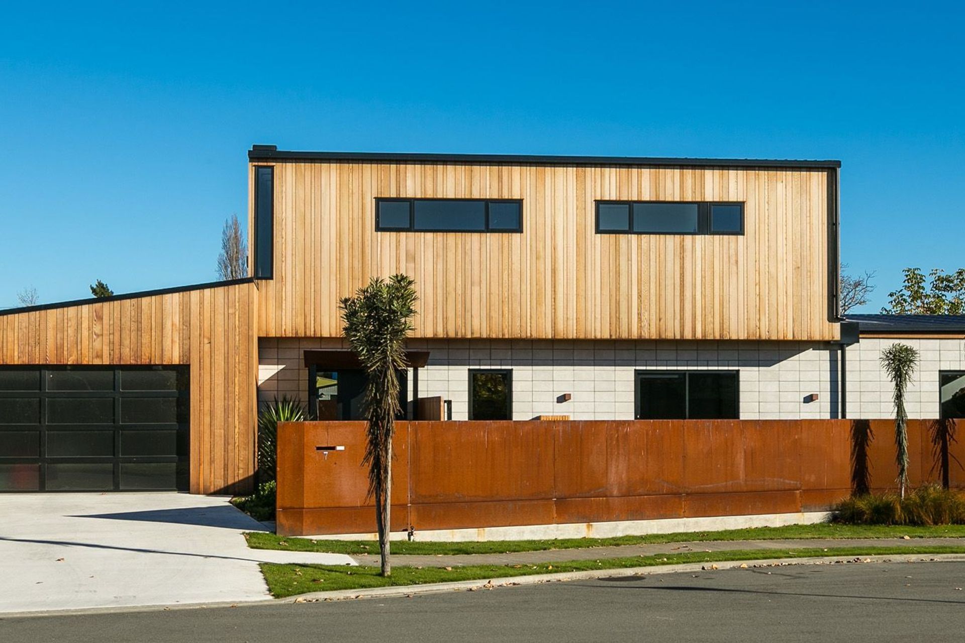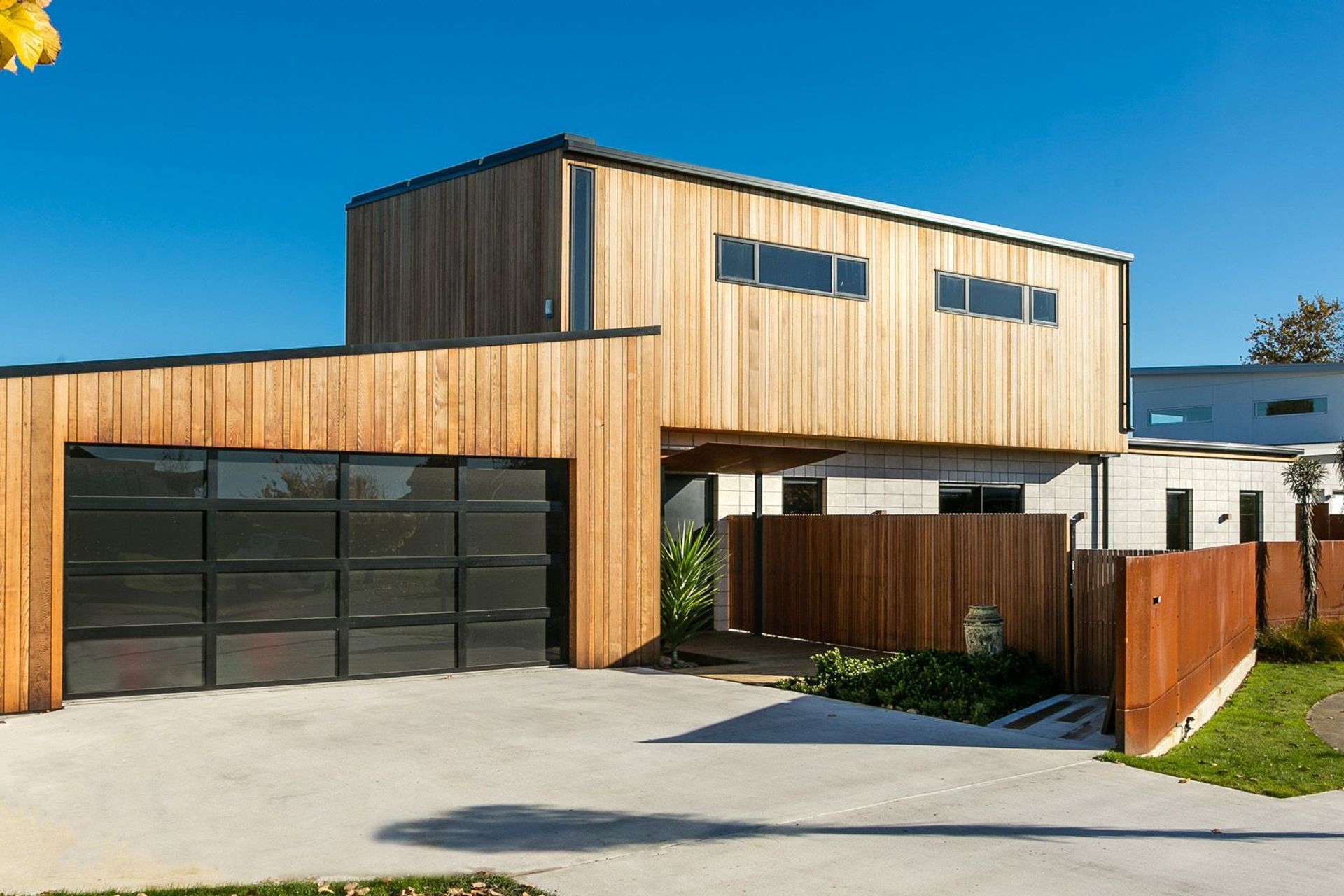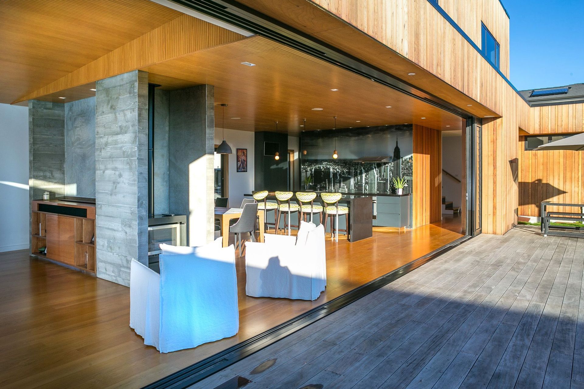 ArchiPro Project Summary - A contemporary home featuring innovative design elements, including an 8m sliding door, Corten Steel accents, and a striking Manhattan Skyline splashback, seamlessly blending modern materials with functional living spaces.