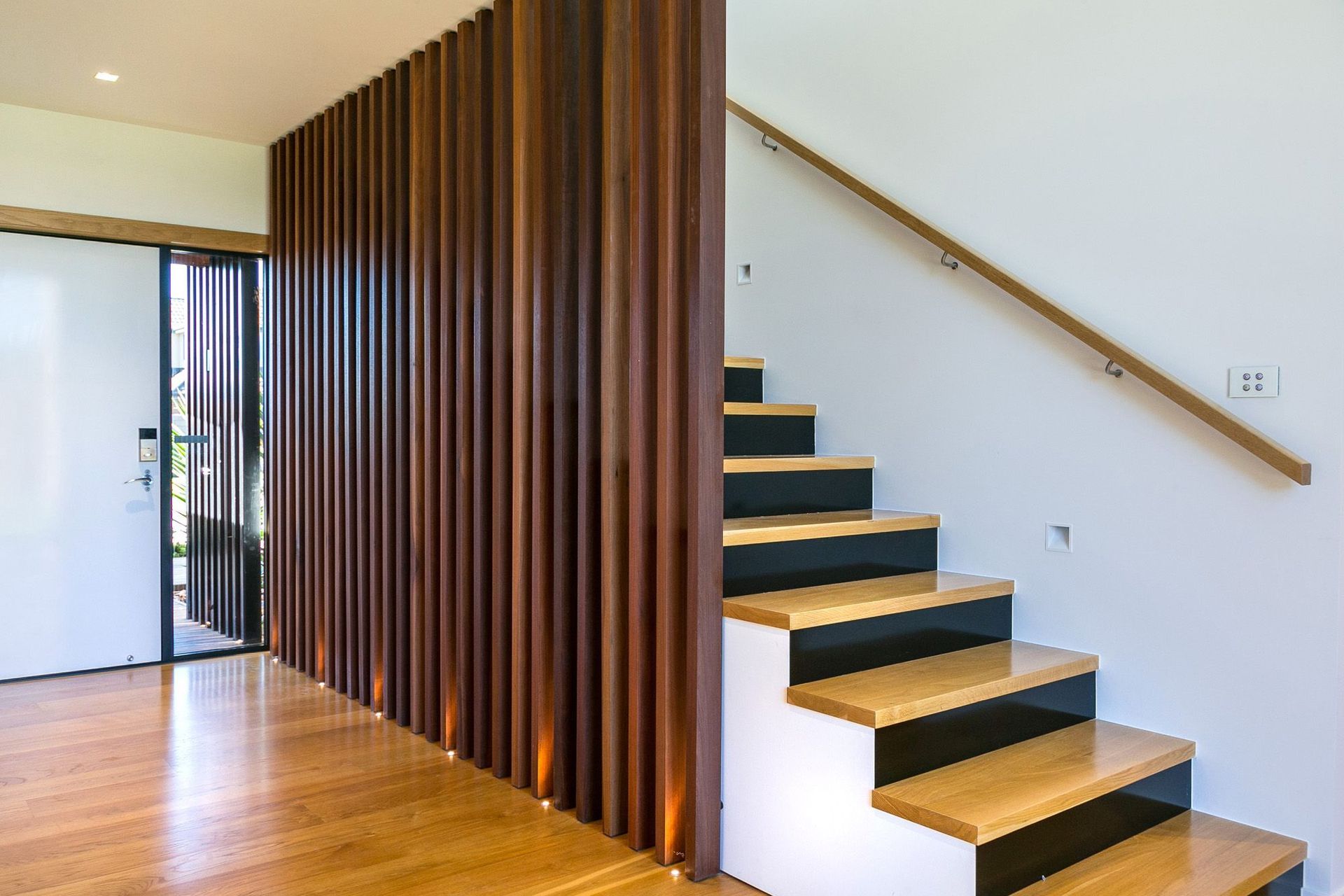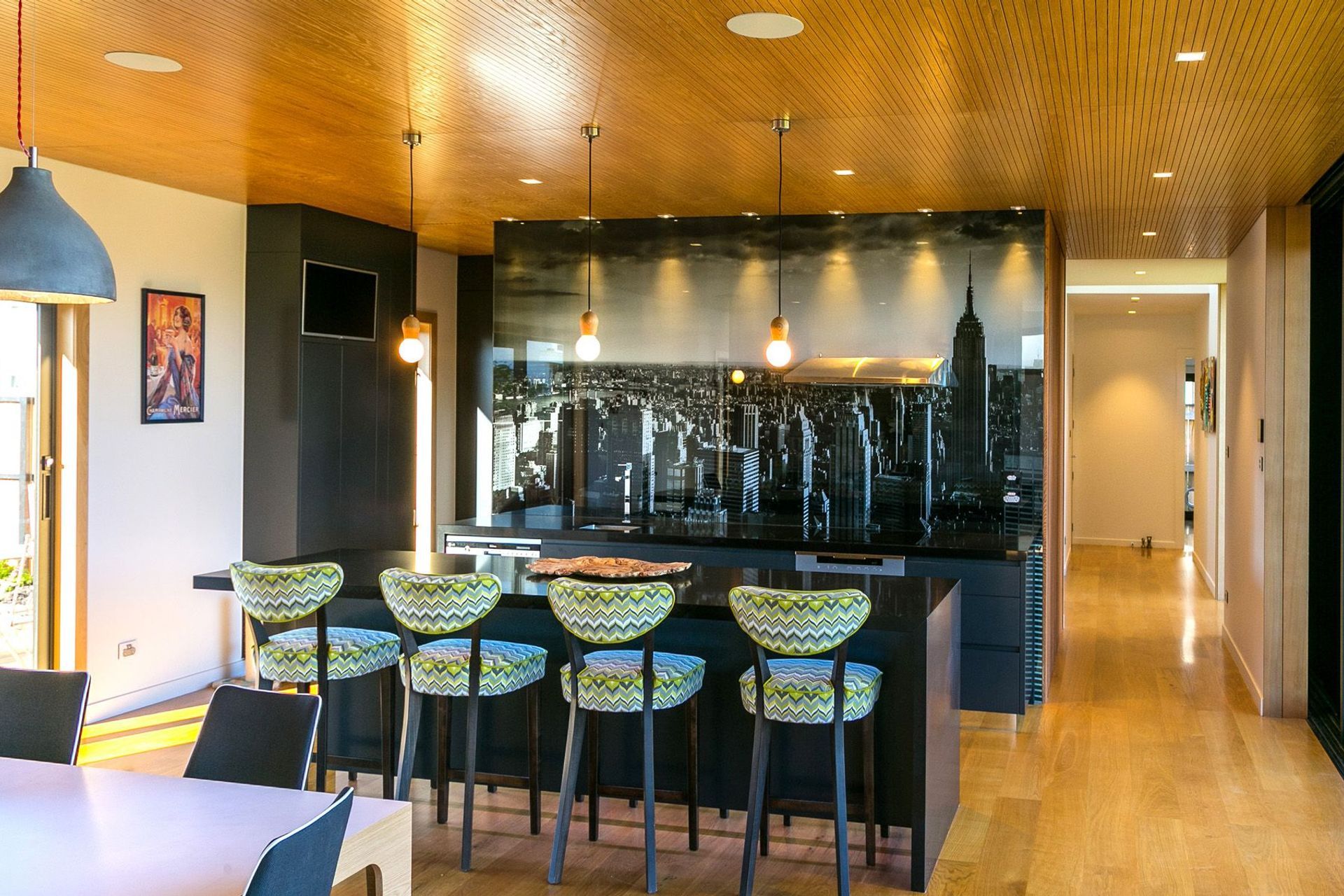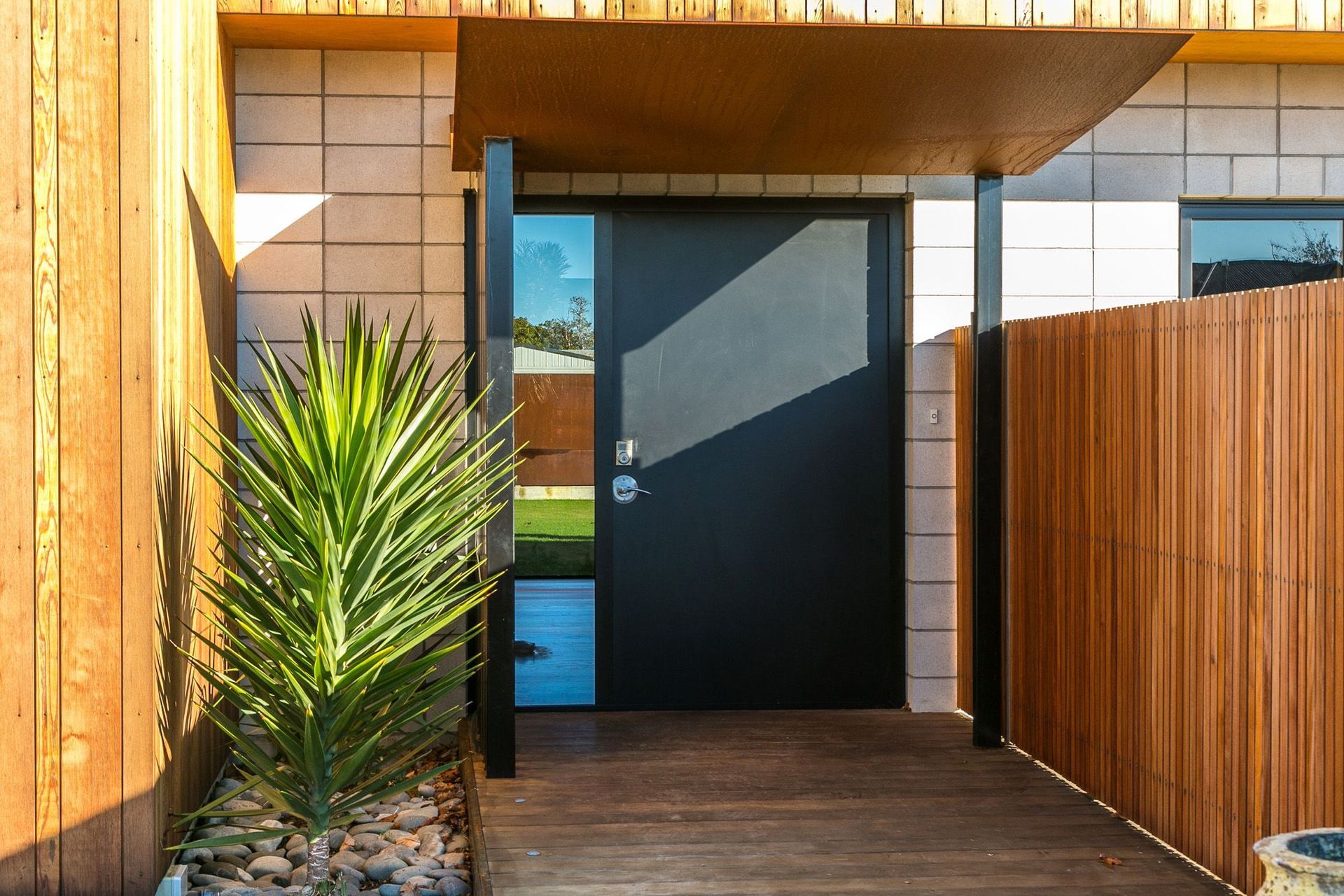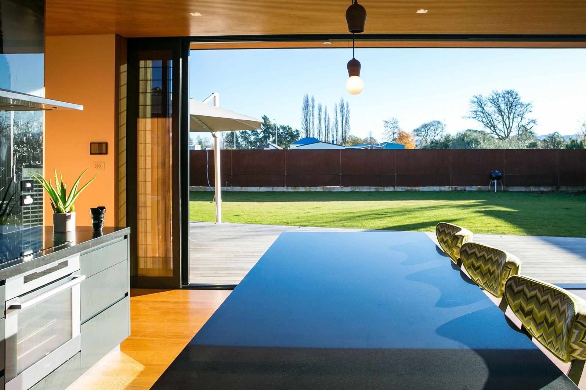 ArchiPro Project Summary - A contemporary home featuring innovative design elements, including an 8m sliding door, Corten Steel accents, and a striking Manhattan Skyline splashback, seamlessly blending modern materials with functional living spaces.