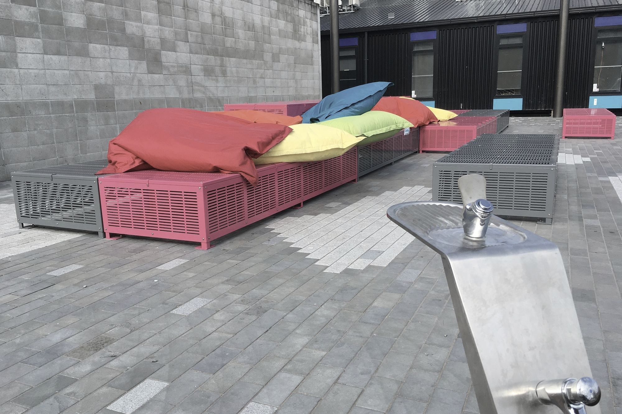 ArchiPro Project Summary - Collaborative street enhancements in Christchurch CBD, featuring vibrant installations at Evolution Square to create inviting communal spaces and encourage public engagement in the city's revitalization efforts.