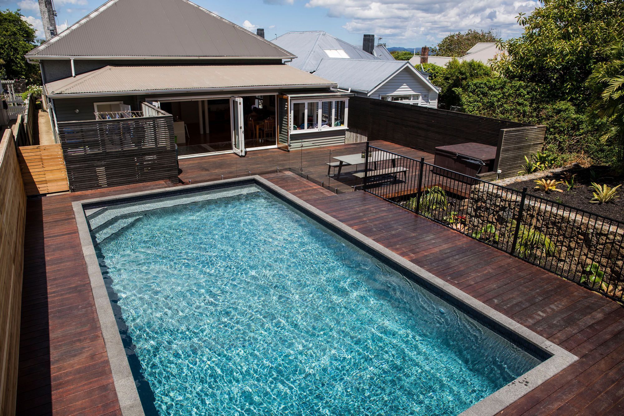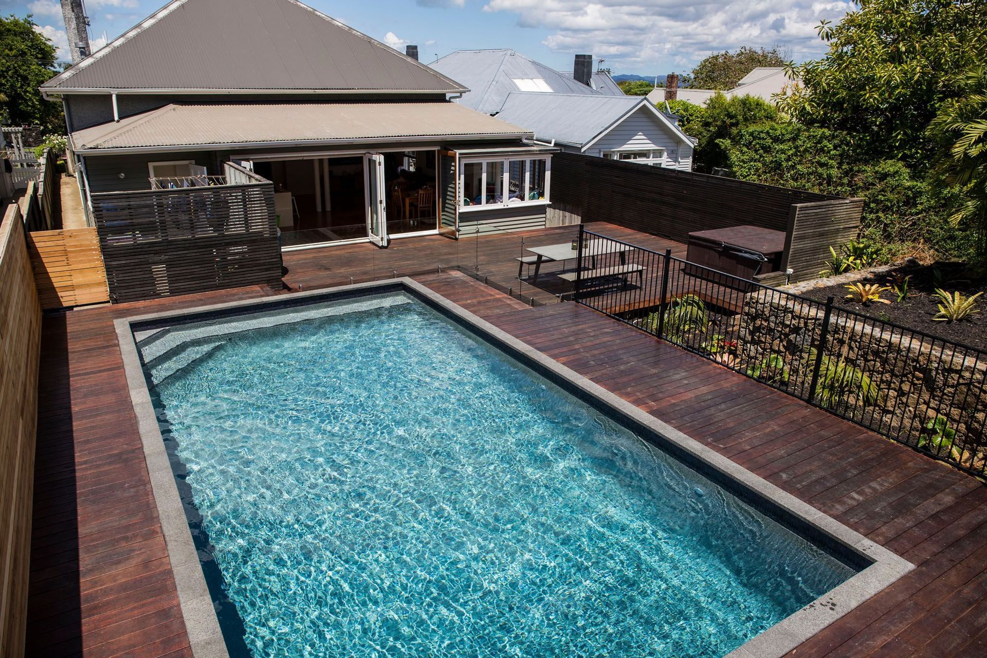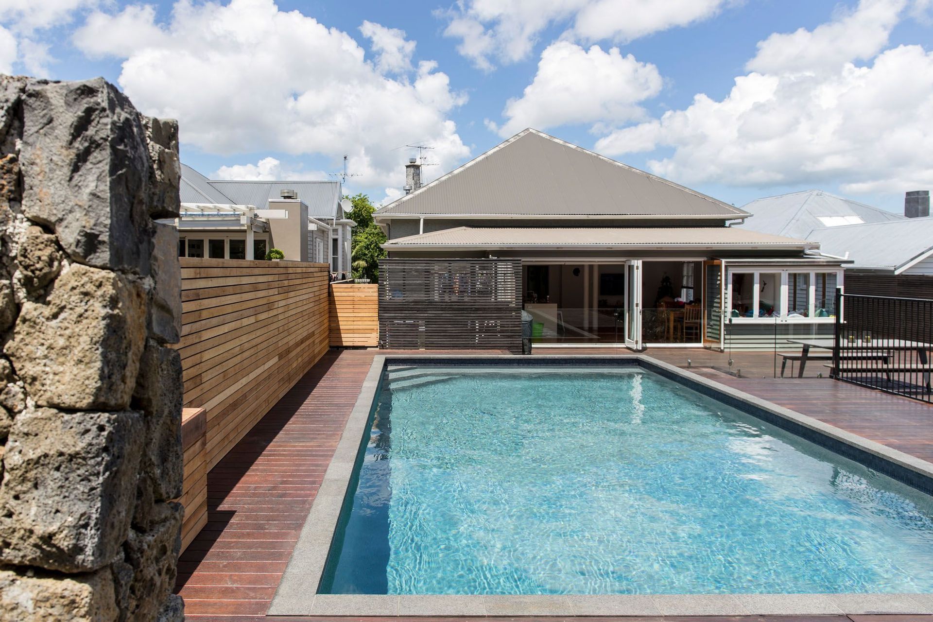 ArchiPro Project Summary - Elevated pool design and subtropical landscaping create a lush sanctuary in Mt Eden, integrating seamlessly with the multi-level site.