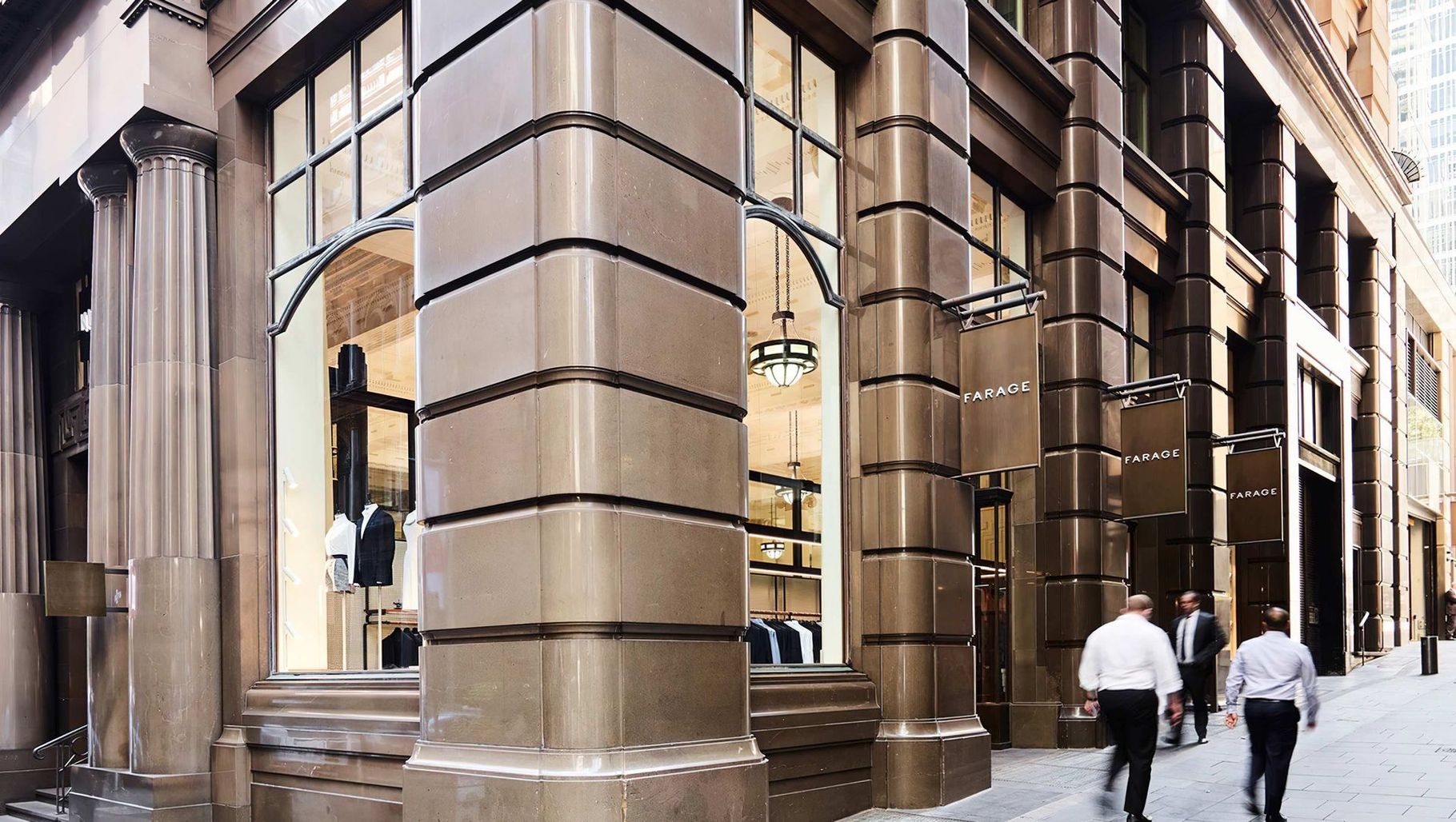 ArchiPro Project Summary - Farage Australia's flagship store harmoniously integrates within a converted bank in Sydney's CBD, featuring a refined palette of greys, bespoke walnut joinery, and custom-designed racking, all enhanced by a contemporary lighting installation that complements the heritage architecture.
