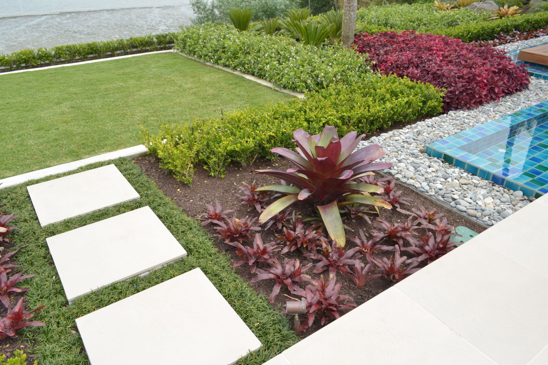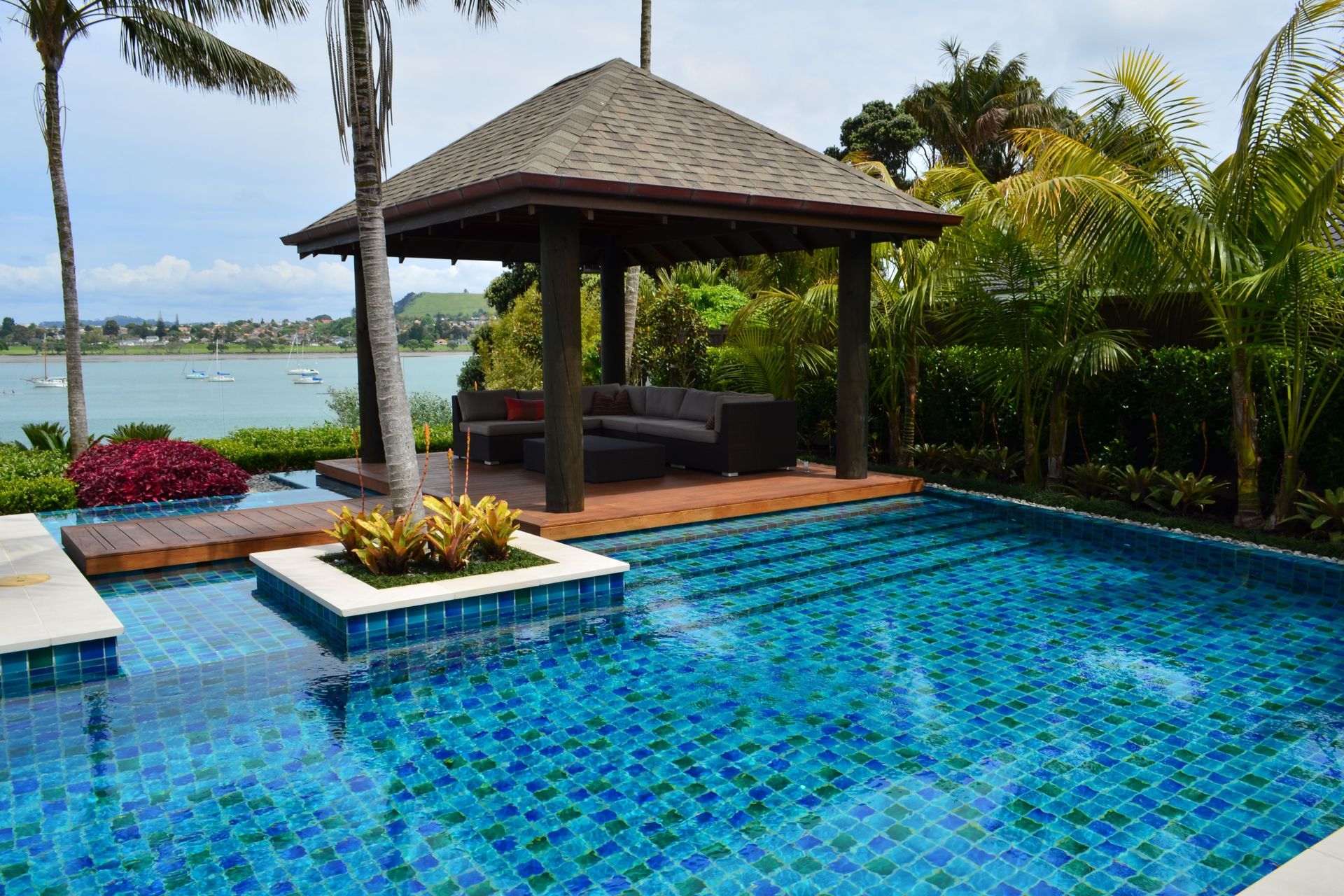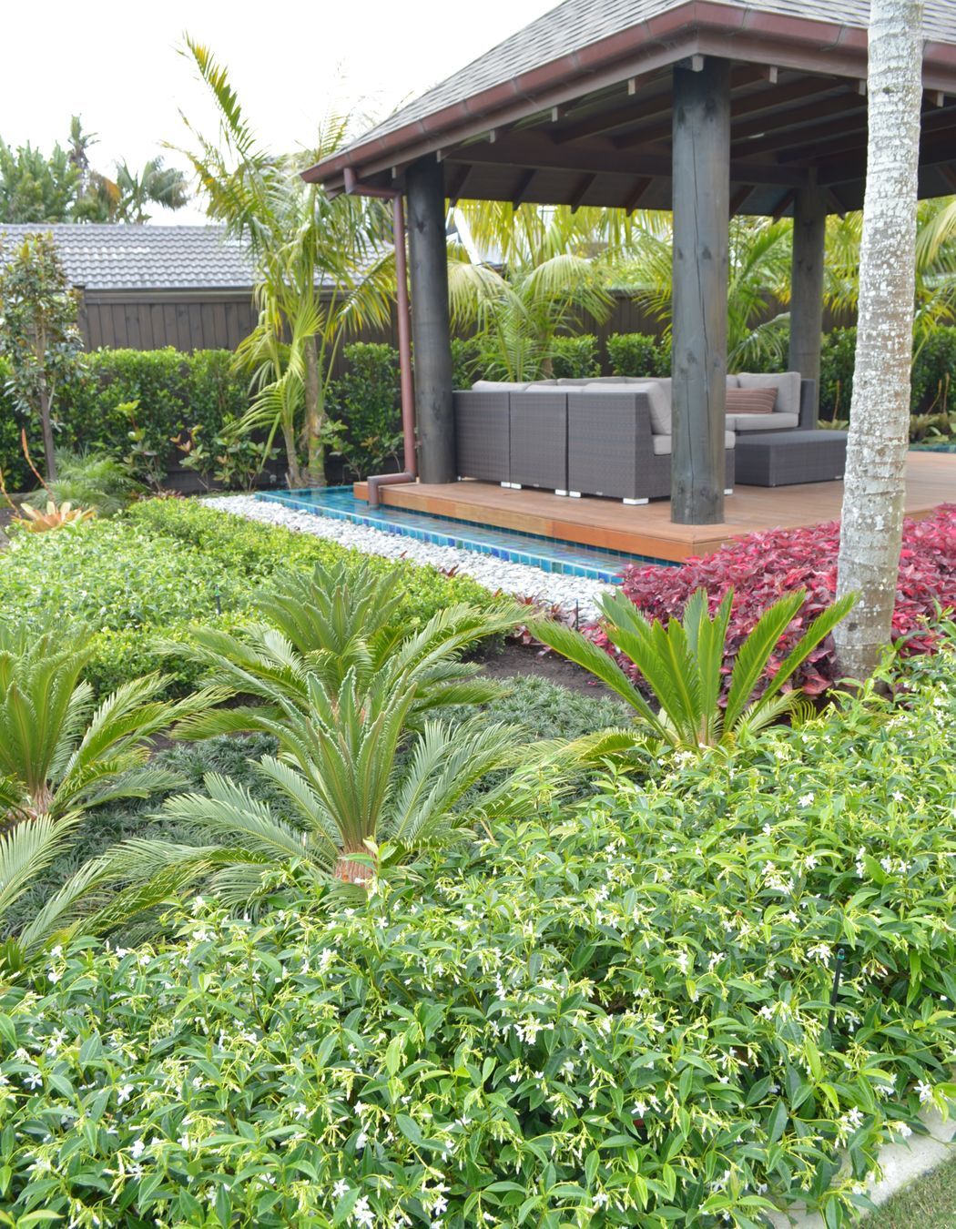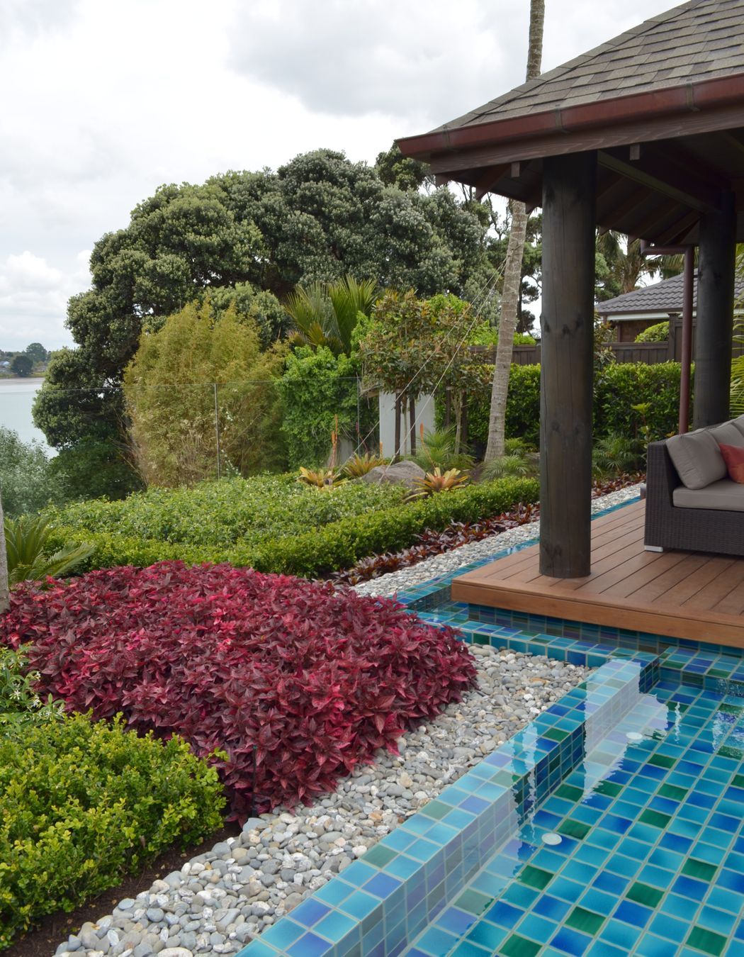ArchiPro Project Summary - Coastal garden featuring tropical plants, a resort-style pool with a central Bale, and a harmonious blend of color and texture in the planting scheme.