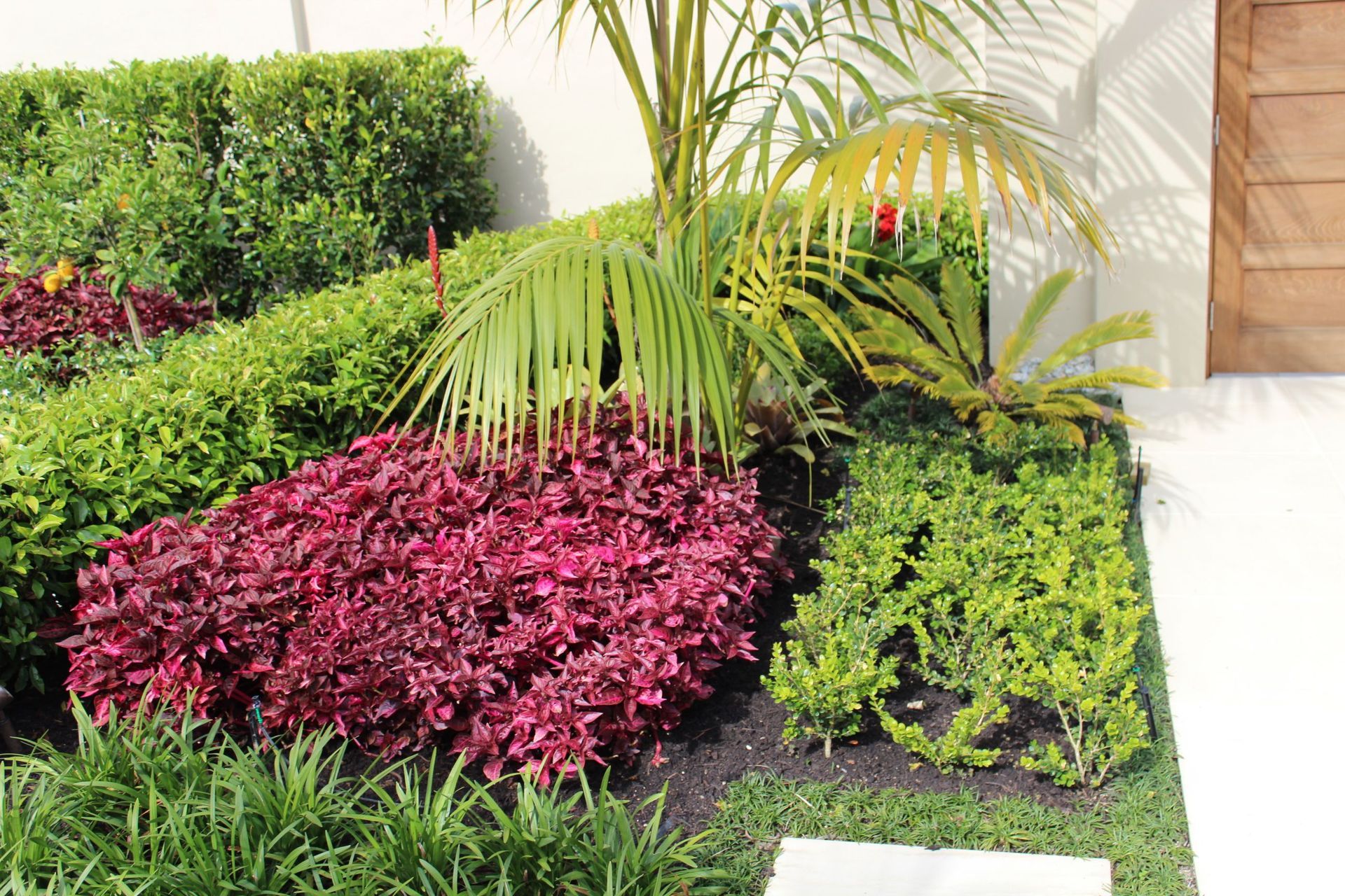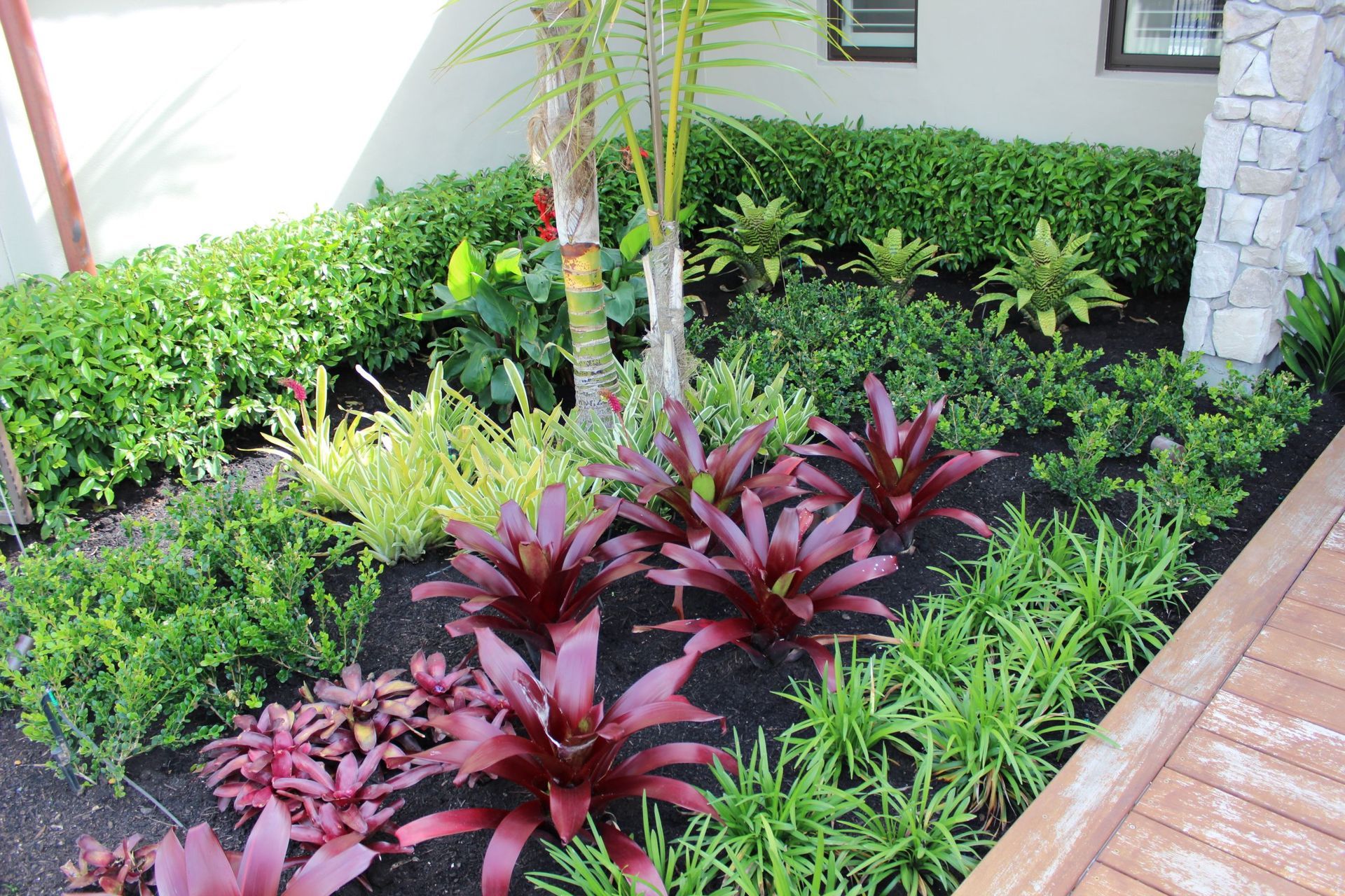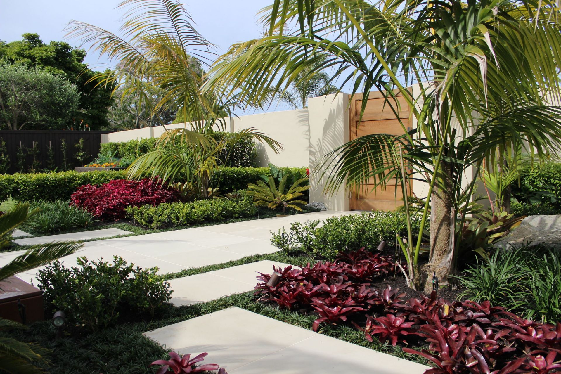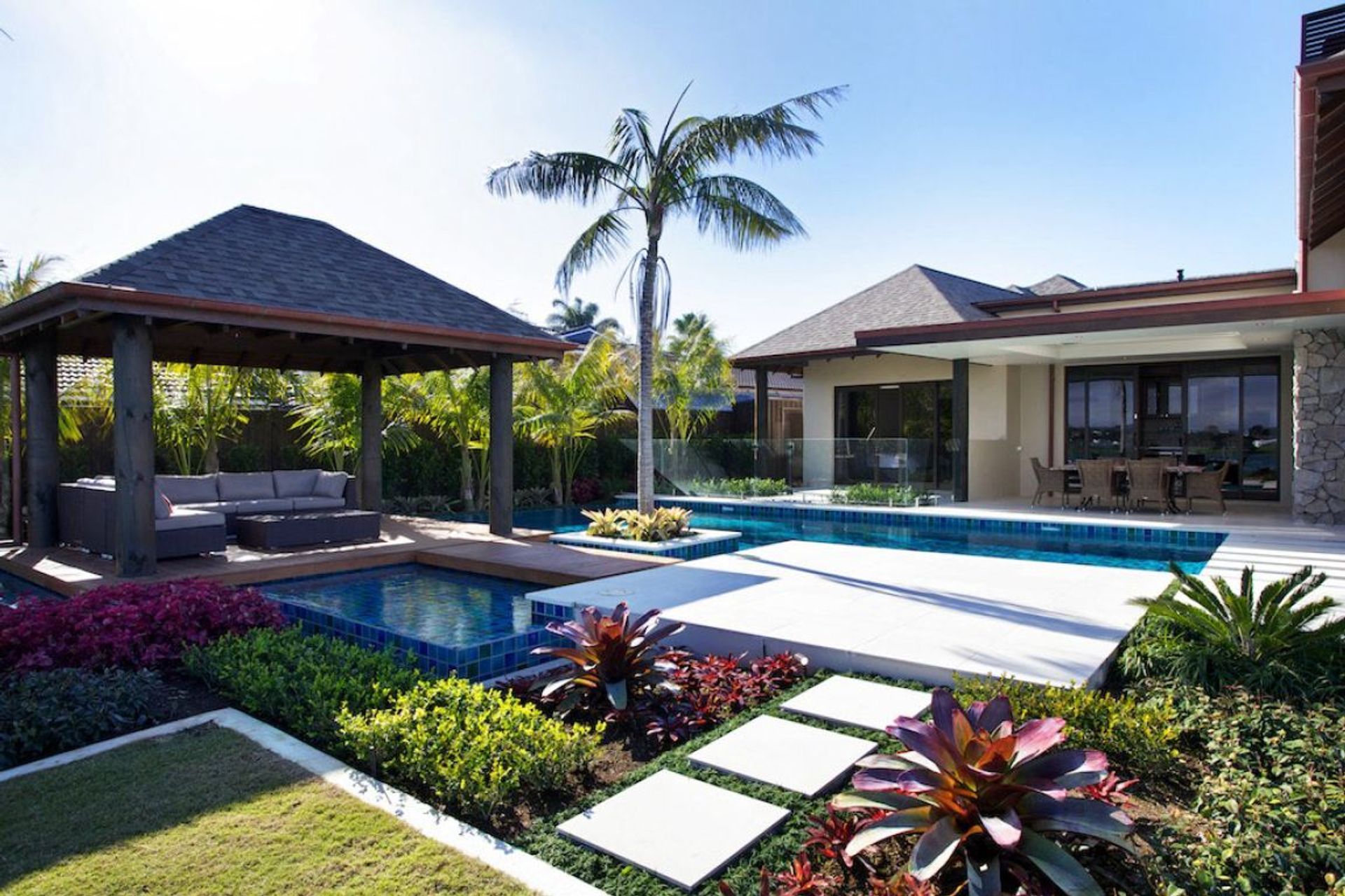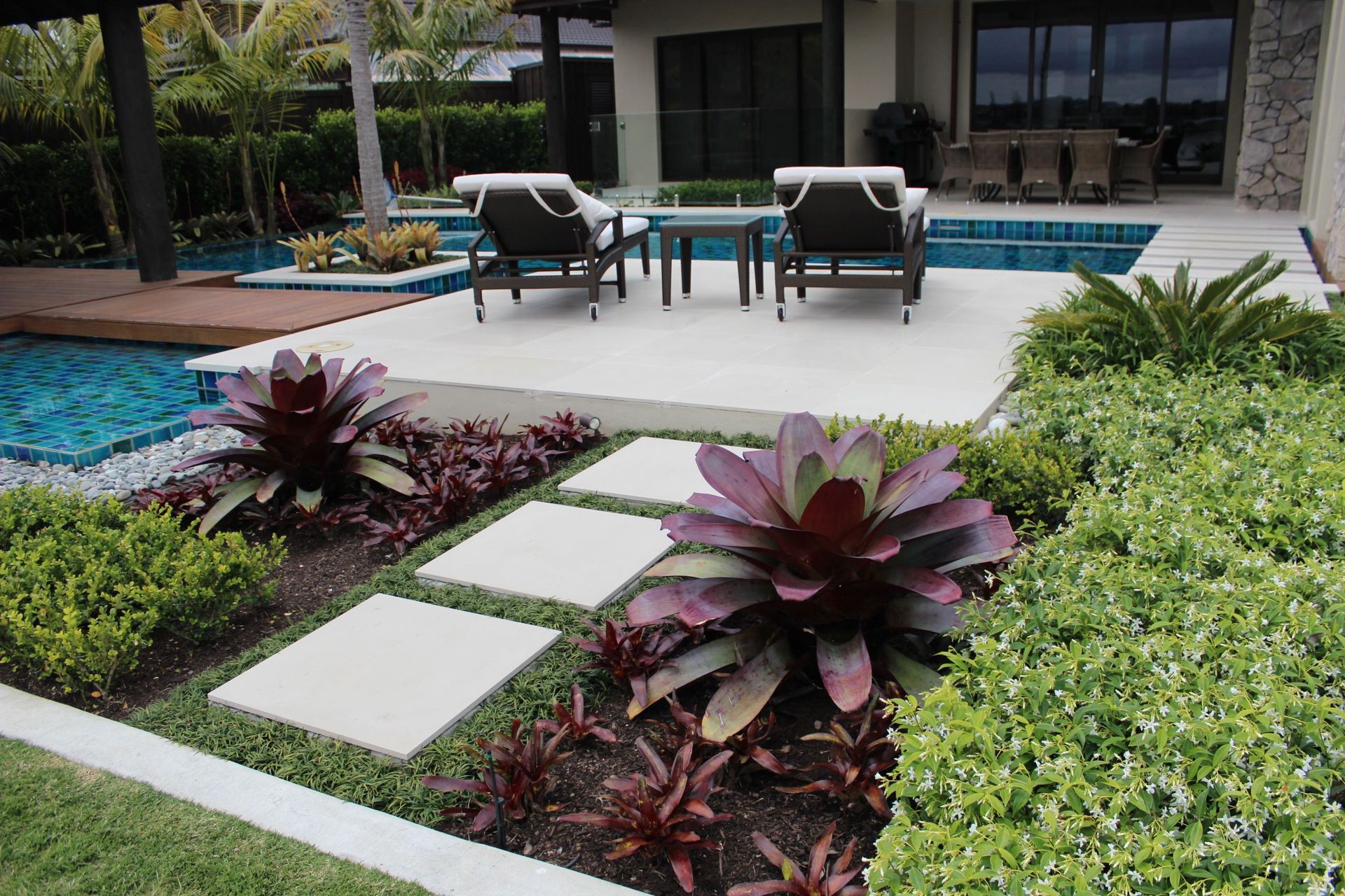 ArchiPro Project Summary - Coastal garden featuring tropical plants, a resort-style pool with a central Bale, and a harmonious blend of color and texture in the planting scheme.