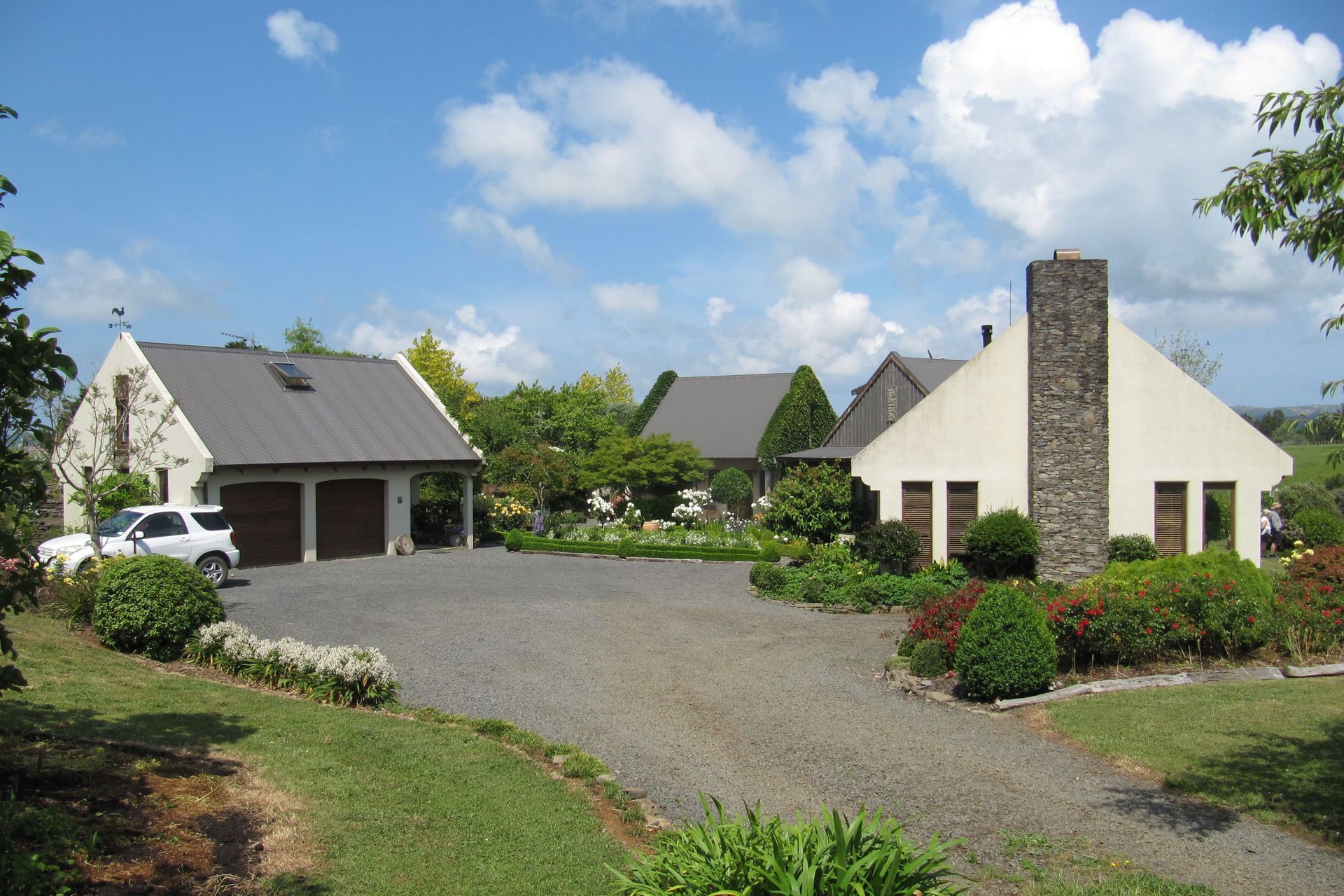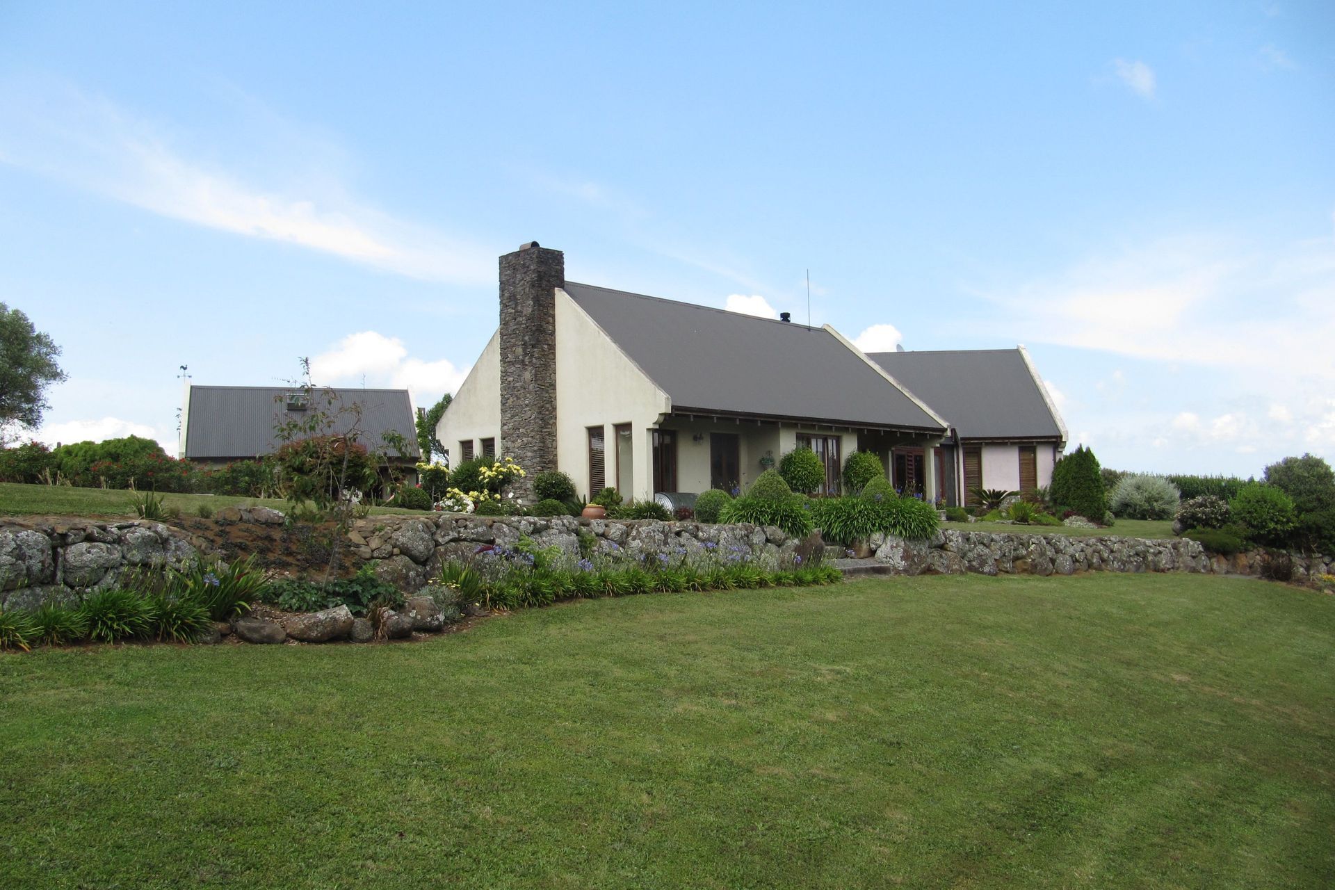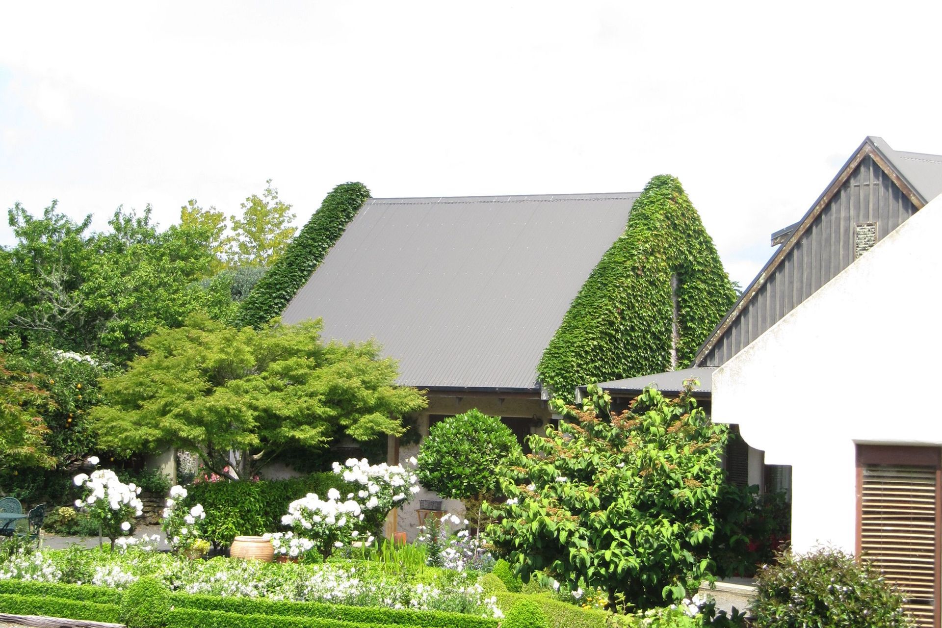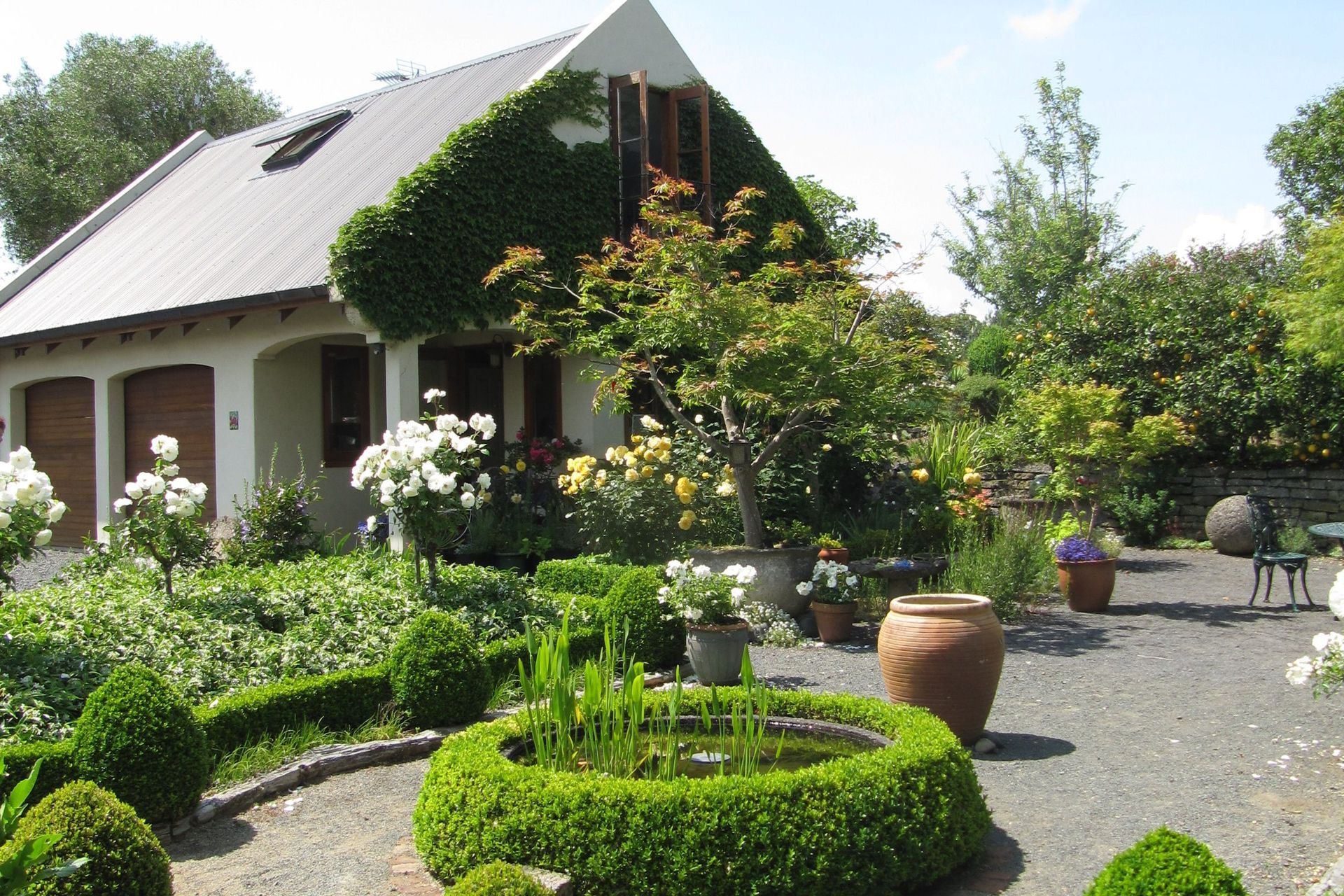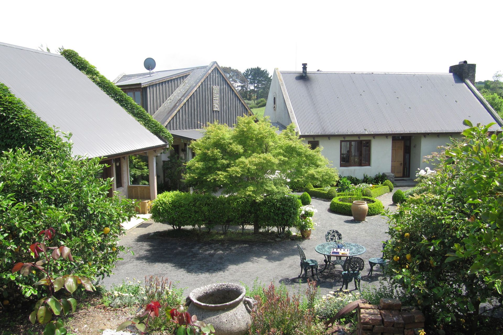 ArchiPro Project Summary - A charming cottage in the Onewhero Hills featuring a series of separate pavilions, handcrafted interiors, and a serene courtyard garden, completed in 2005, offering a unique blend of reclaimed materials and modern comfort.
