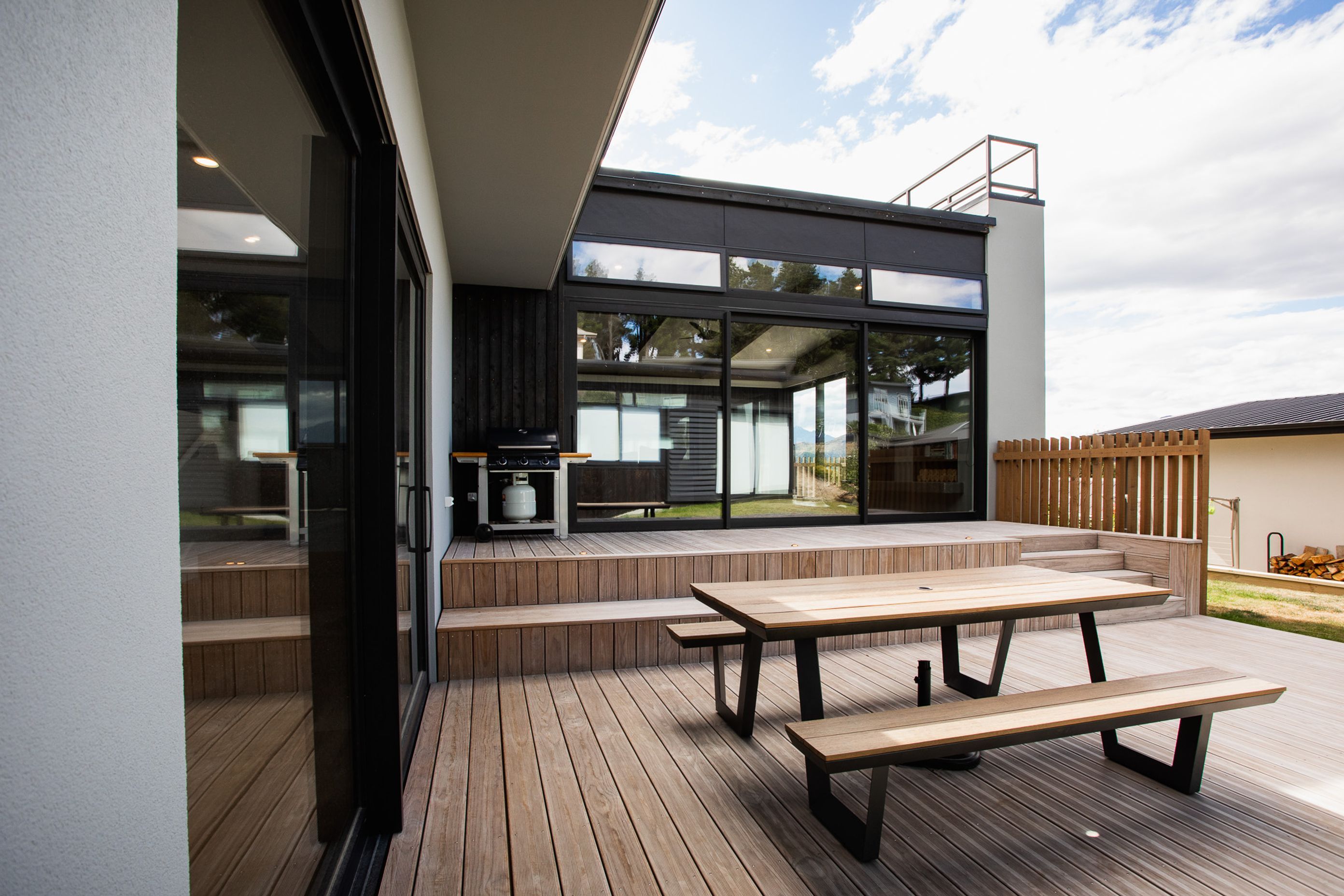 ArchiPro Project Summary - A contemporary home on a sloping site, featuring an open plan kitchen and living space with breathtaking mountain and lake views, complemented by a charred timber exterior and seamless indoor-outdoor flow.