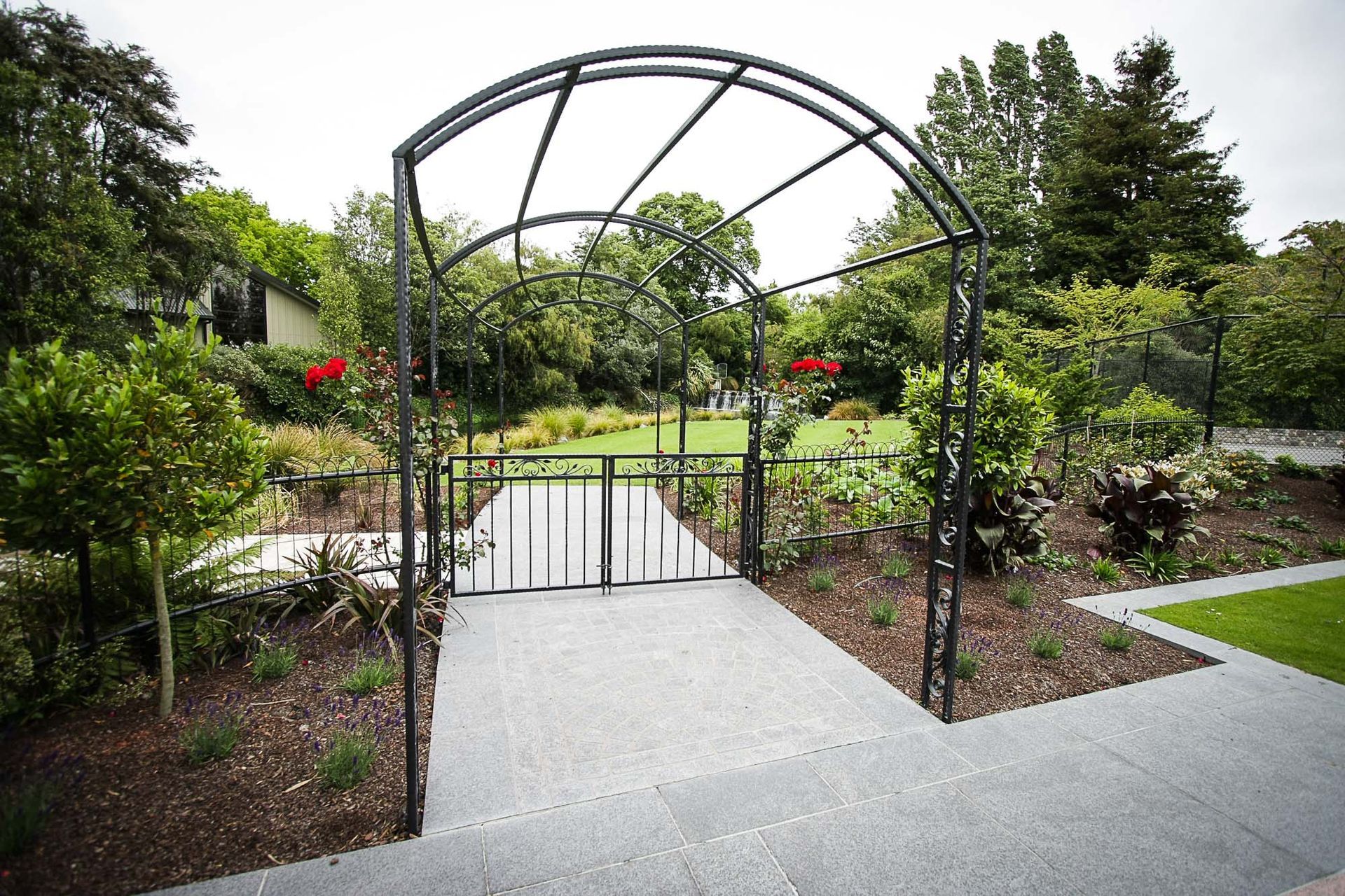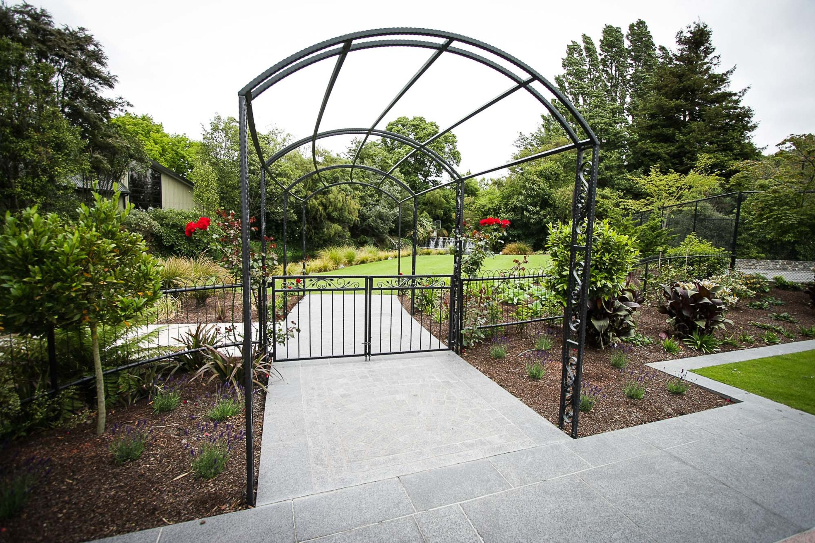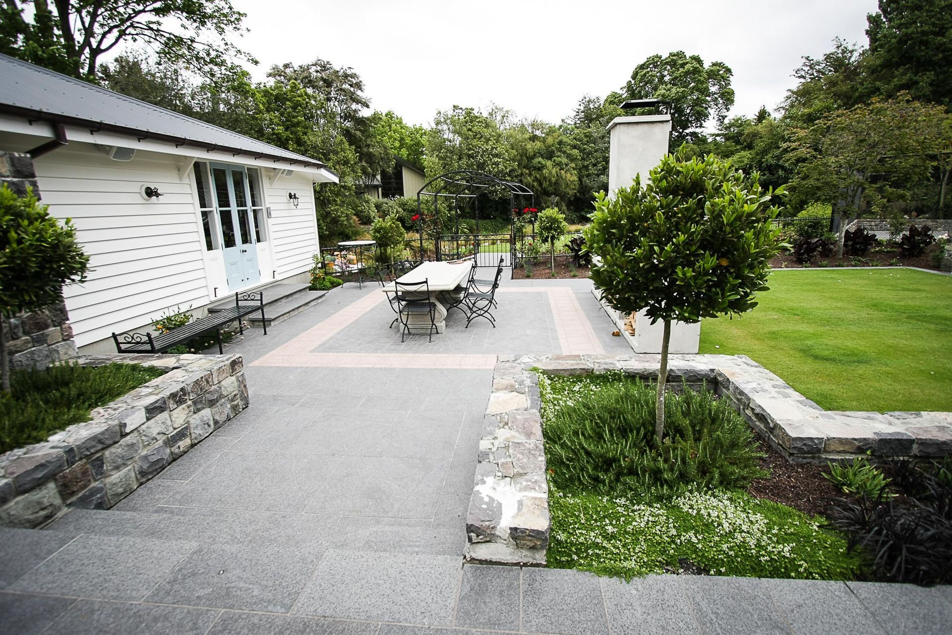 ArchiPro Project Summary - A stunning residential landscape featuring park-like grounds, new courtyards, paths, a tennis court, and pool area, seamlessly integrated with mature trees and a visual connection to the Avon River, enhanced by traditional paving and a mix of native and exotic plants.