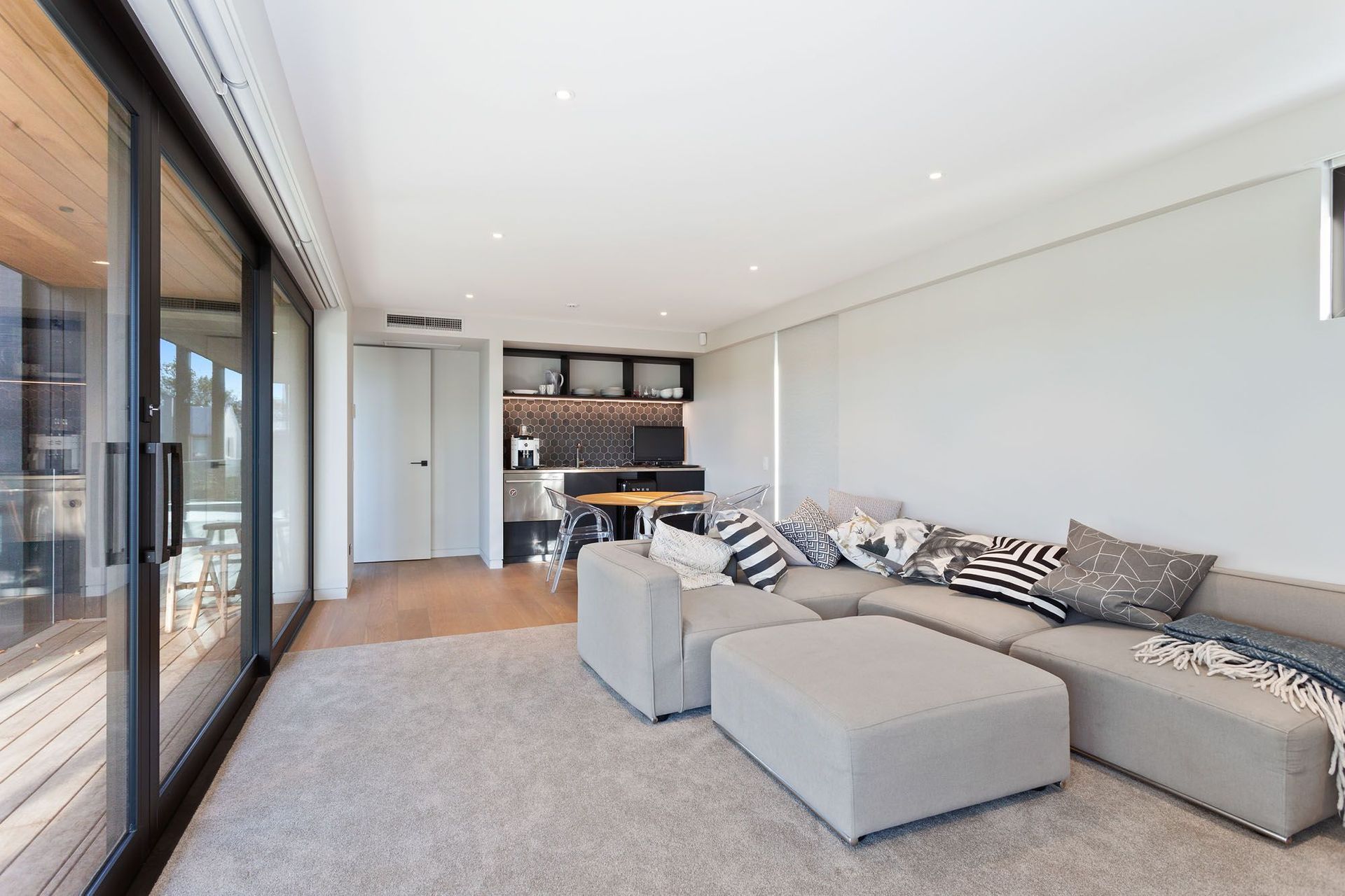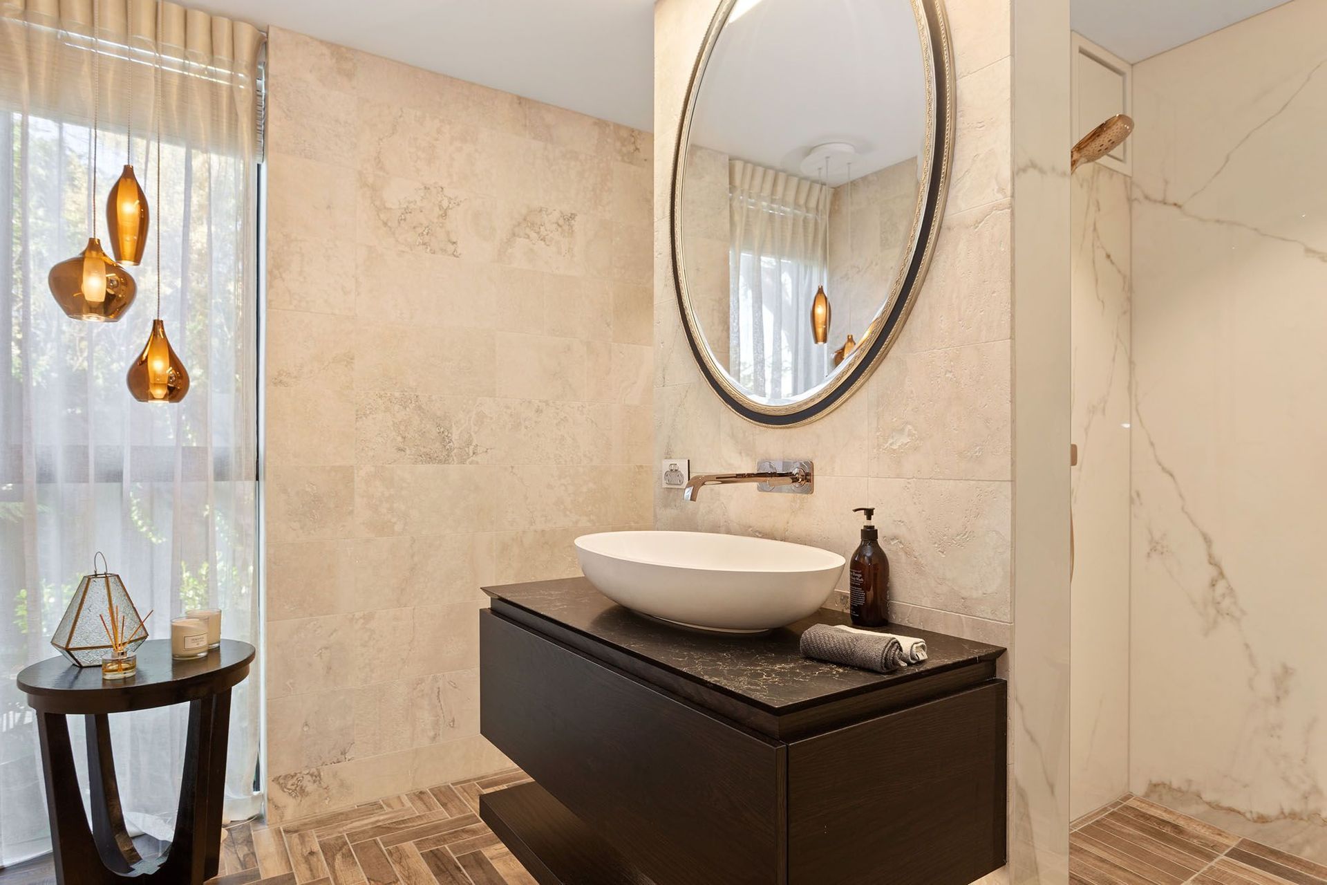 The central hub of the home, the open-plan kitchen and dining area connects to a separate media room and the two living areas that share a sheltered north-facing courtyard. Flooded with natural light filtered by delicate voiles, Angelique has enlisted soft, natural materials such as leather, reindeer hides and linen couches in creamy white and taupe, lending a soothing ambience to the casually elegant living space.