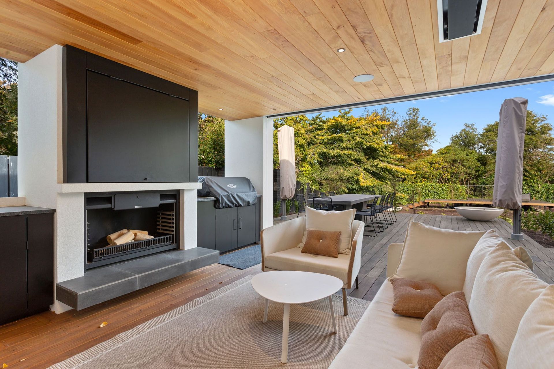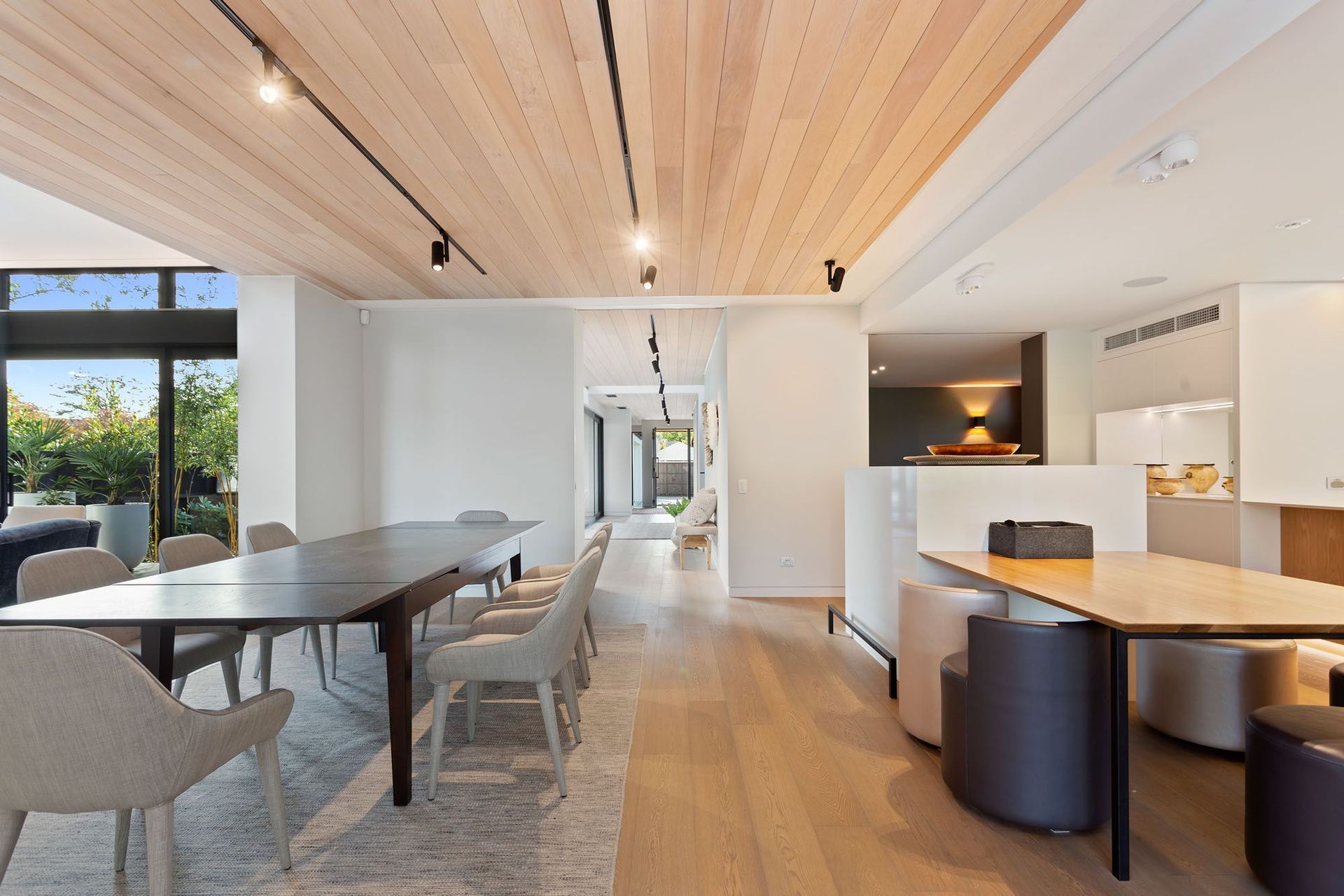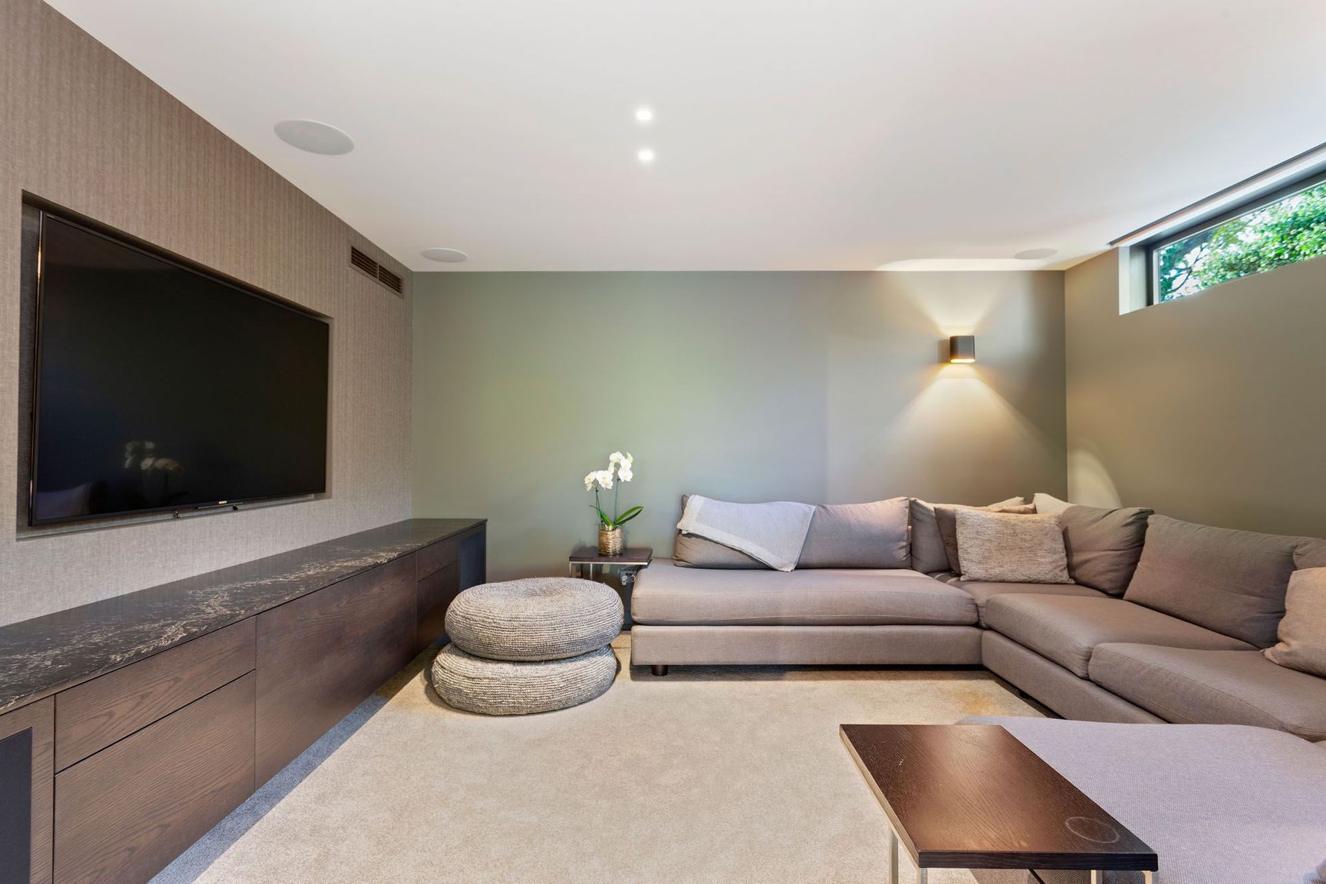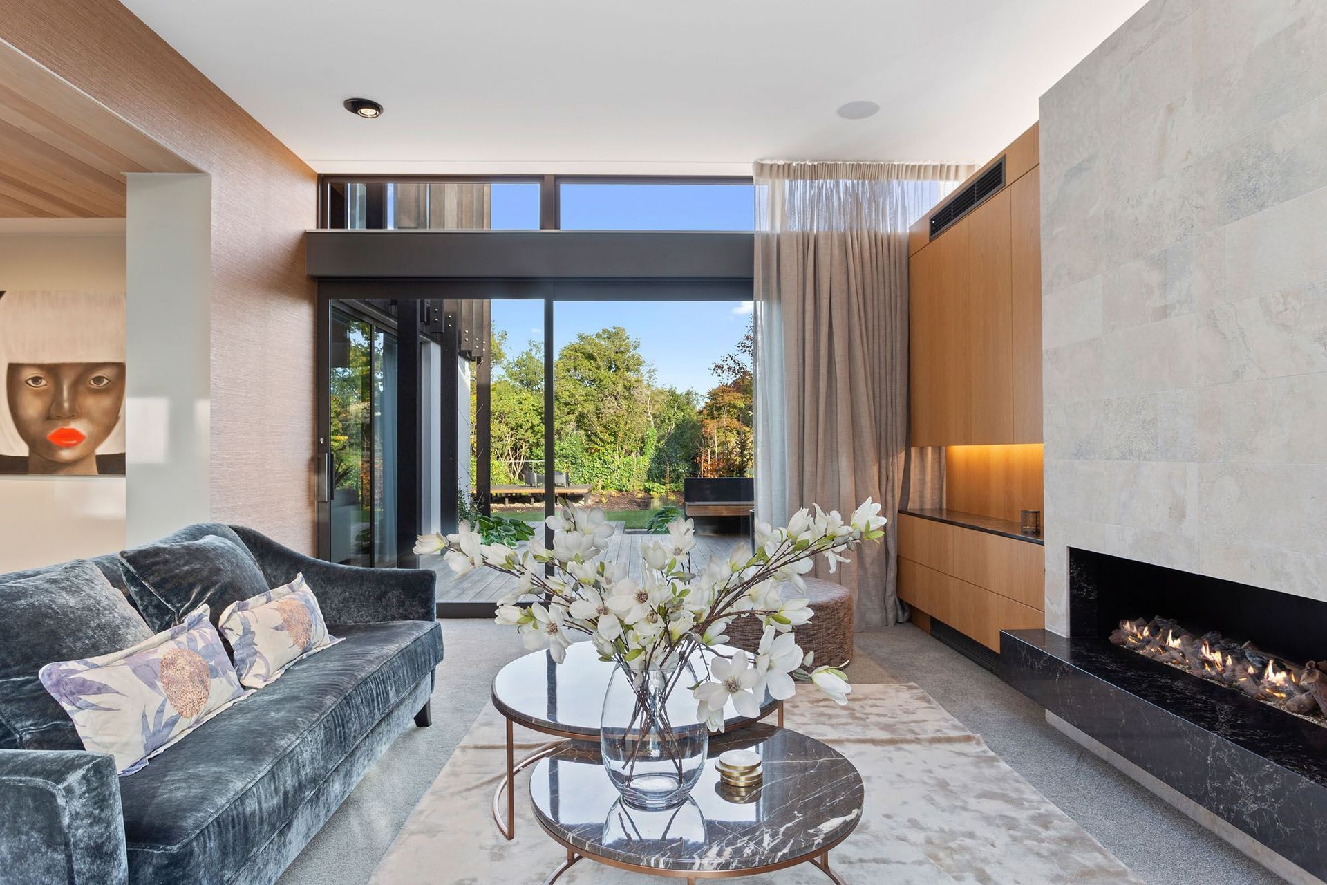 The formal sitting room is a refined, yet intimate nook where dinner guests can luxuriate in front of the fire with an aperitif; the plush velvet seating complements the natural stone fireplace surround and bespoke timber cabinetry, which cleverly conceals one of the home’s many hidden flat screen televisions when not in use.