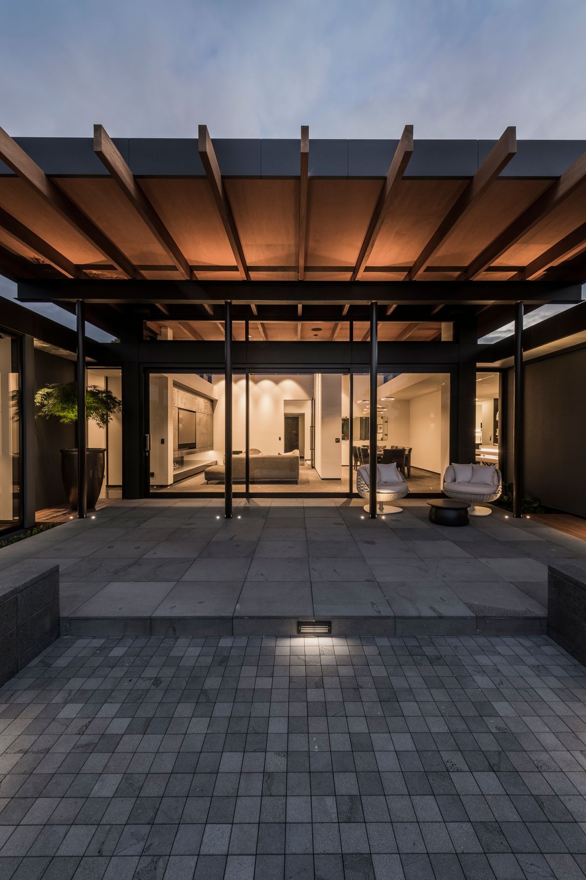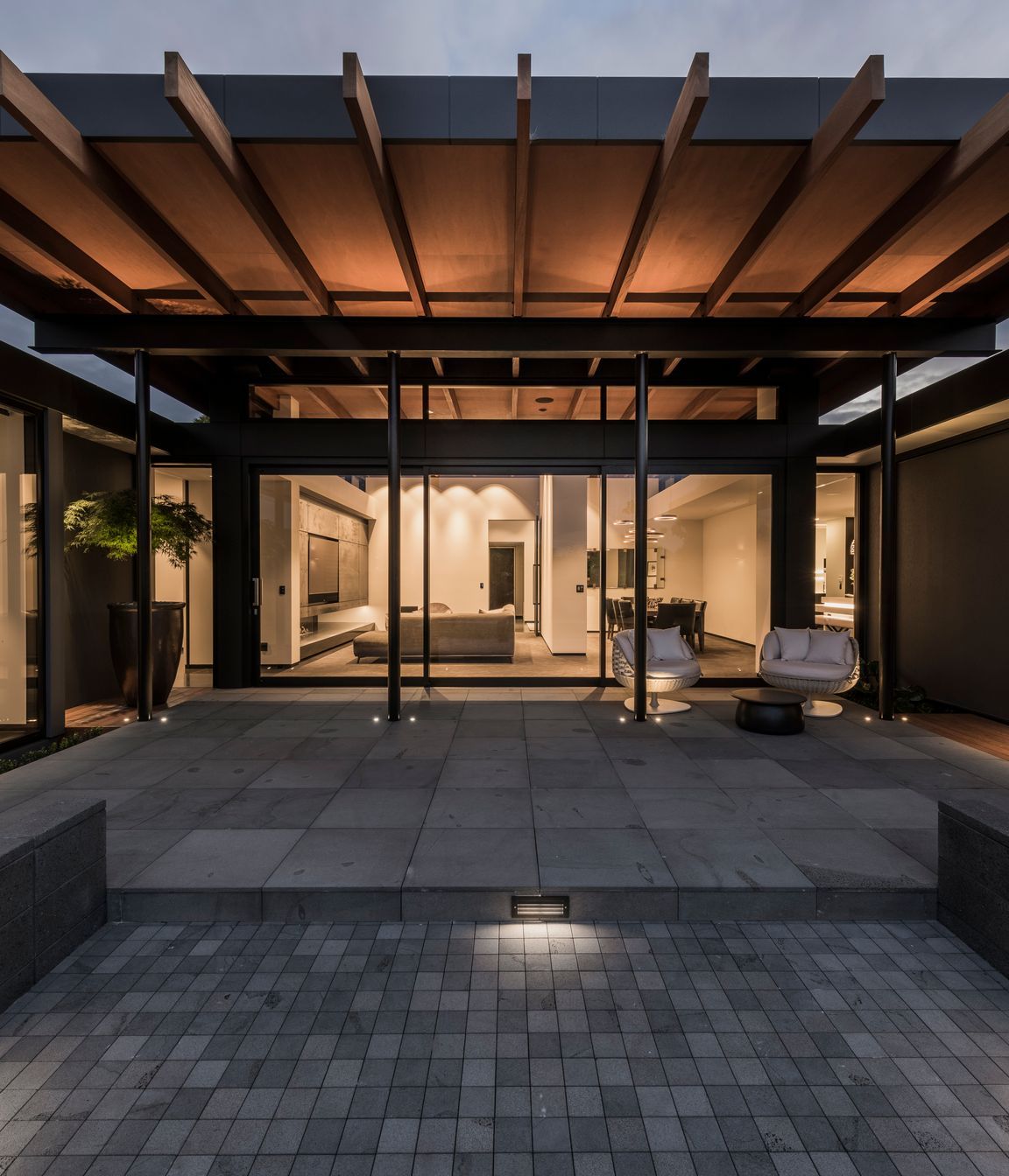 ArchiPro Project Summary - Elegant Fendalton House featuring stunning bluestone paving and stair treads, showcasing natural non-slip properties and a captivating interplay of light veining, color, and texture.