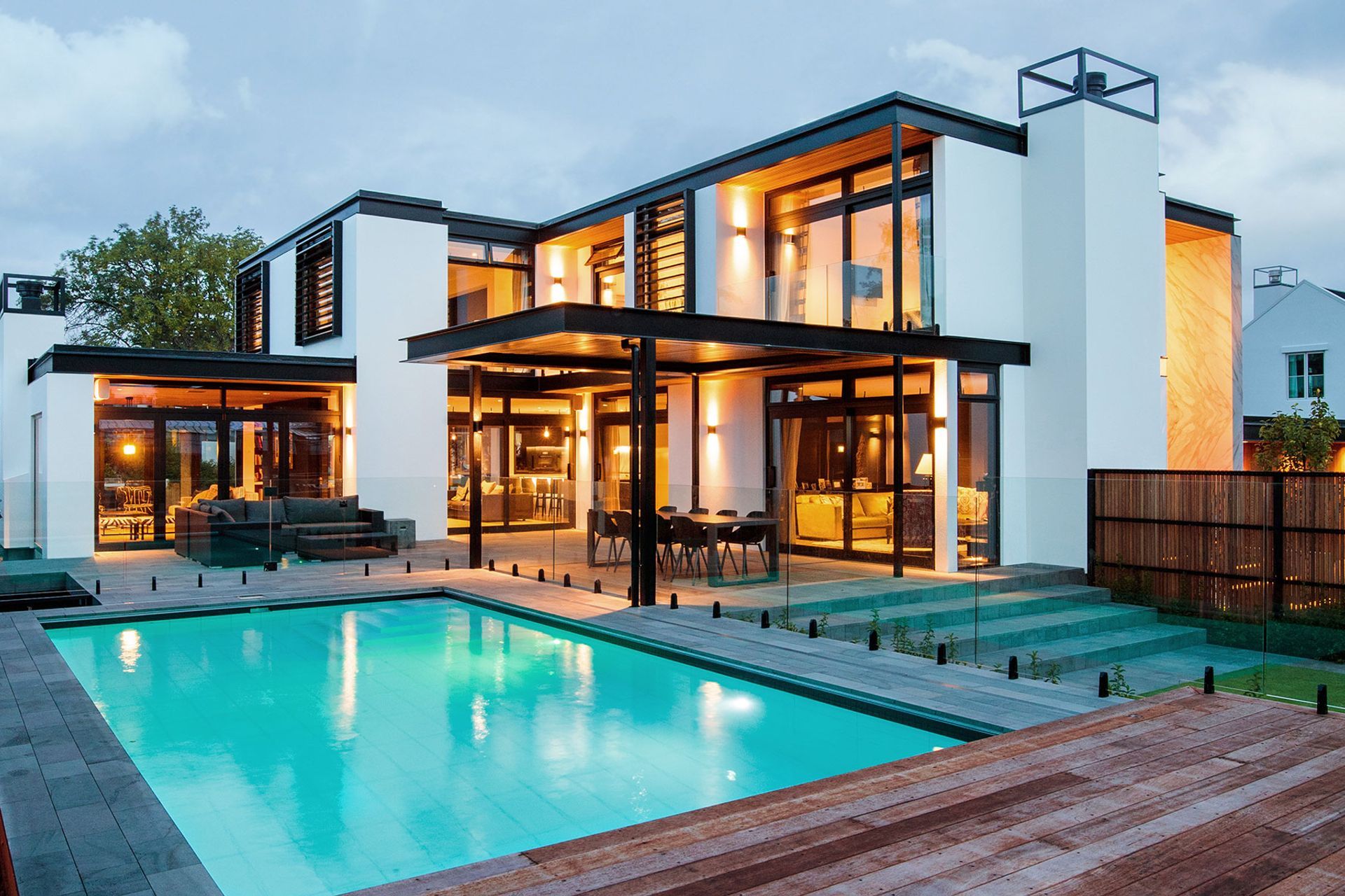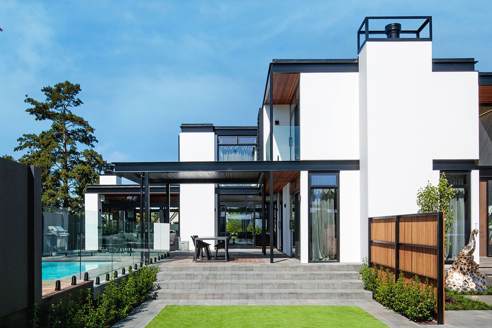 ArchiPro Project Summary - A stunning two-storey Fendalton residence featuring a tennis court, swimming pool, and elegant outdoor living spaces, designed by Sheppard and Rout, showcasing a harmonious blend of steel, cedar, and glass with warm interior finishes by Trenzseater.