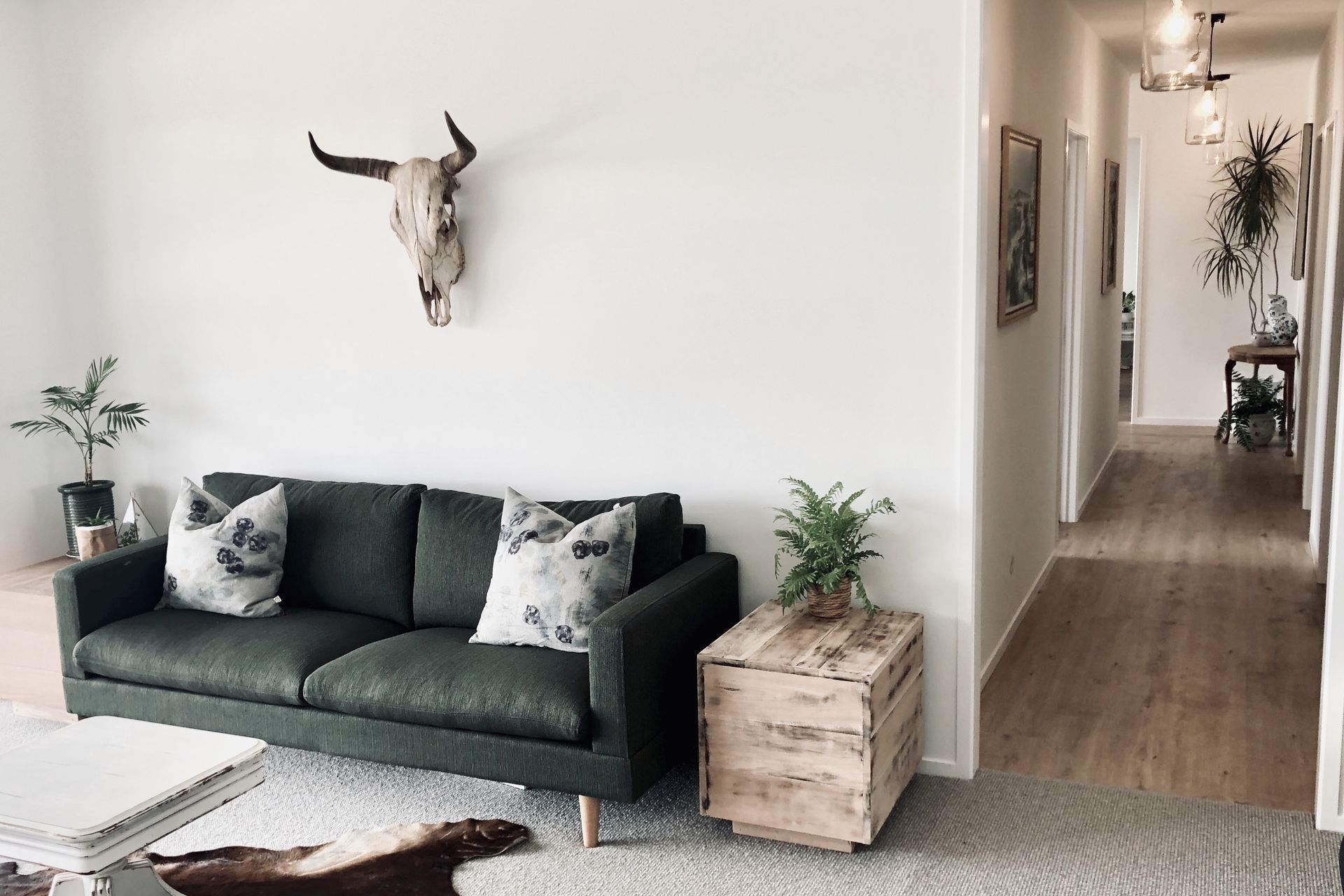 ArchiPro Project Summary - A stunning transformation of a basic farmhouse into a modern barn house, inspired by Nordic design, featuring natural materials and a calming palette, perfectly situated in rural Waihi Beach with ocean views and native bush.