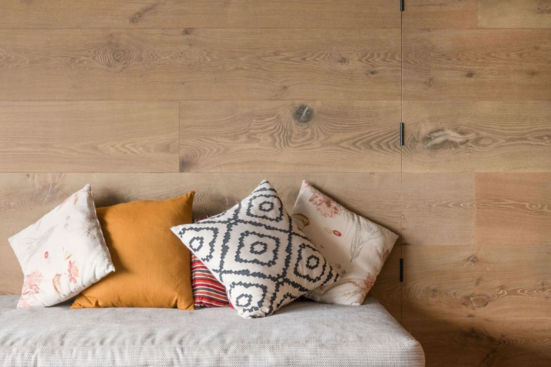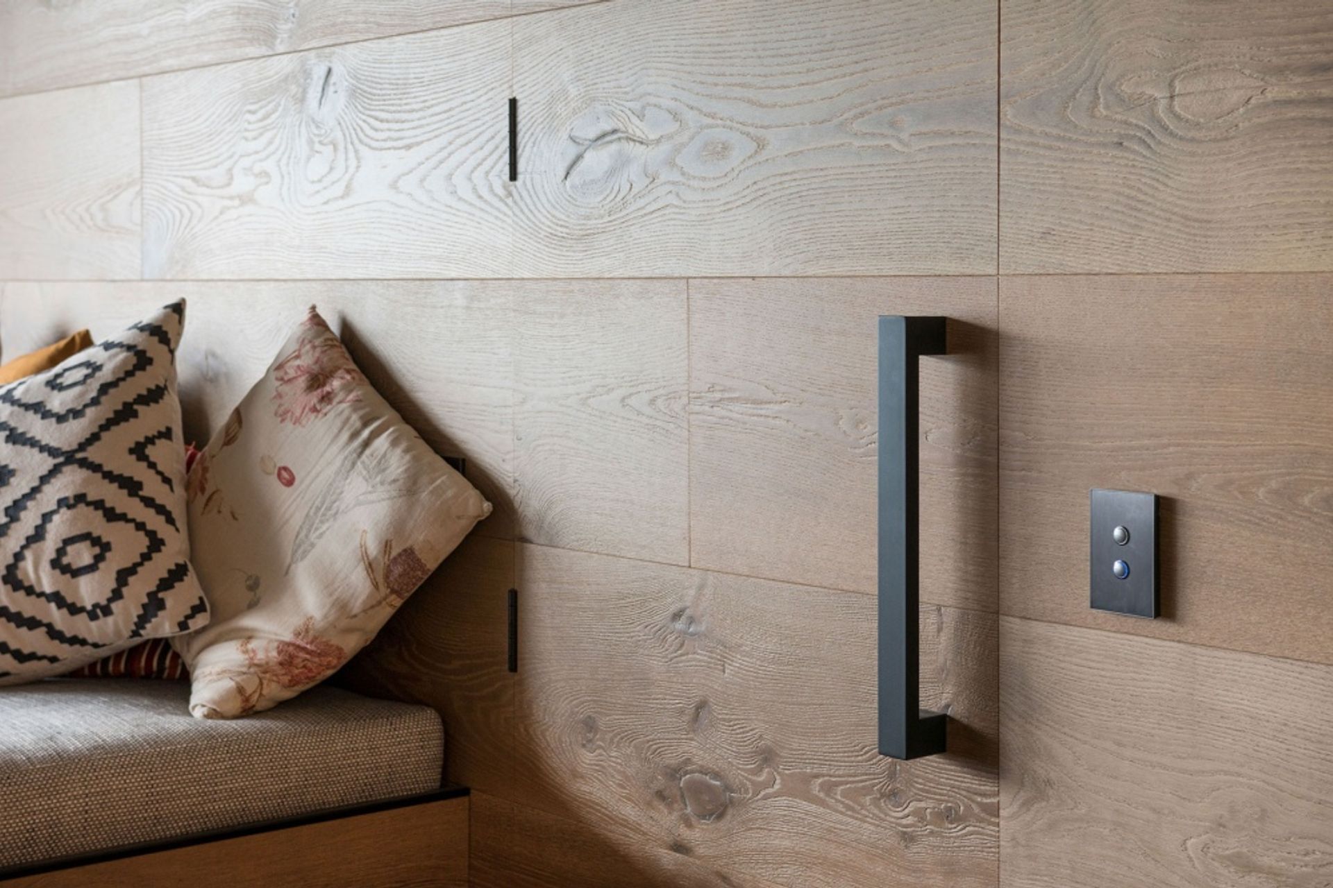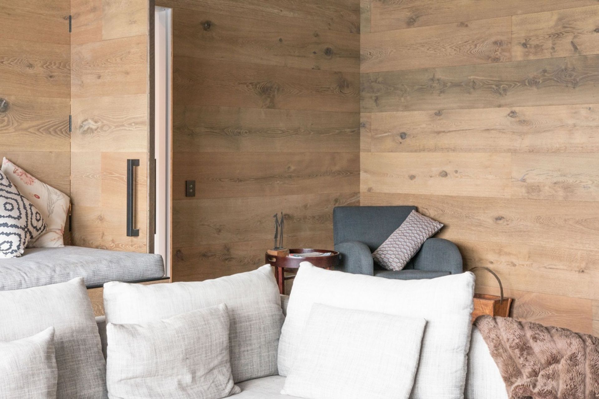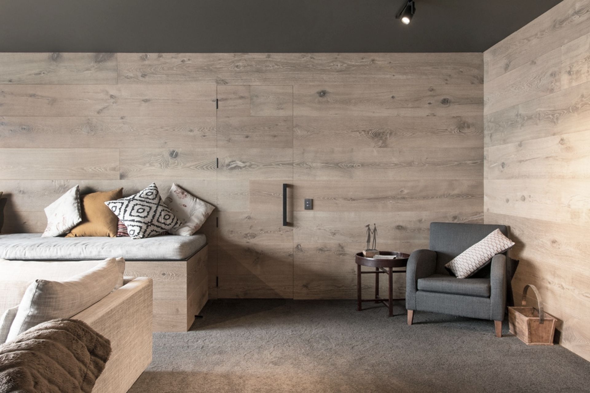 ArchiPro Project Summary - A luxurious private media room featuring tactile wide plank French Oak on all four walls, creating an inviting and sophisticated atmosphere for entertainment and relaxation.