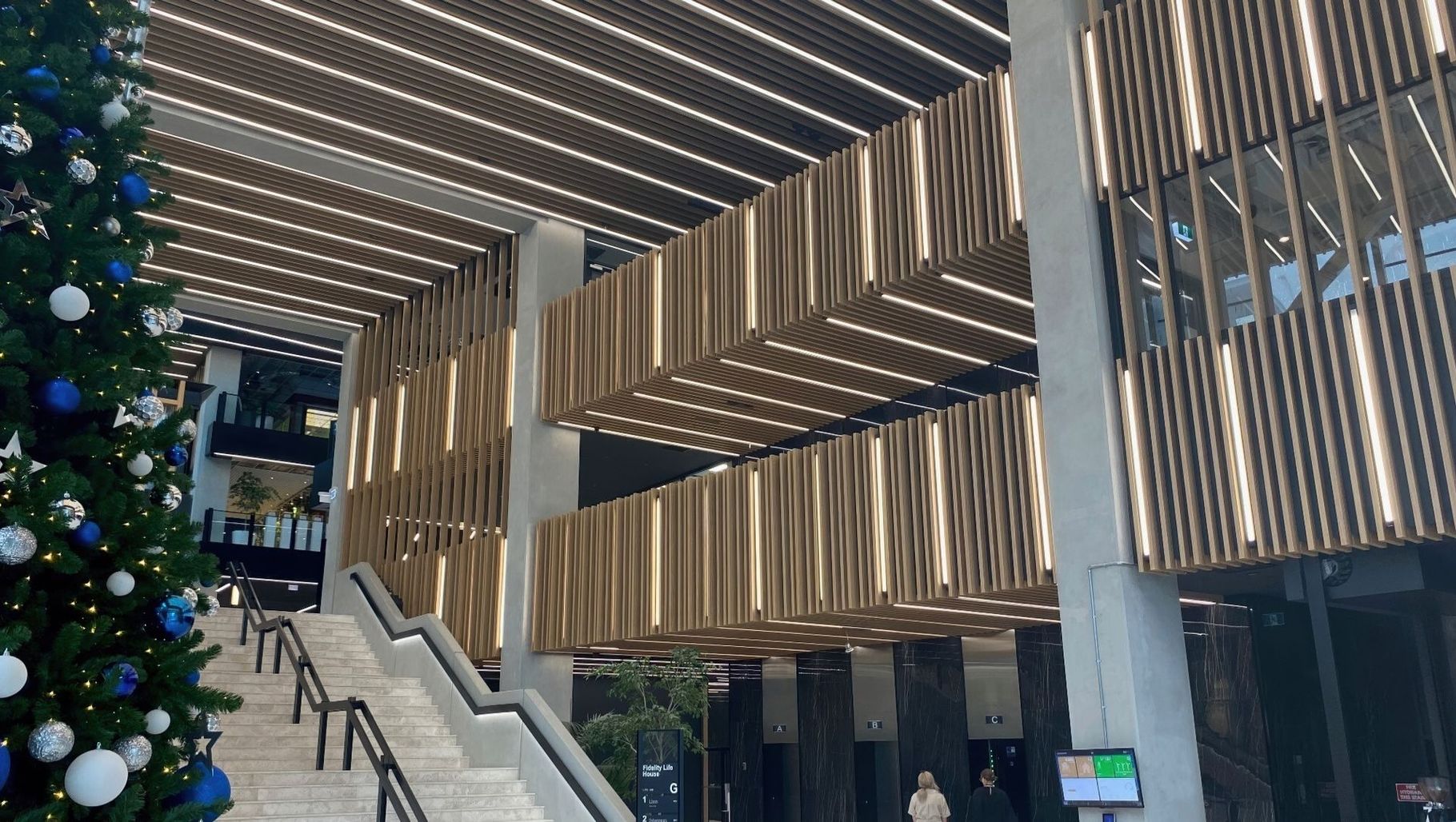 ArchiPro Project Summary - A cutting-edge 6 Green Star office building featuring extensive use of Metwood, enhancing the foyer and walkways with durable Vulcan Ullrich battens, ensuring a vibrant aesthetic while meeting fire safety standards.