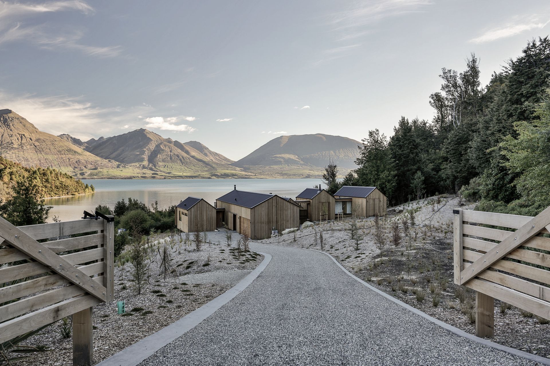 ArchiPro Project Summary - Contemporary family home featuring five pavilions, bespoke interiors, and extensive landscaping, harmoniously integrated into the stunning landscape above Lake Wakatipu.