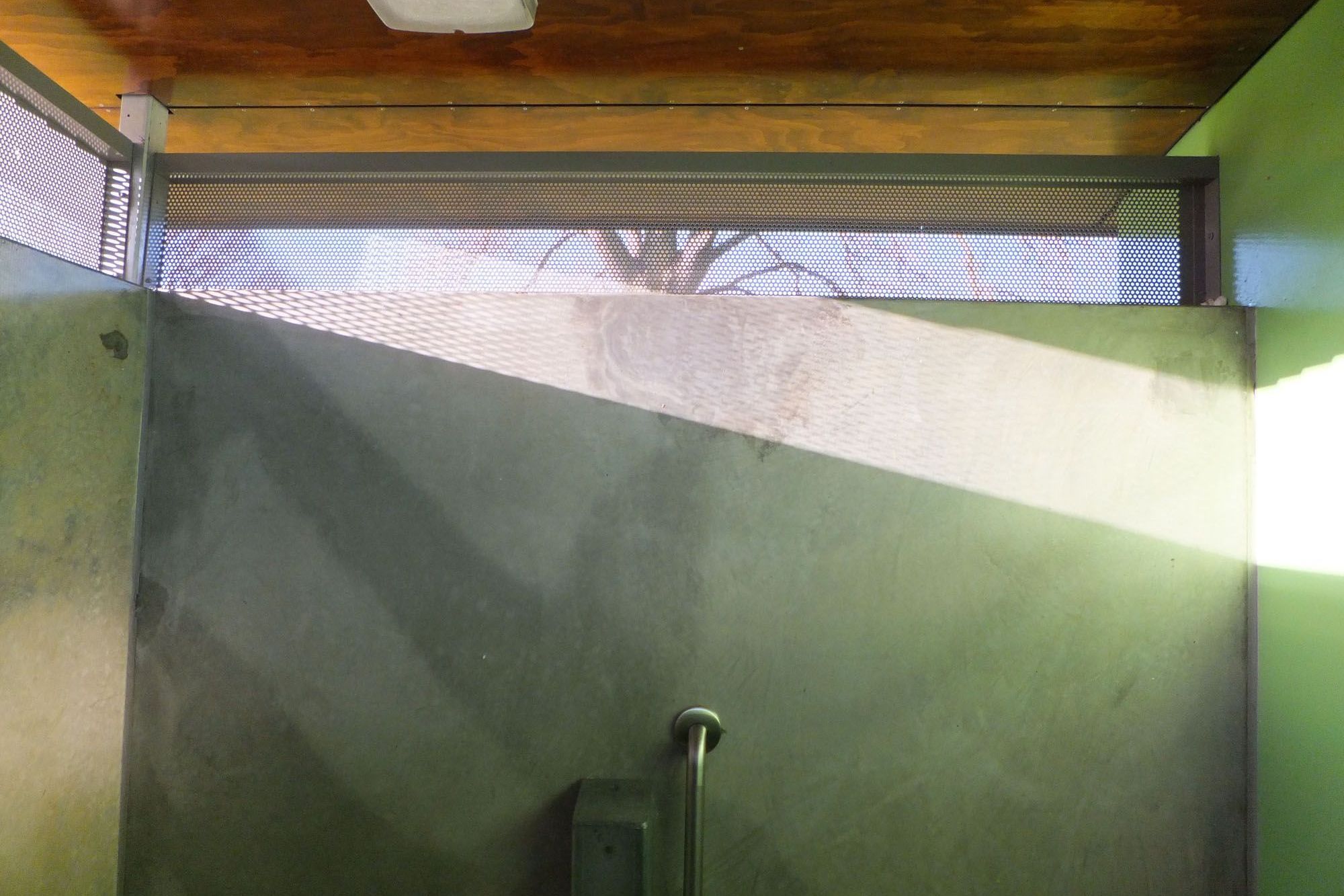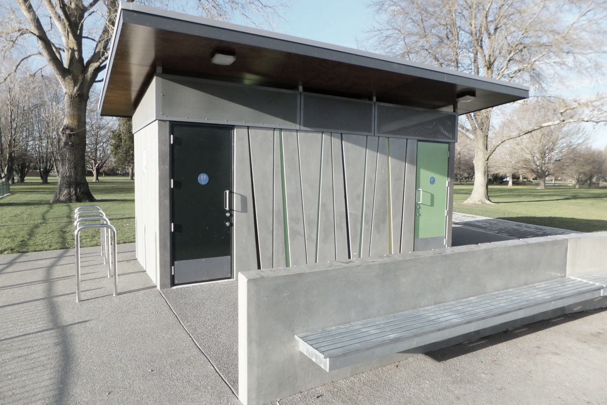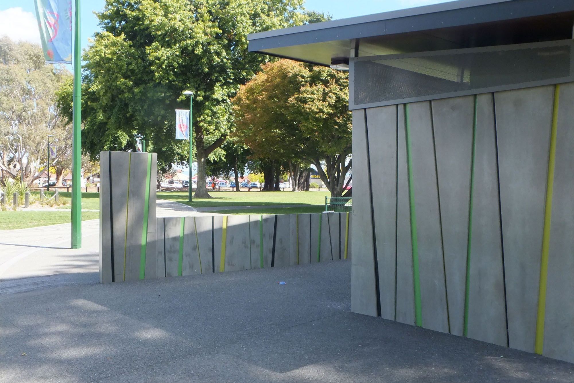 ArchiPro Project Summary - Flaxmere Park Toilets: A compact, innovative facility that enhances park experience through airy design, featuring robust precast concrete walls adorned with variegated flax-inspired colors, complemented by a functional lobby area with seating and a drinking fountain.