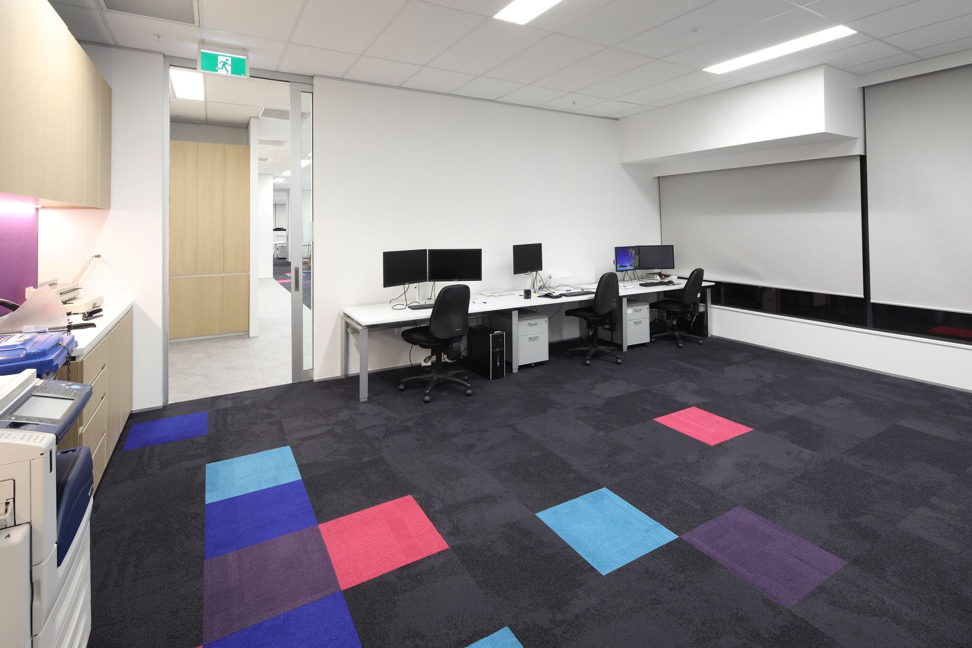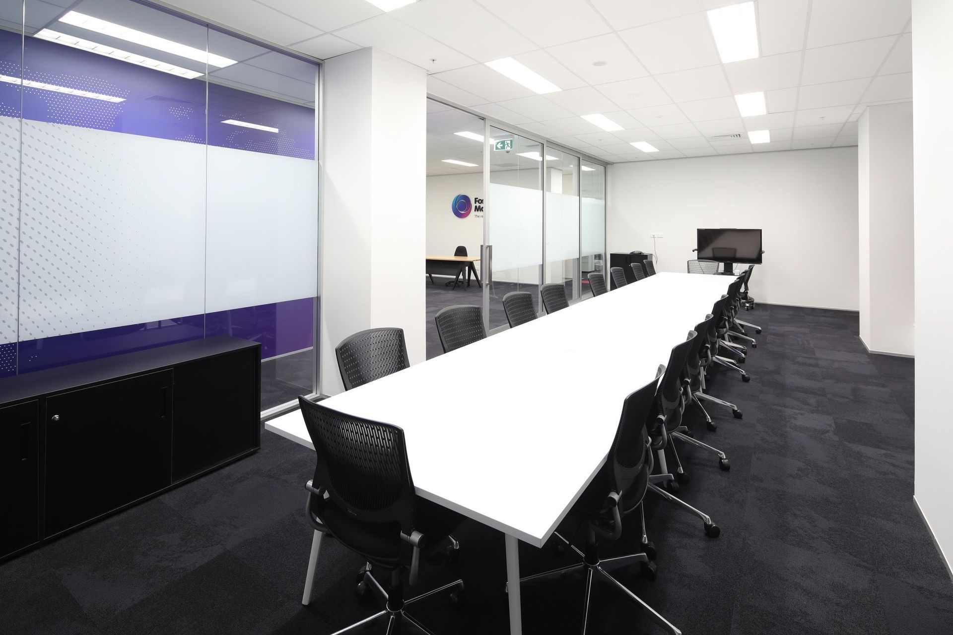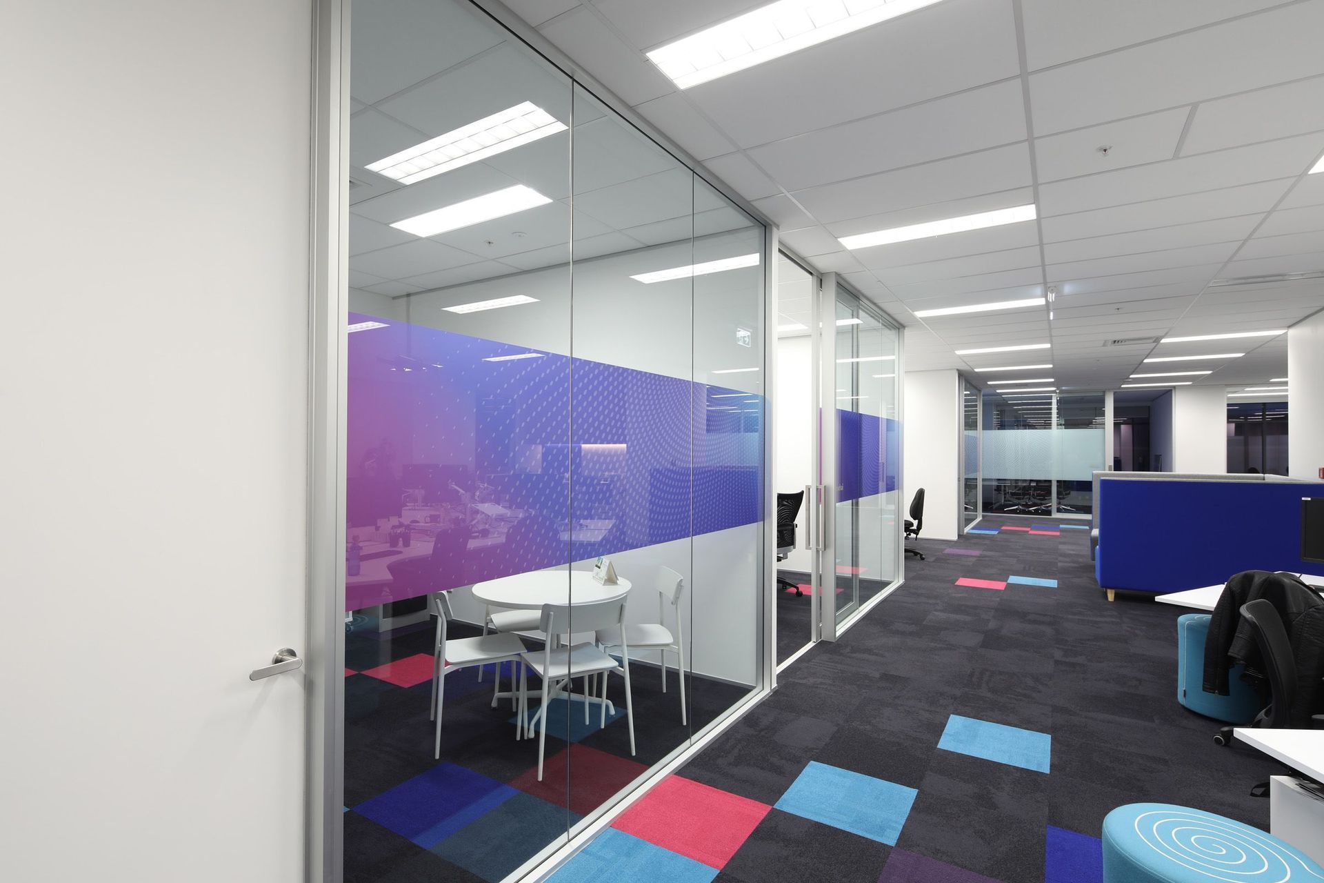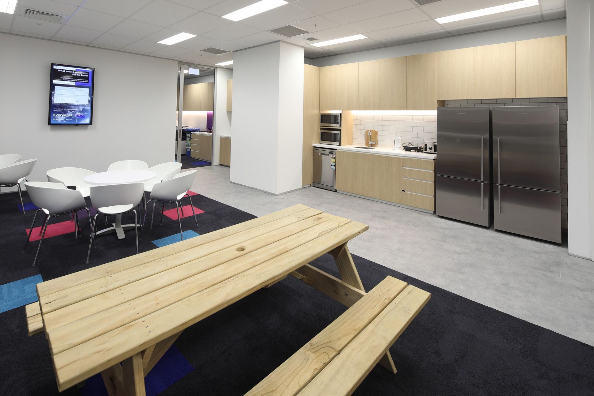 ArchiPro Project Summary - Comprehensive fit-out for Foster Moore featuring modern staff areas and kitchen, coordinated construction works including partitions, ceilings, and flooring, enhanced by vibrant carpets reflecting the Foster Moore branding.