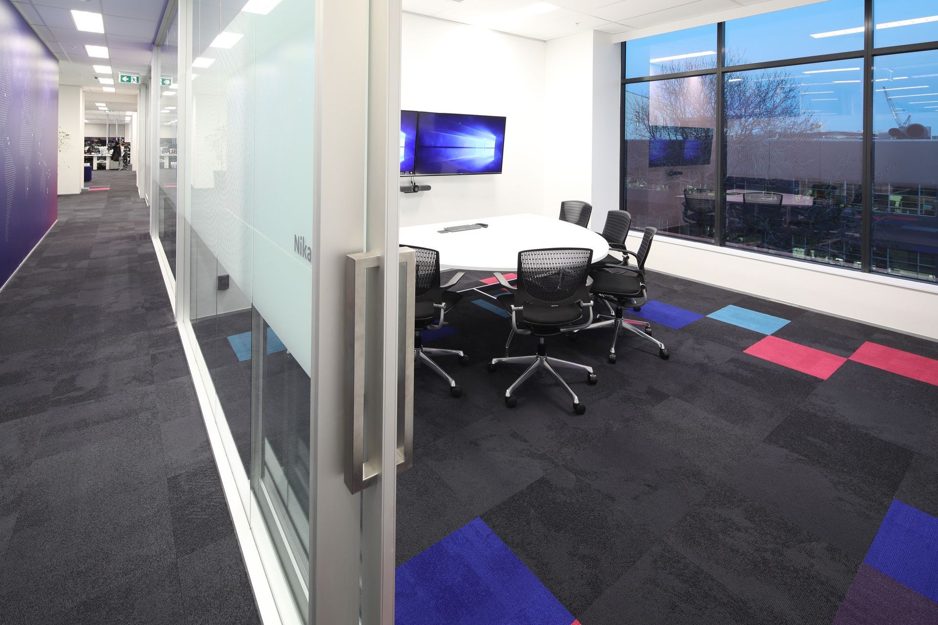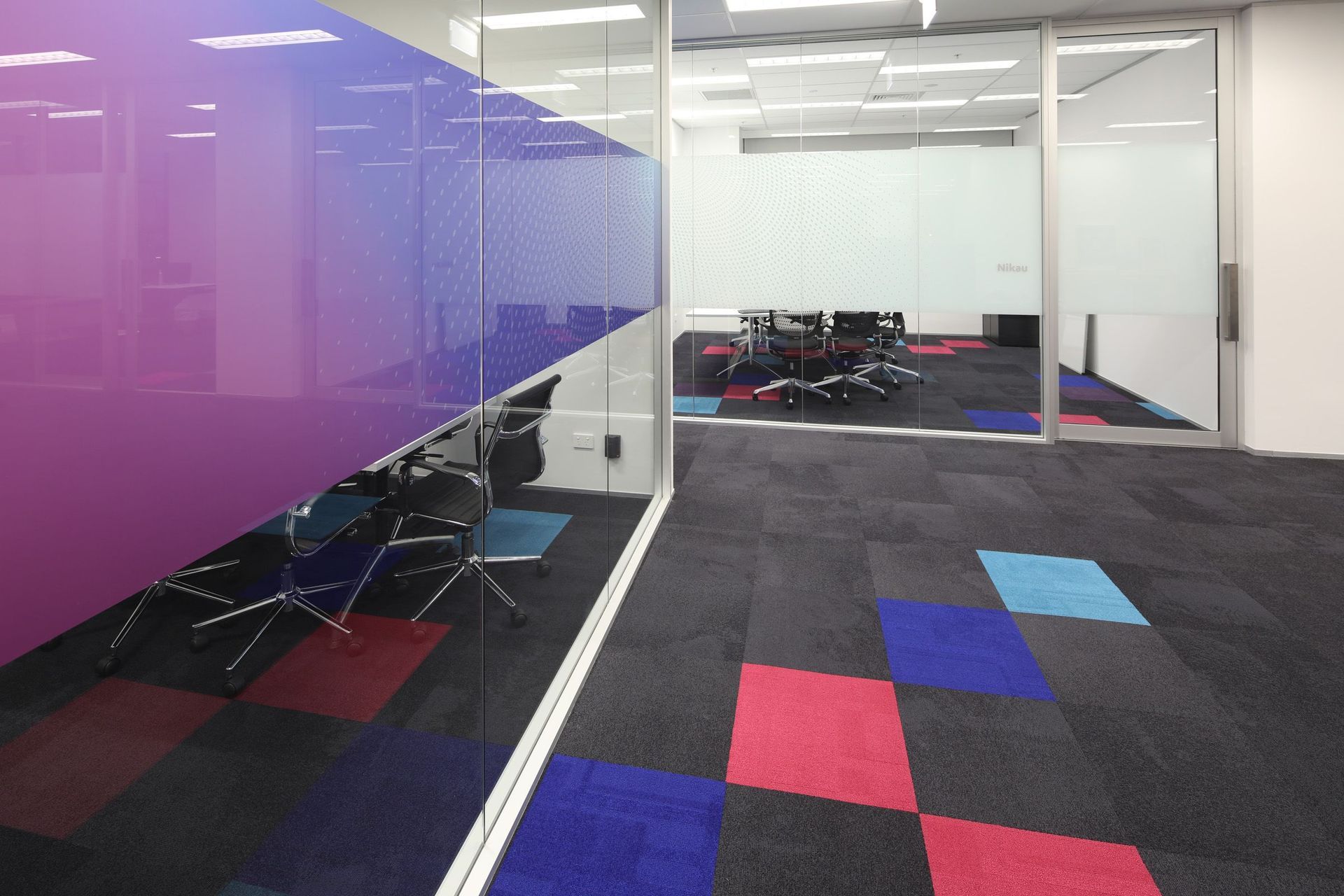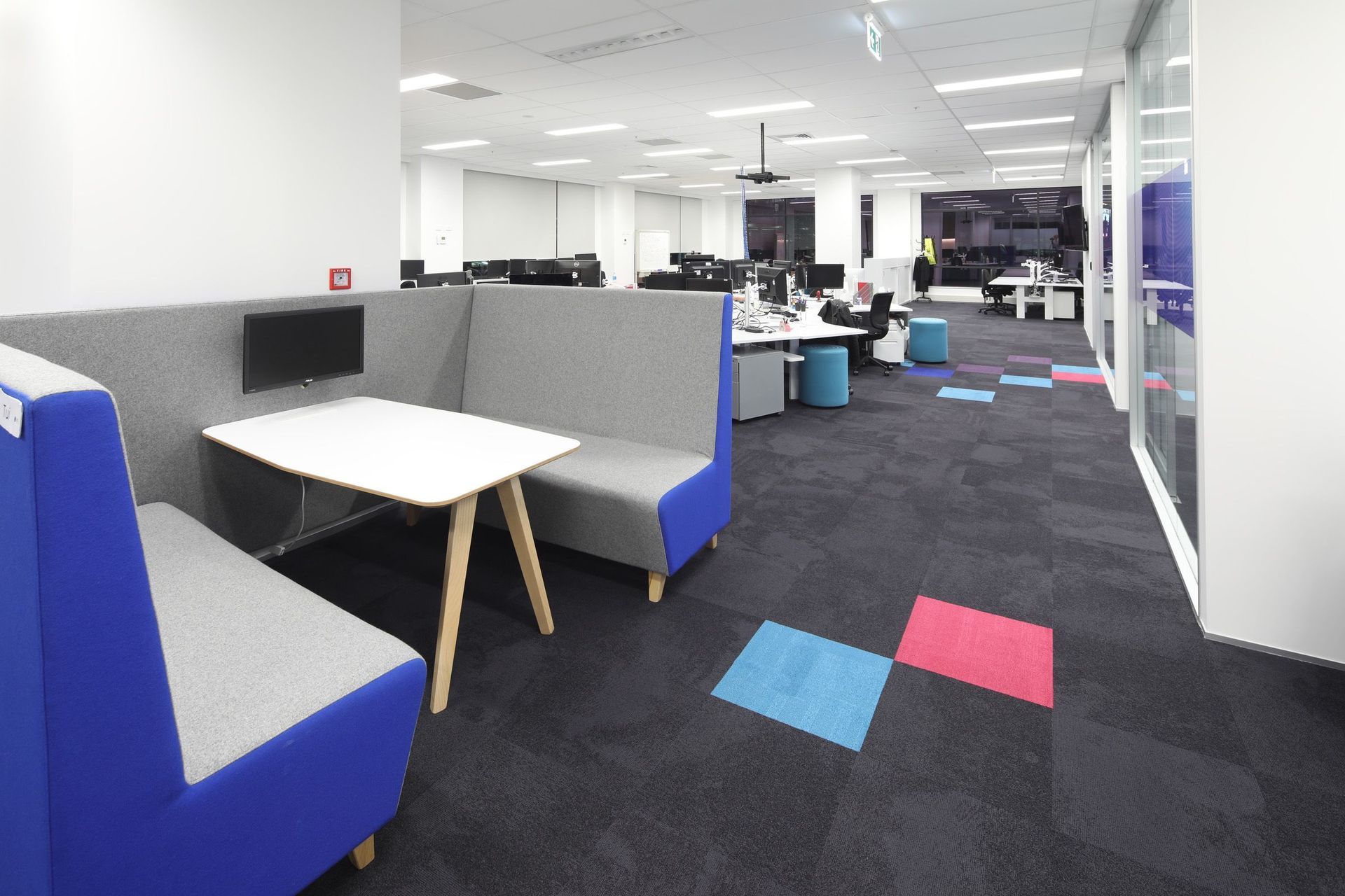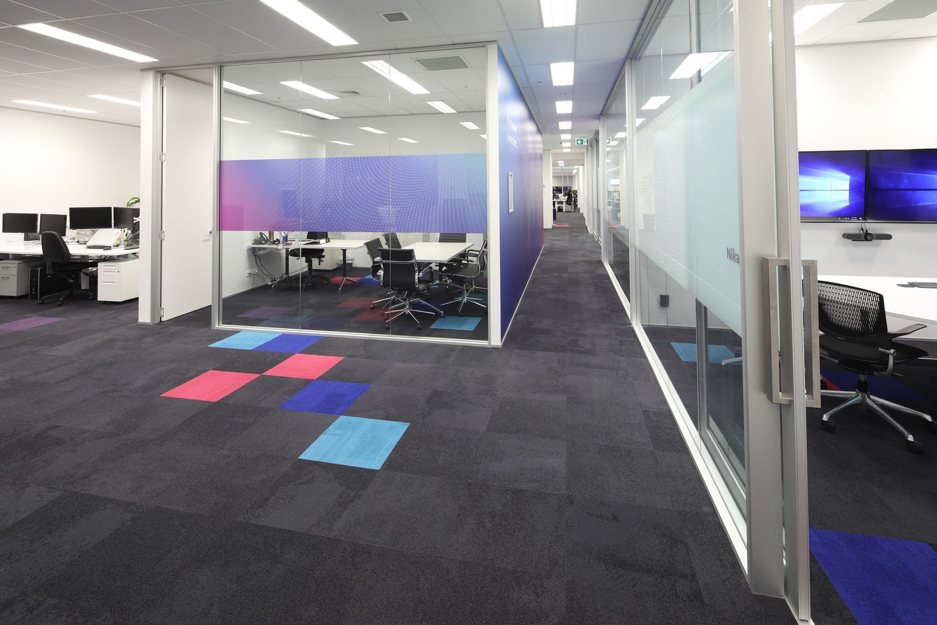 ArchiPro Project Summary - Comprehensive fit-out for Foster Moore featuring modern staff areas and kitchen, coordinated construction works including partitions, ceilings, and flooring, enhanced by vibrant carpets reflecting the Foster Moore branding.