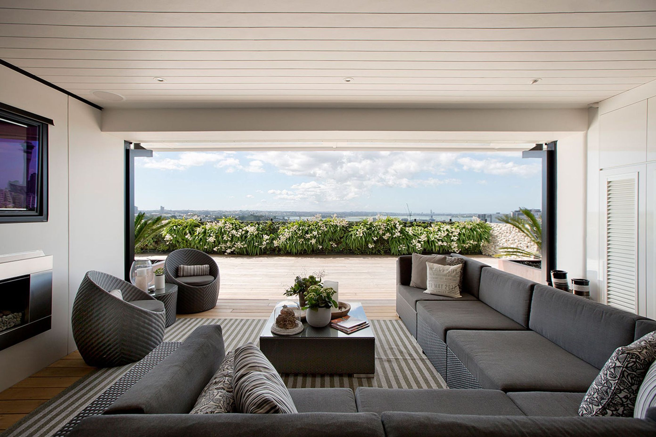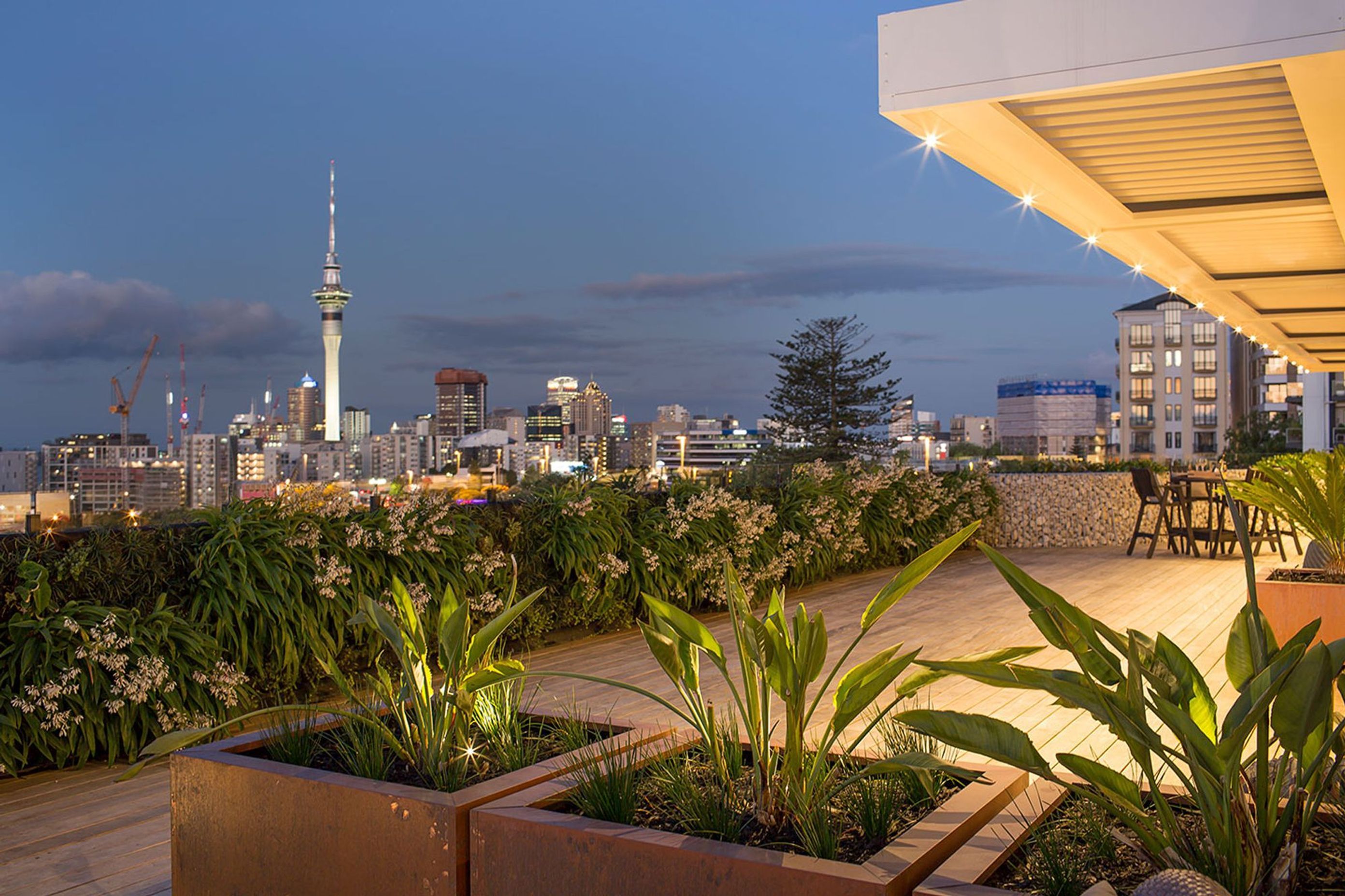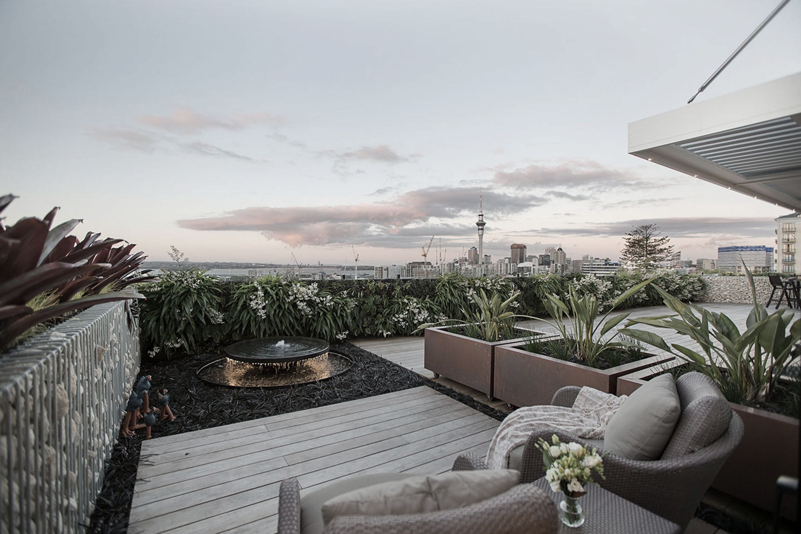 ArchiPro Project Summary - Innovative rooftop landscape design featuring a green wall, timber deck, and custom water feature, enhancing city views while providing a tranquil outdoor space for entertaining in Auckland's vibrant Freemans Bay.