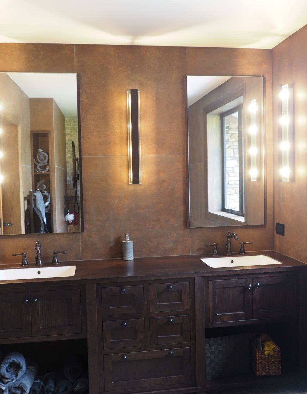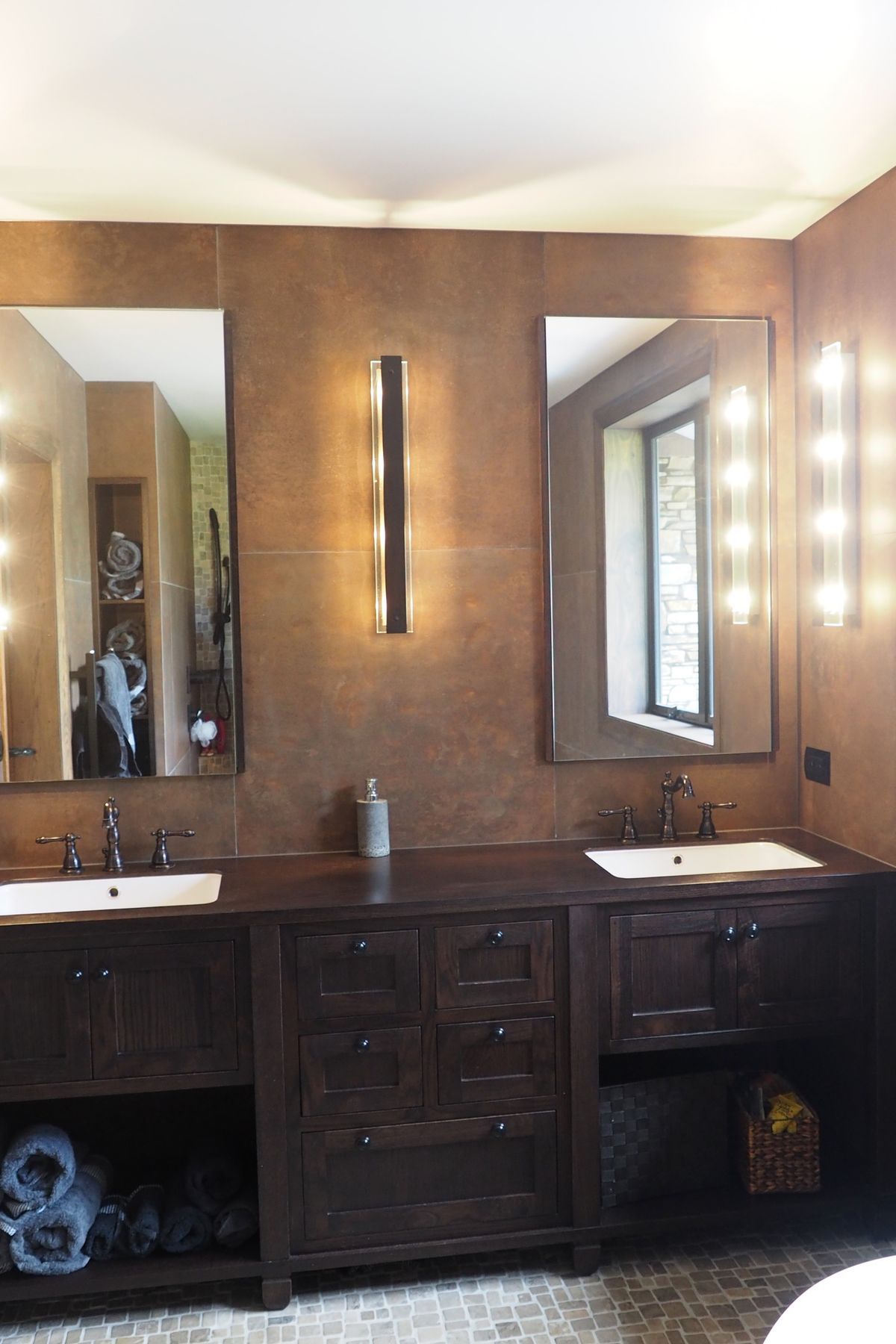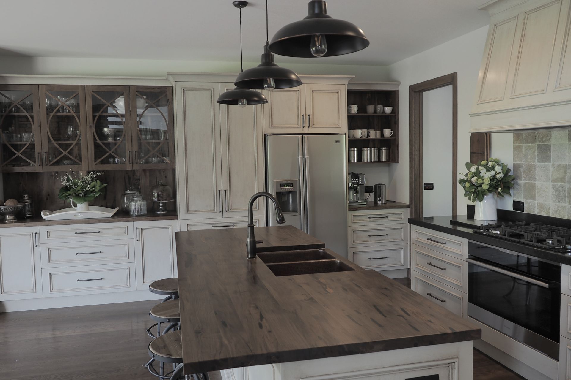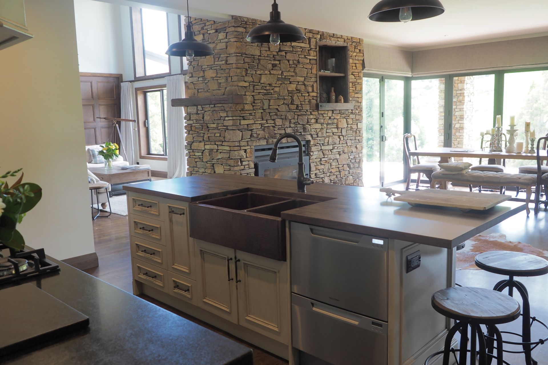 ArchiPro Project Summary - A stunning kitchen transformation featuring a distressed lacquered finish, complemented by elegant stains and lacquered doors and vanities, showcasing a harmonious blend of copper, stone, and timber elements.