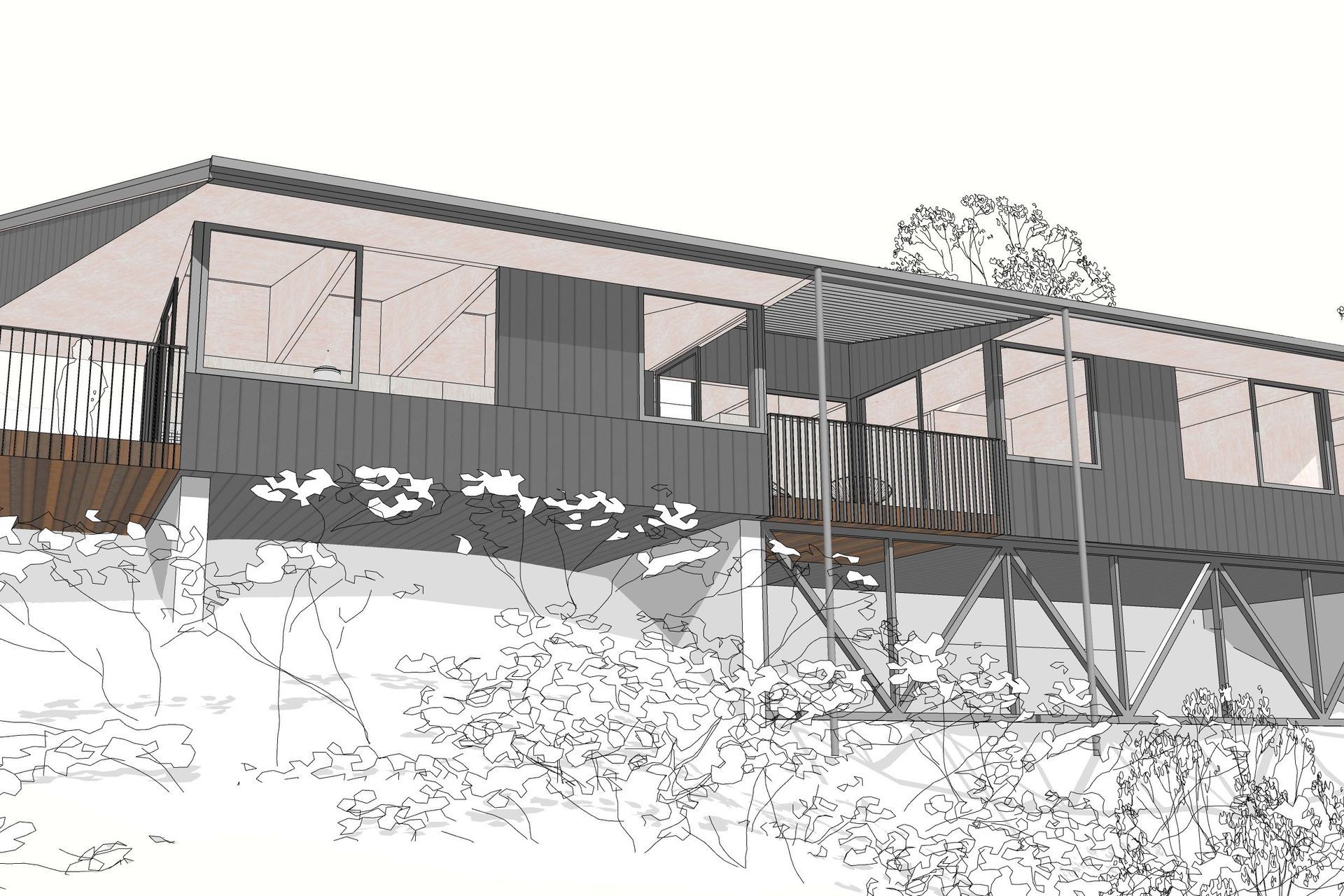 ArchiPro Project Summary - A compact, timber-structured home designed for a couple and their dogs, skillfully positioned on a steep slope to ensure stability, privacy, and stunning northern valley views, featuring a central sheltered deck for outdoor living.