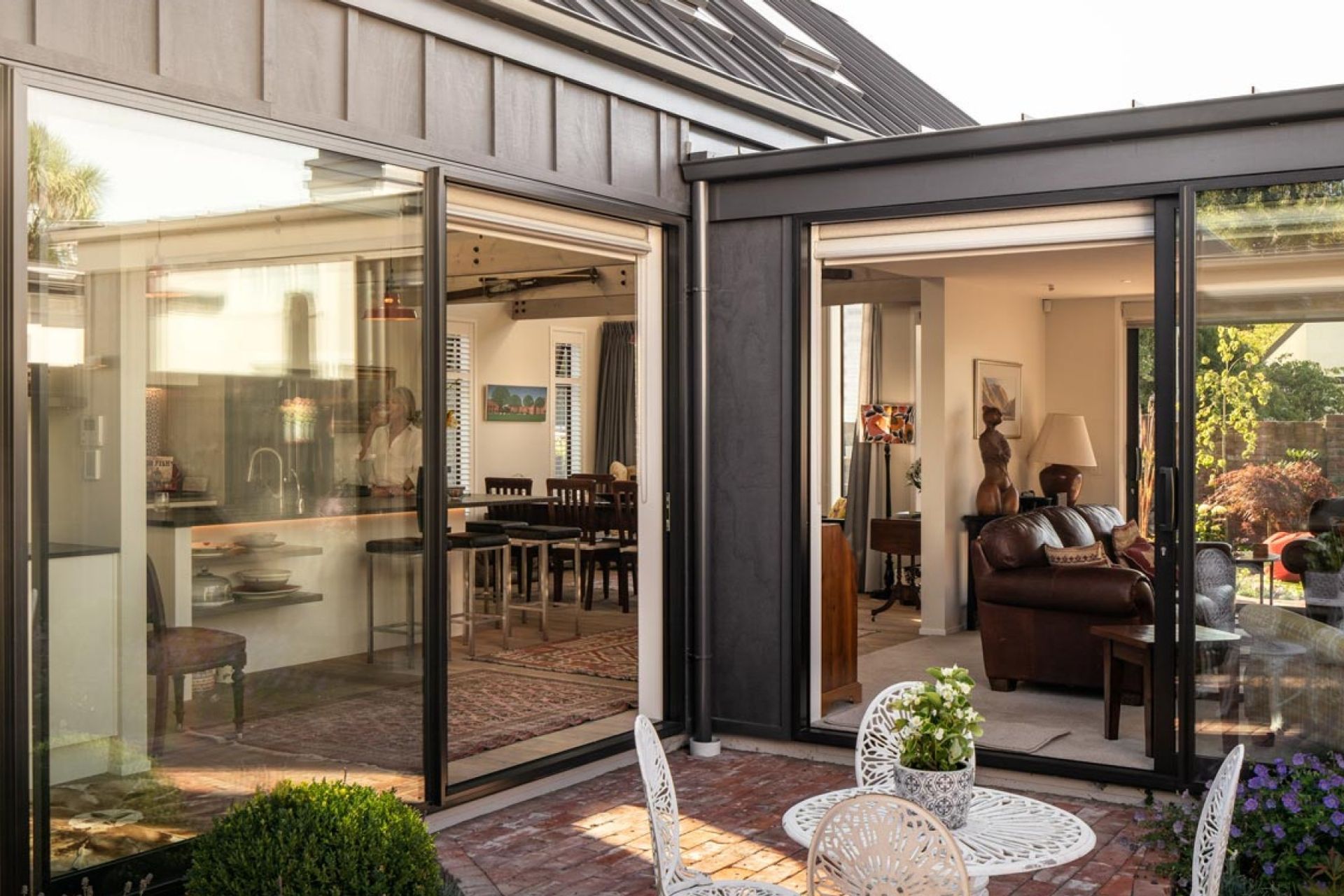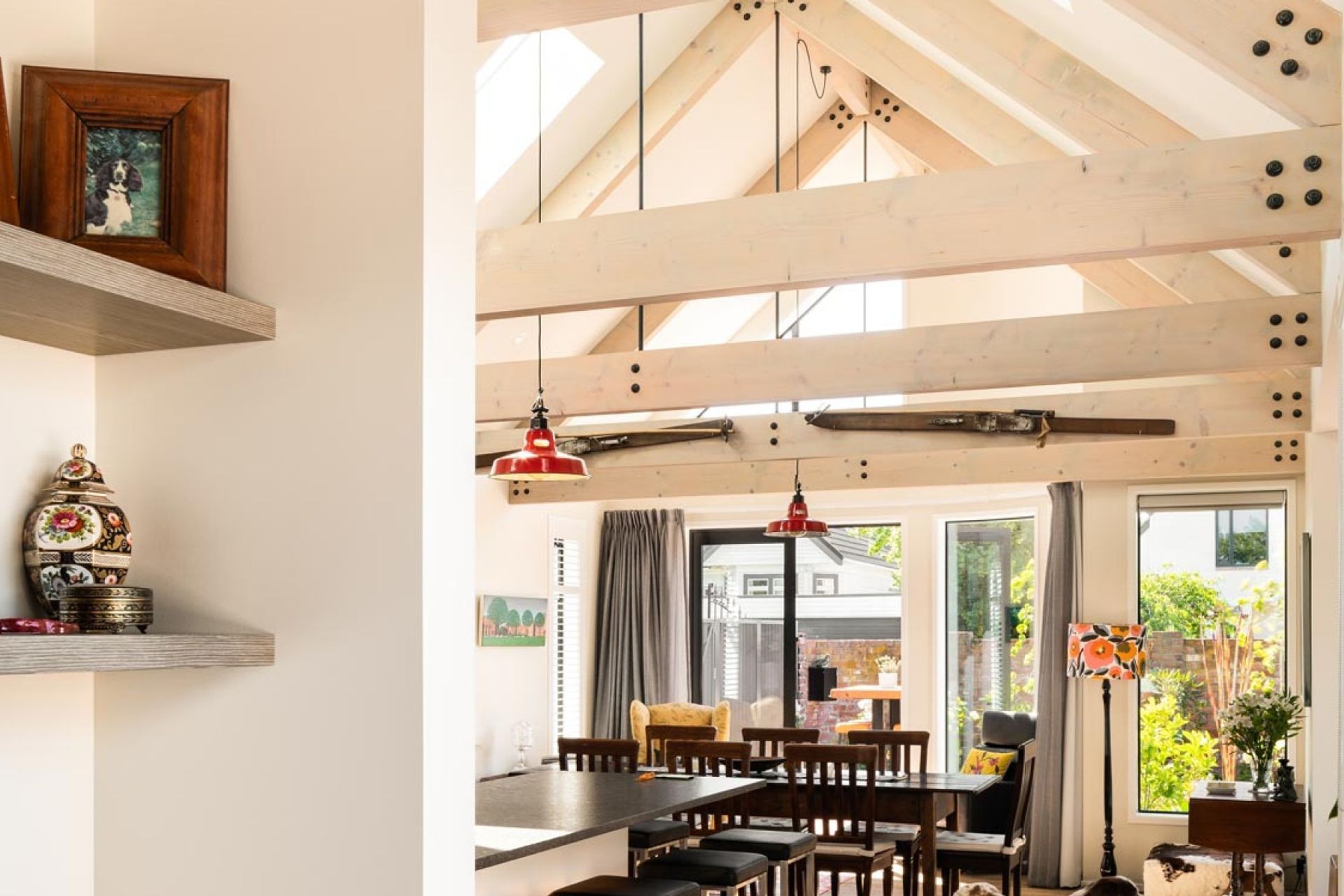 ArchiPro Project Summary - A luxurious 3-bedroom, 2-bathroom home in Fendalton, featuring a cottage garden, custom kitchen with scullery, and elegant design elements including handcrafted oak beams and curved windows, all within a cohesive and stylish interior and exterior palette.