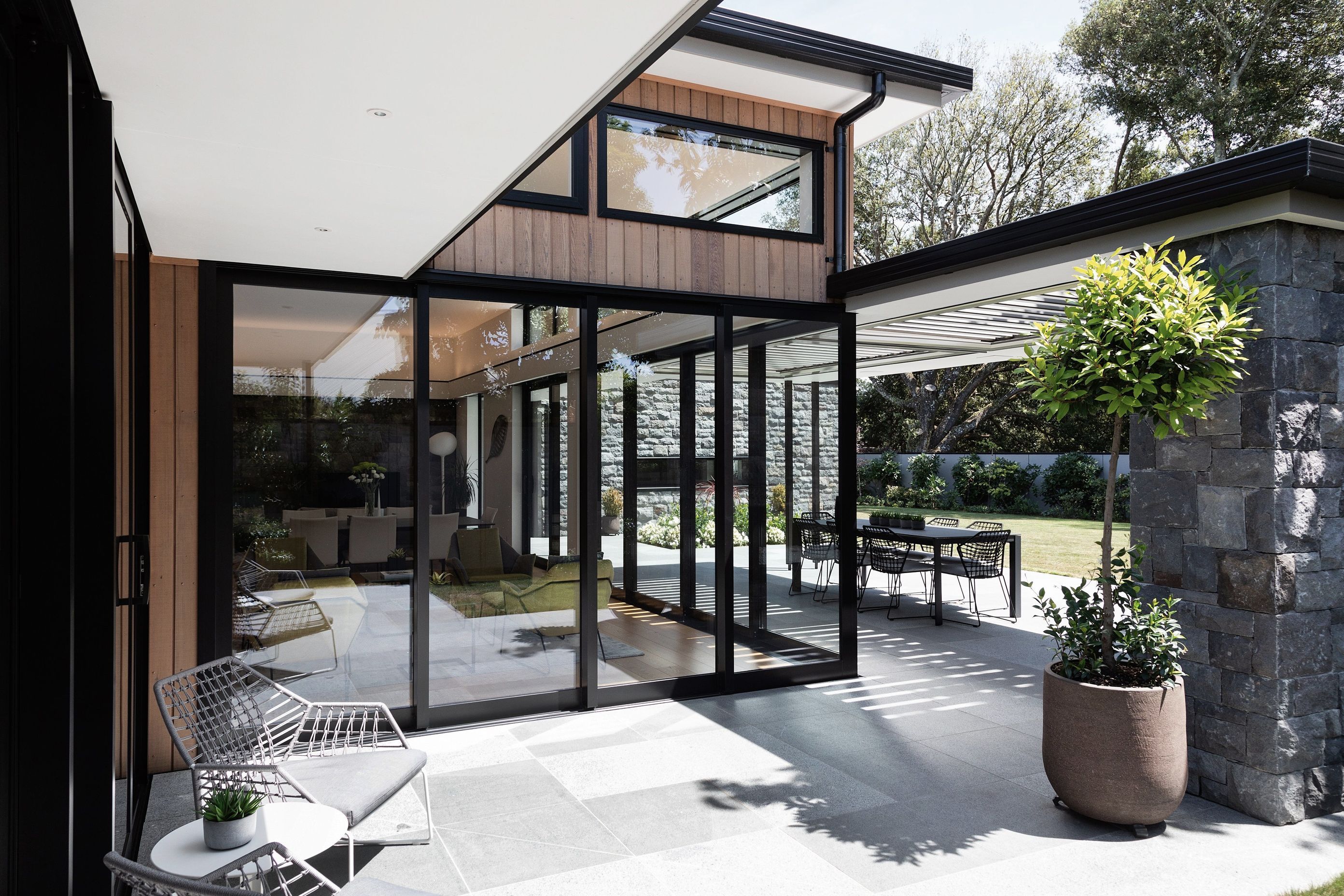ArchiPro Project Summary - A thoughtfully designed retreat in New Plymouth, harmonizing with its natural surroundings through sustainable principles and a balanced layout, featuring distinct public and private zones separated by a traditional Taranaki river stone wall.