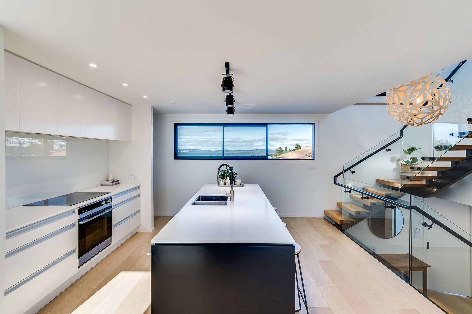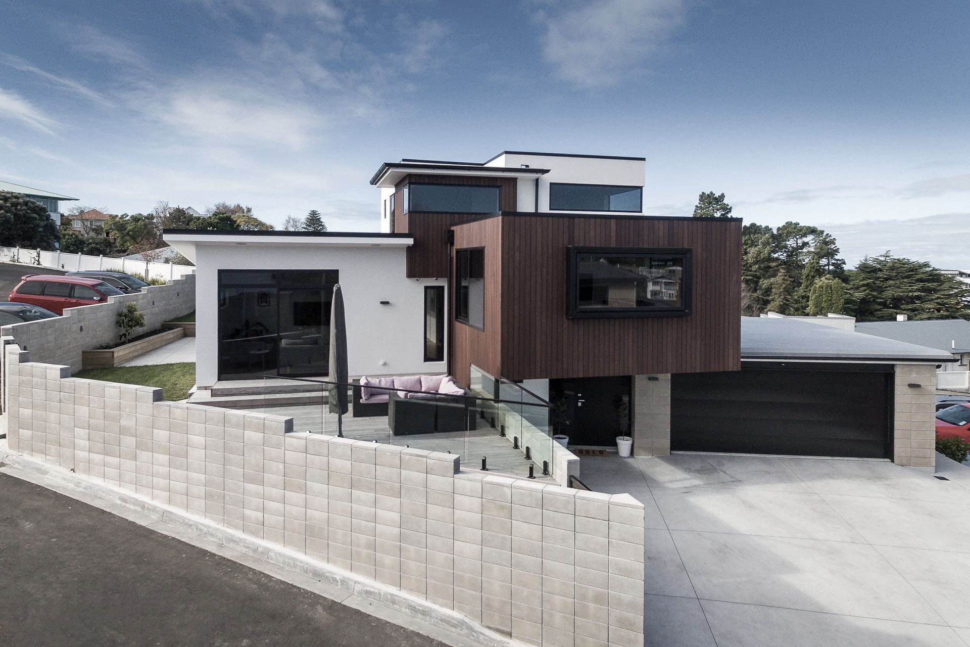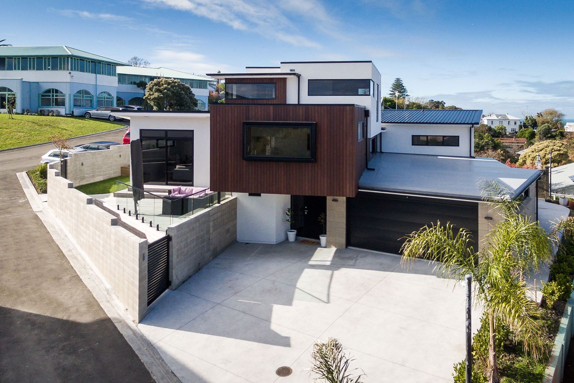 ArchiPro Project Summary - Dynamic architectural family home featuring clean angles, stunning views, and a contemporary design, complete with a spacious kitchen, multiple entertaining areas, and luxurious master suite, set on an elevated site above Napier.
