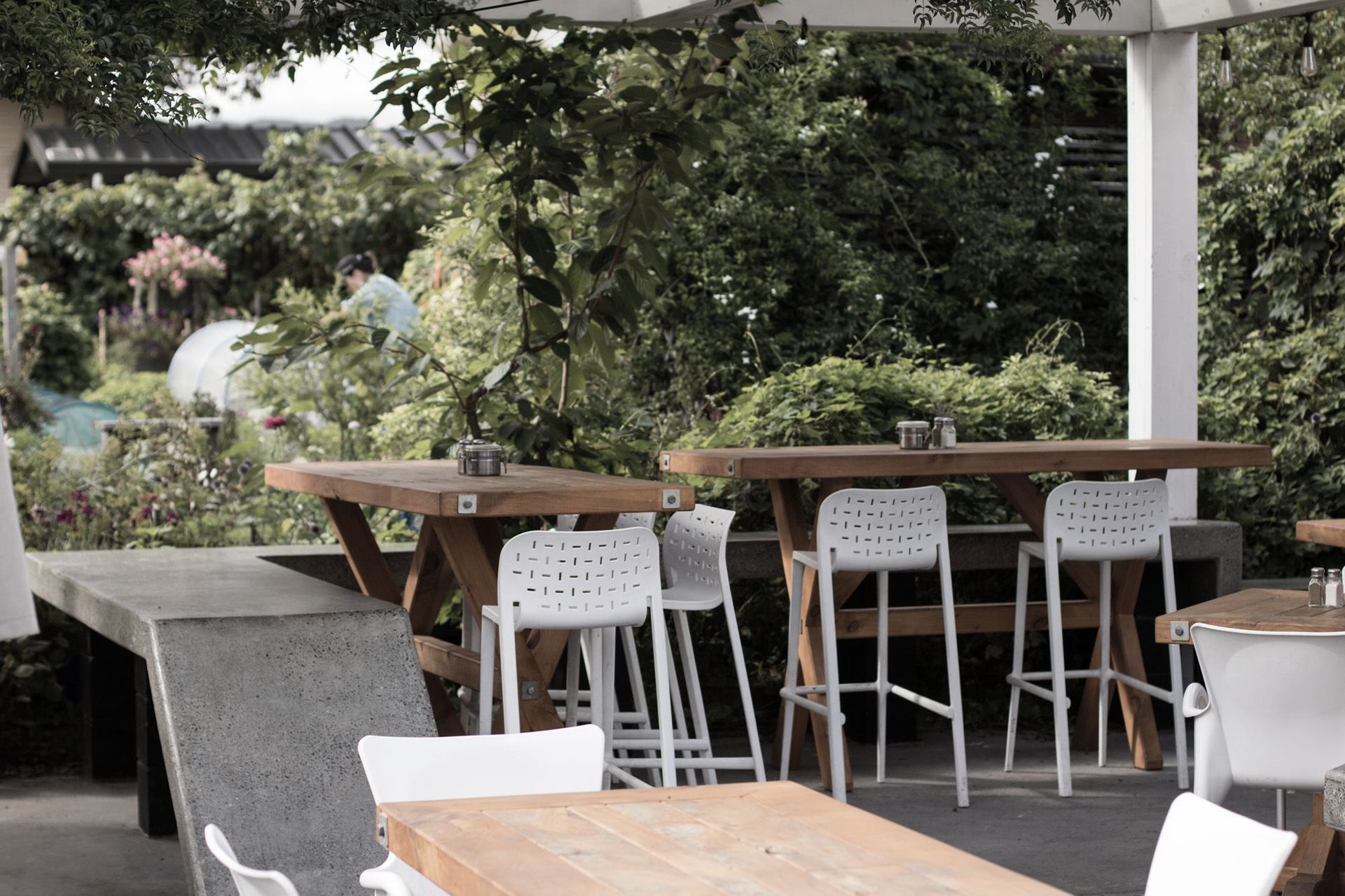 ArchiPro Project Summary - A beautifully designed garden bar at Waikanae beach, featuring an outdoor fire, heated concrete seating, and bespoke hardwood tables, creating an inviting sun-drenched space perfect for leisurely afternoons and intimate evenings.