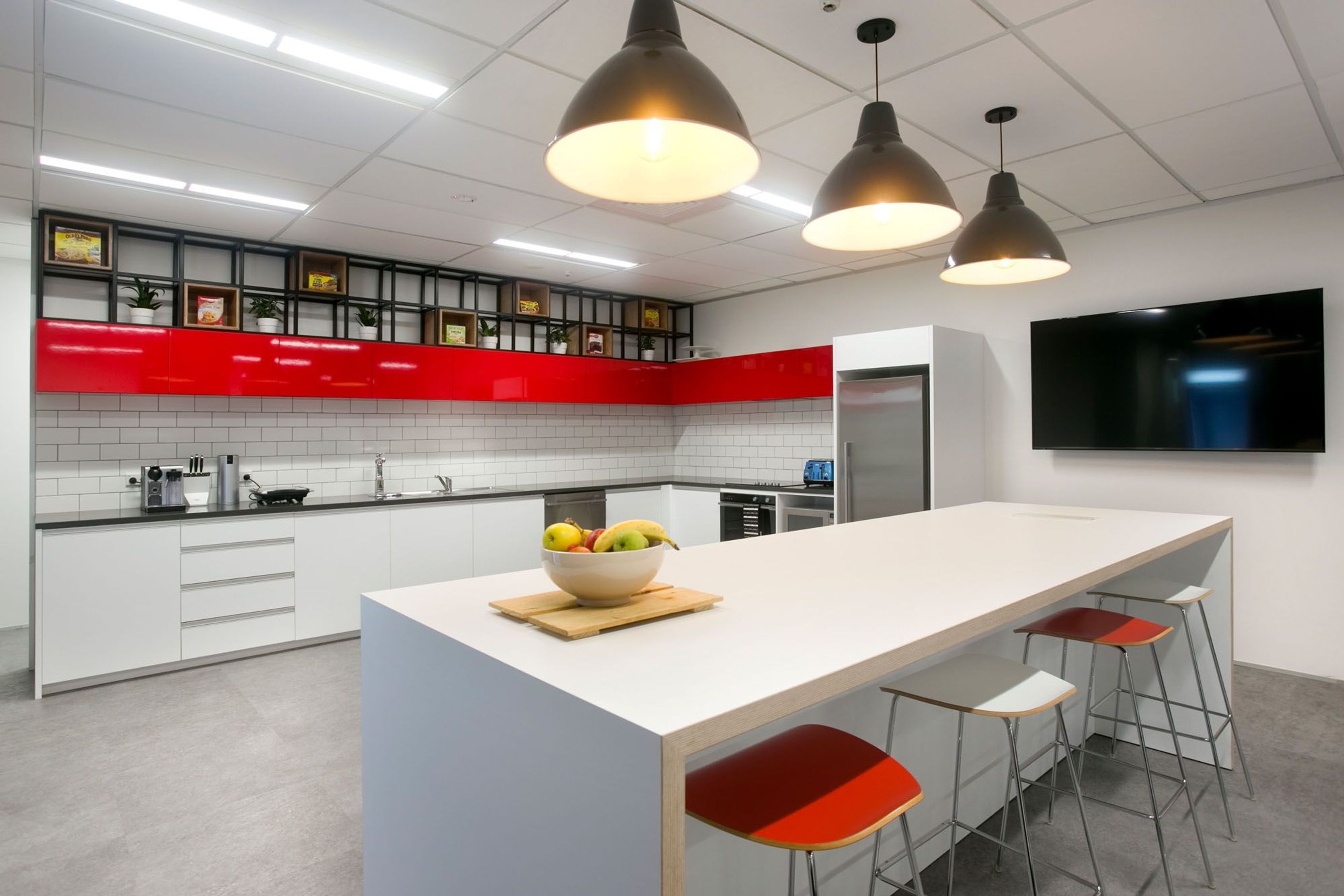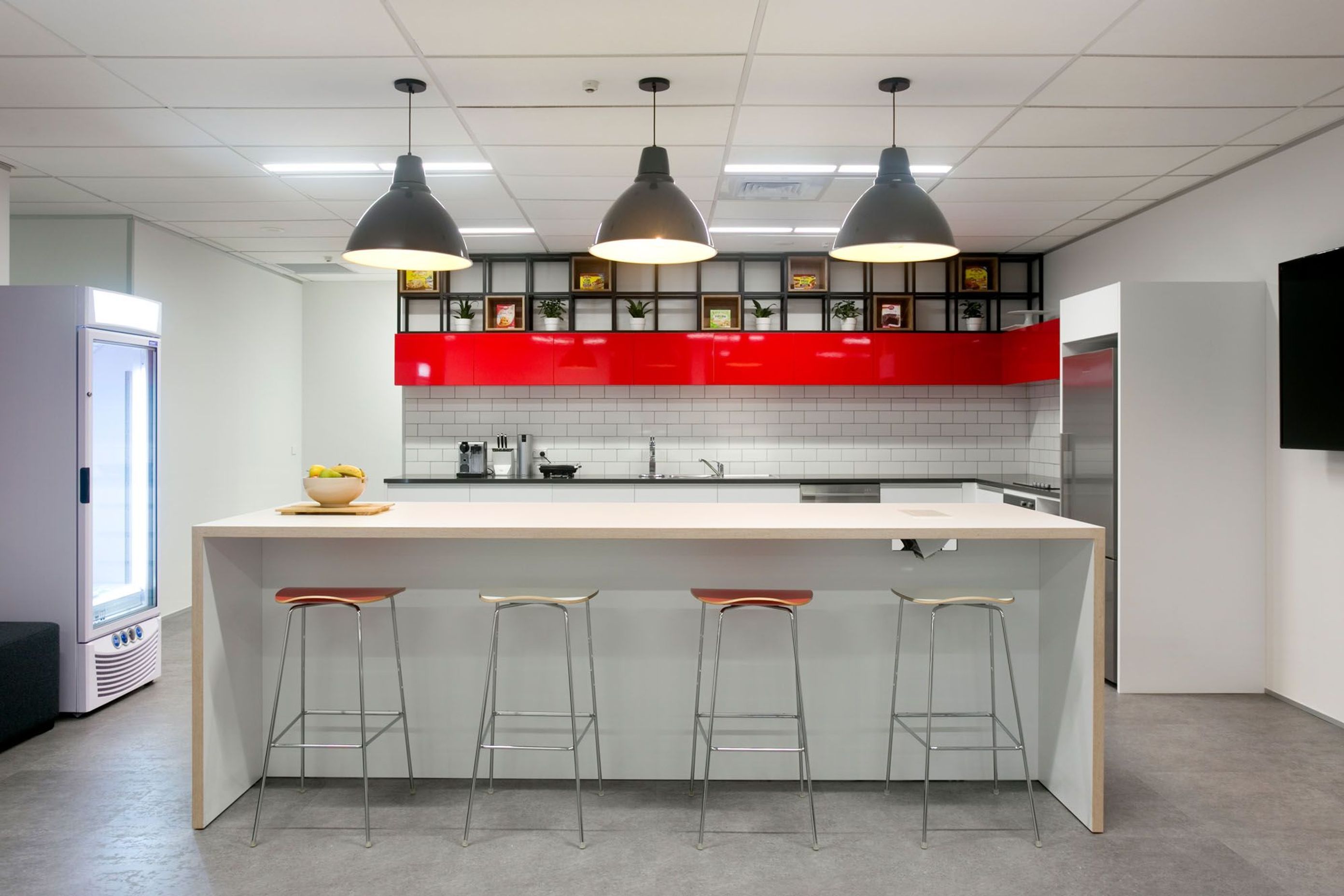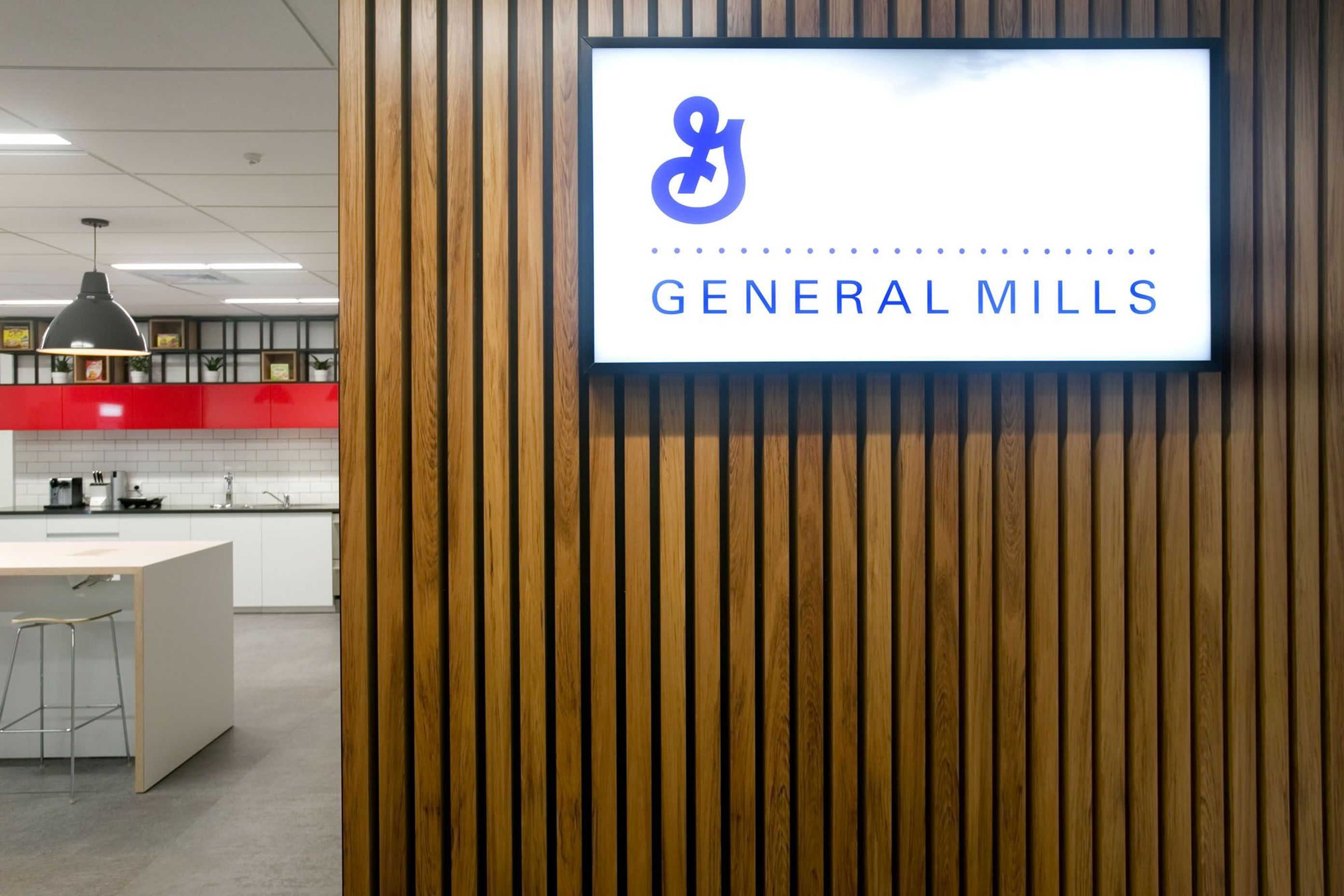 ArchiPro Project Summary - Office fitout for General Mills featuring collaborative spaces, meeting rooms, and a vibrant open kitchen, completed in 2016 with extensive coordination across international teams to meet specific IT and design requirements.