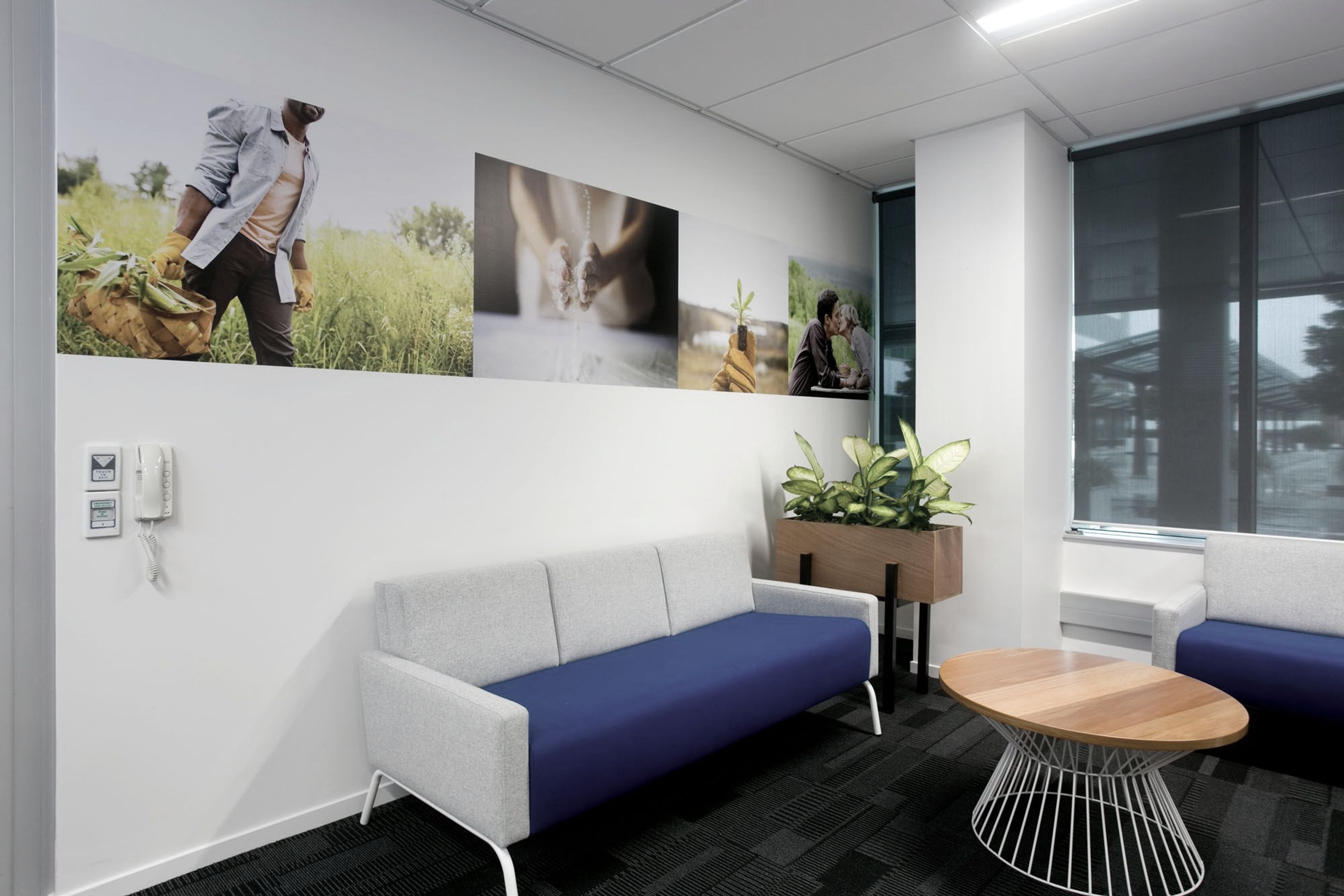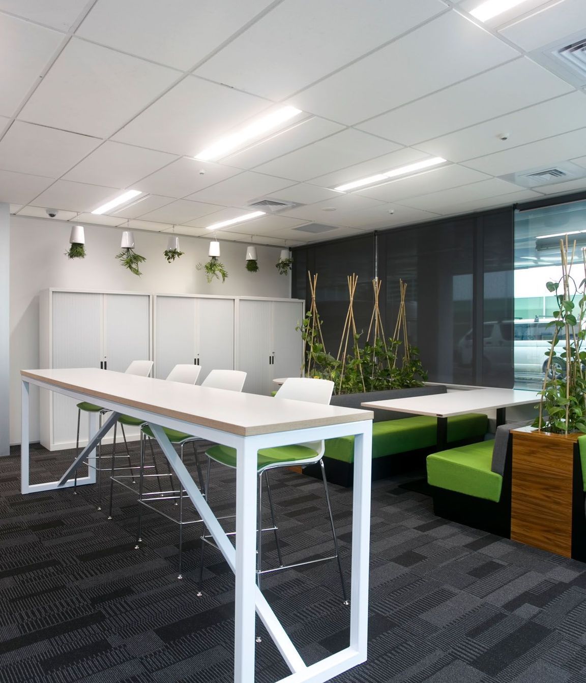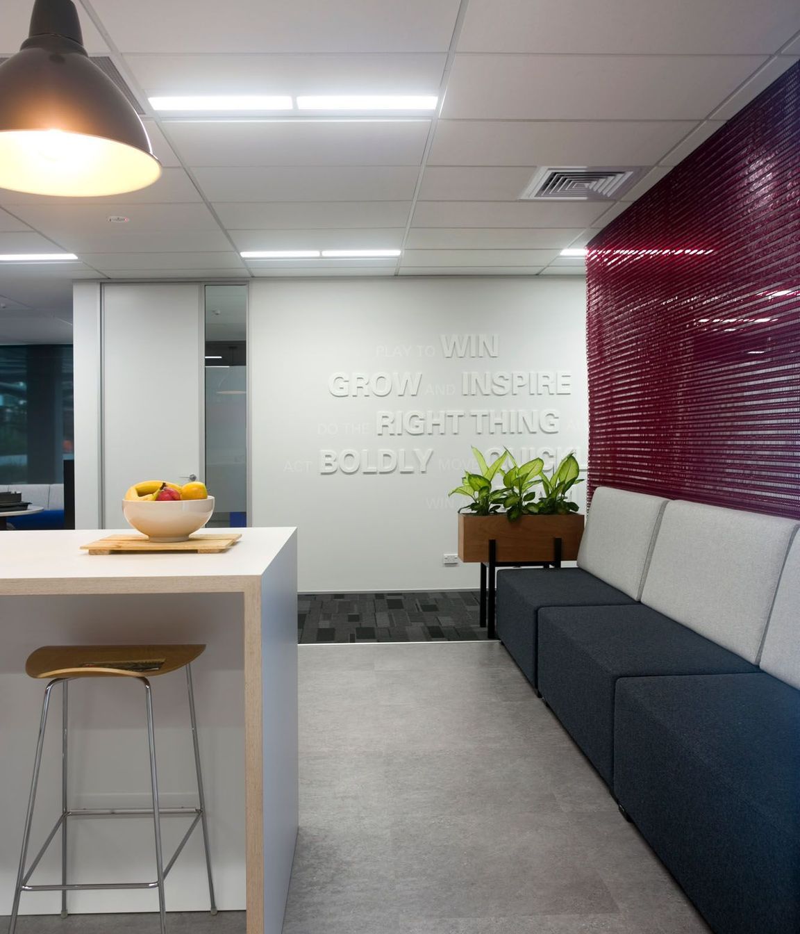 ArchiPro Project Summary - Office fitout for General Mills featuring collaborative spaces, meeting rooms, and a vibrant open kitchen, completed in 2016 with extensive coordination across international teams to meet specific IT and design requirements.