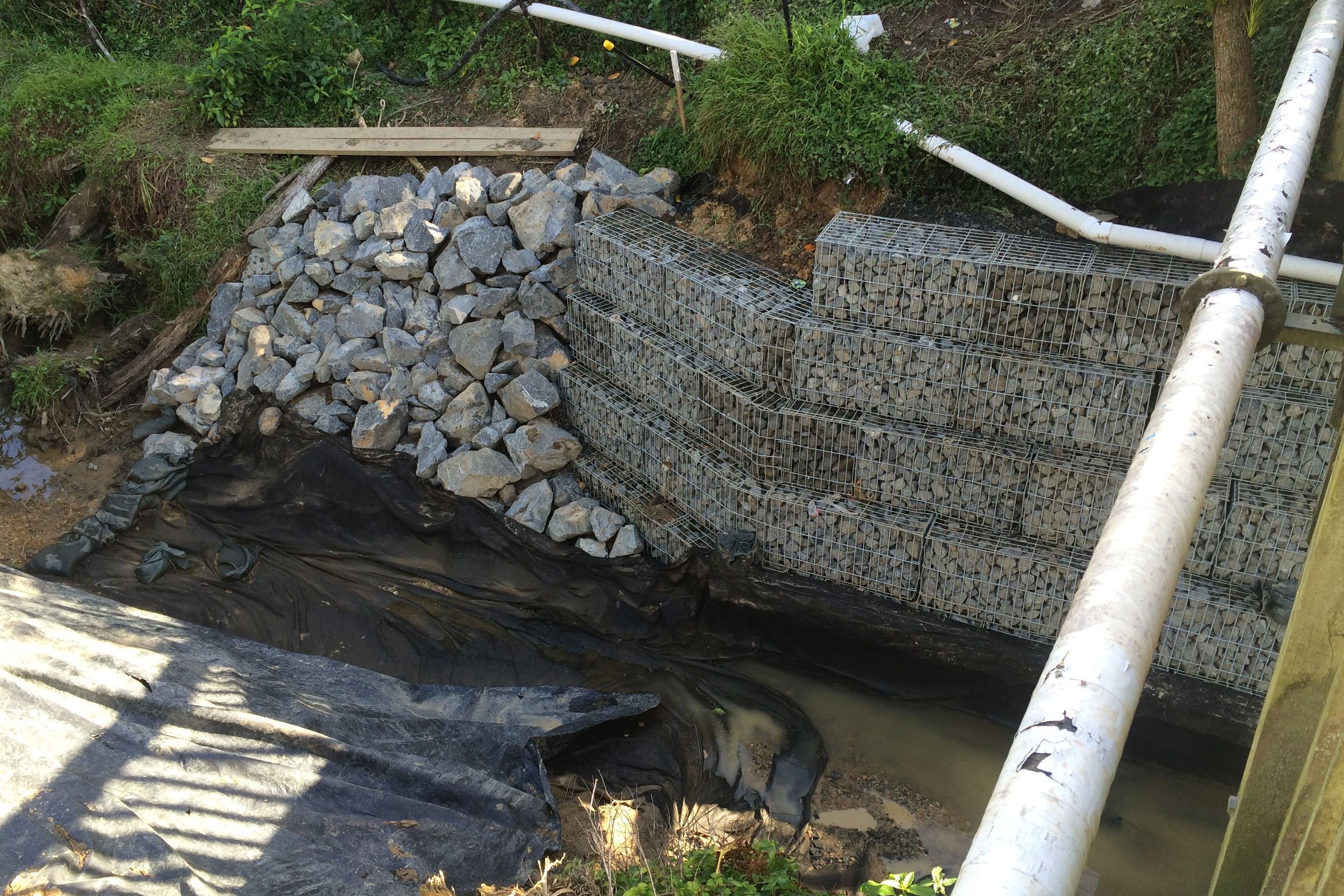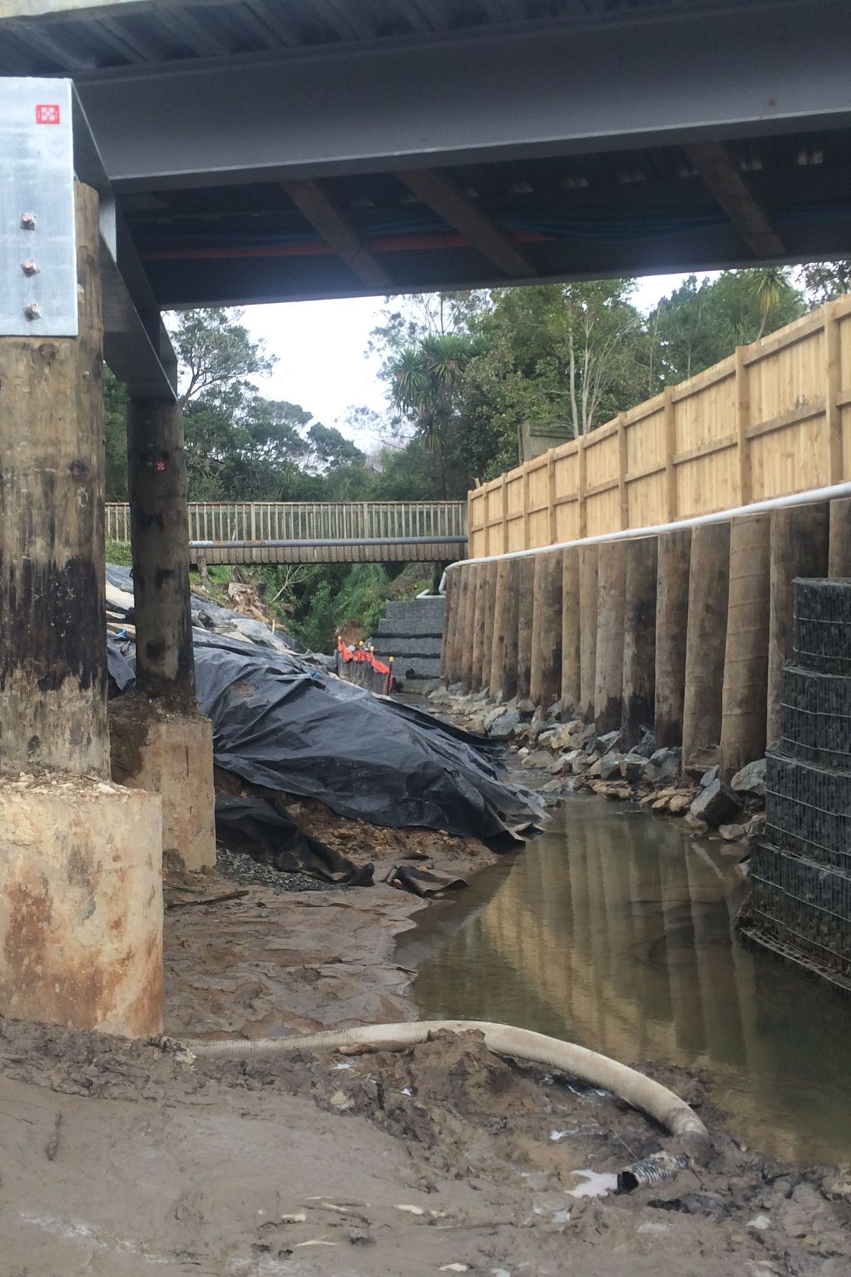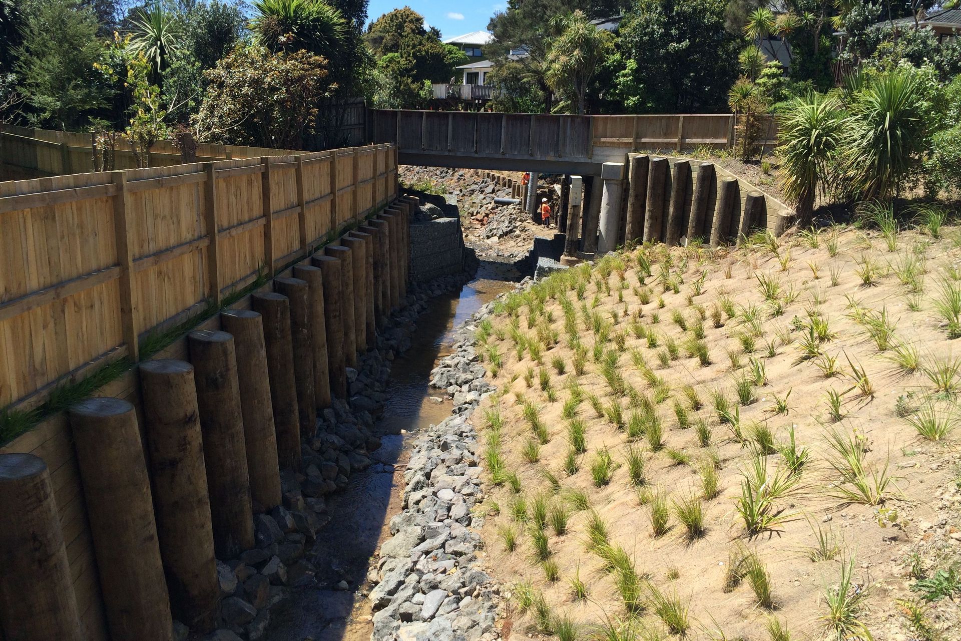 ArchiPro Project Summary - Rehabilitation of Kahika Stream in Birkdale with innovative retaining structures and expert geotechnical supervision to address river bank subsidence and enhance environmental aesthetics.